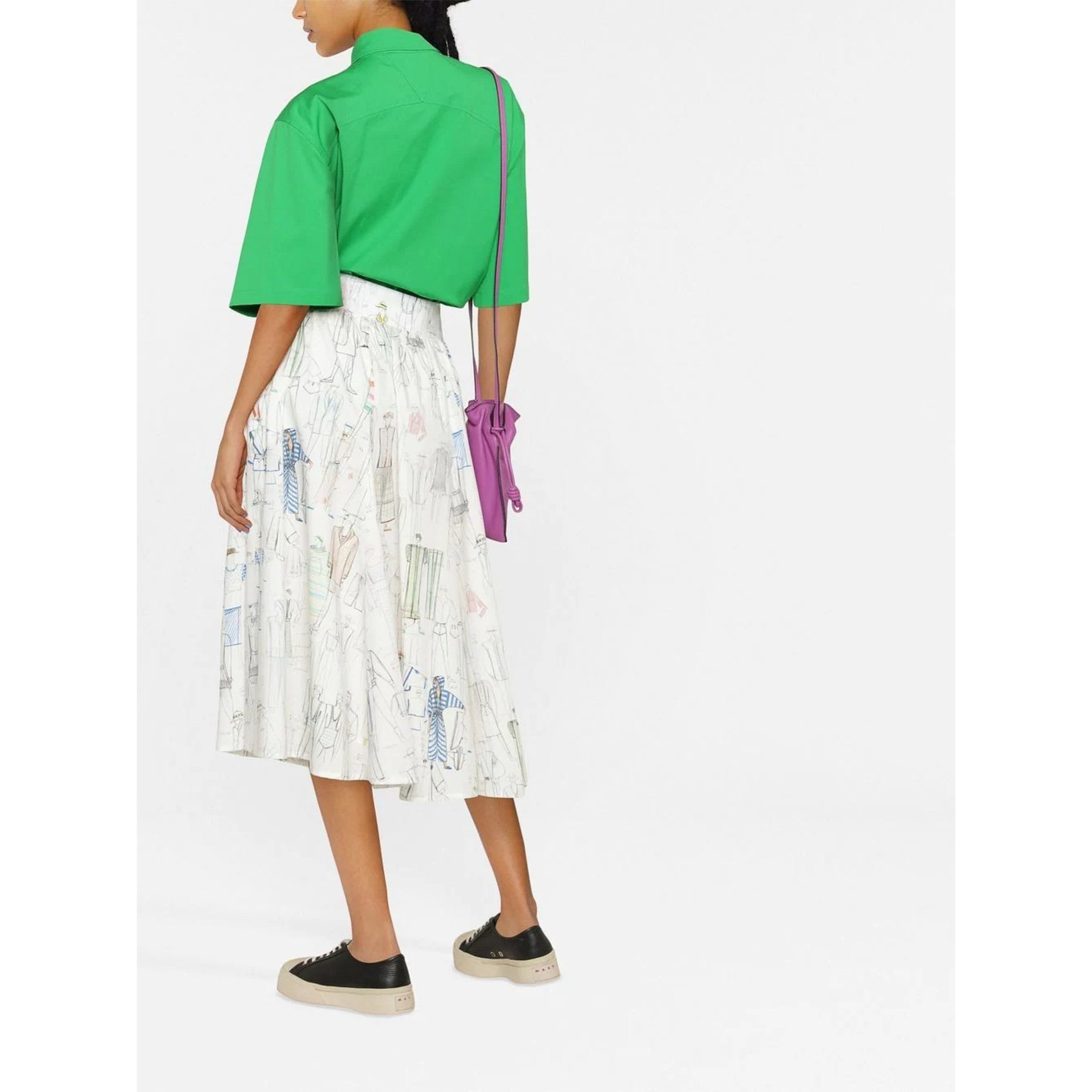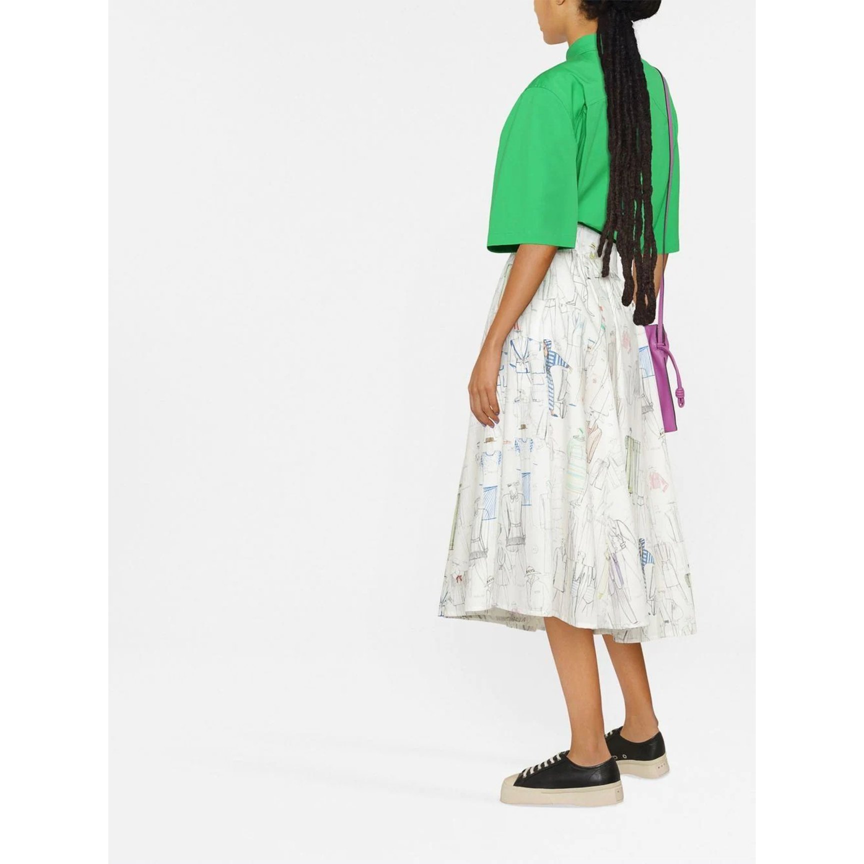 洋服のスケッチパターンがプリントされた「ケンゾー(KENZO)」のスカート。他にはないアイデアが息づく唯一無二なデザインです。マルチカラーながら、ベースがホワイトなので幅広いカラーのトップスともマッチします。