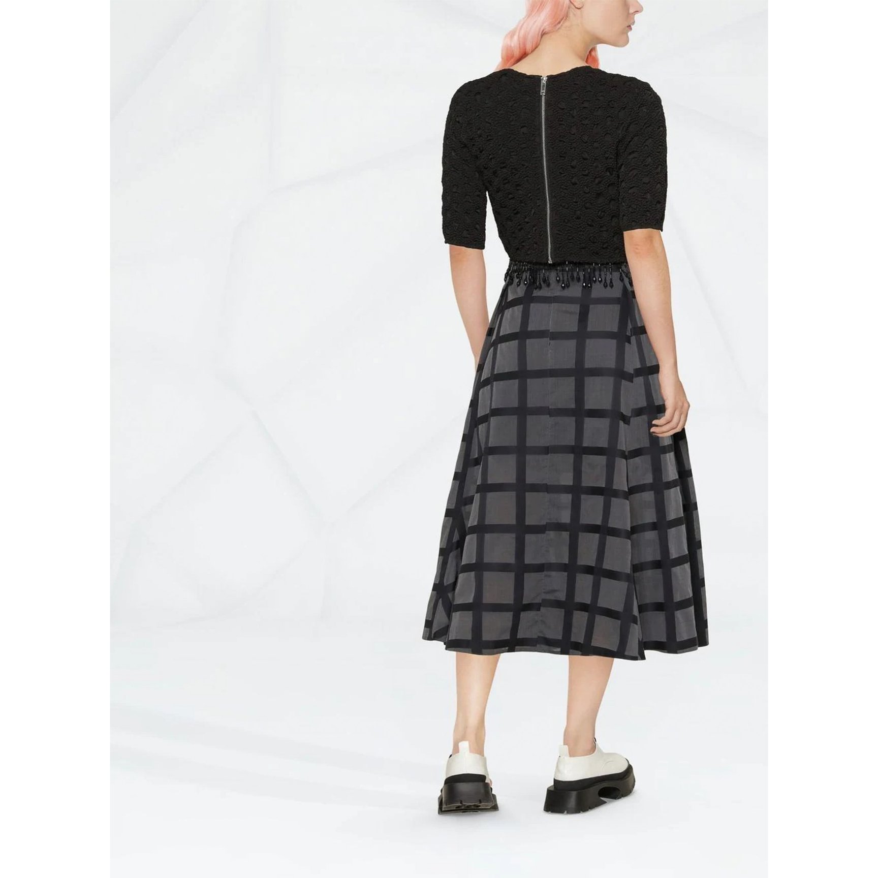 グレーのボディにブラックのラインが響くチェック柄スカート。こちらはドイツ発のファッションブランド「ステファン・シュナイダー(Stephan Schneider)」のもの。Aラインのシルエットが、装いを美しく仕立ててくれます。