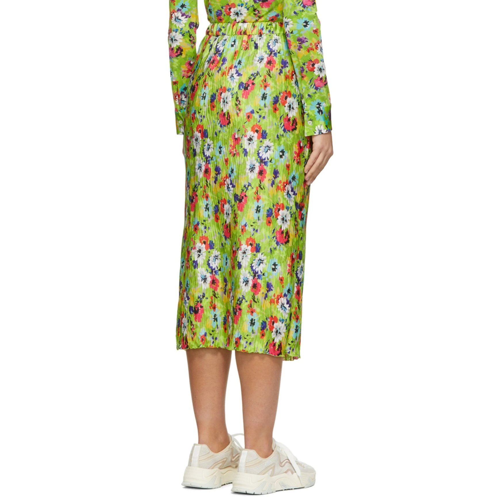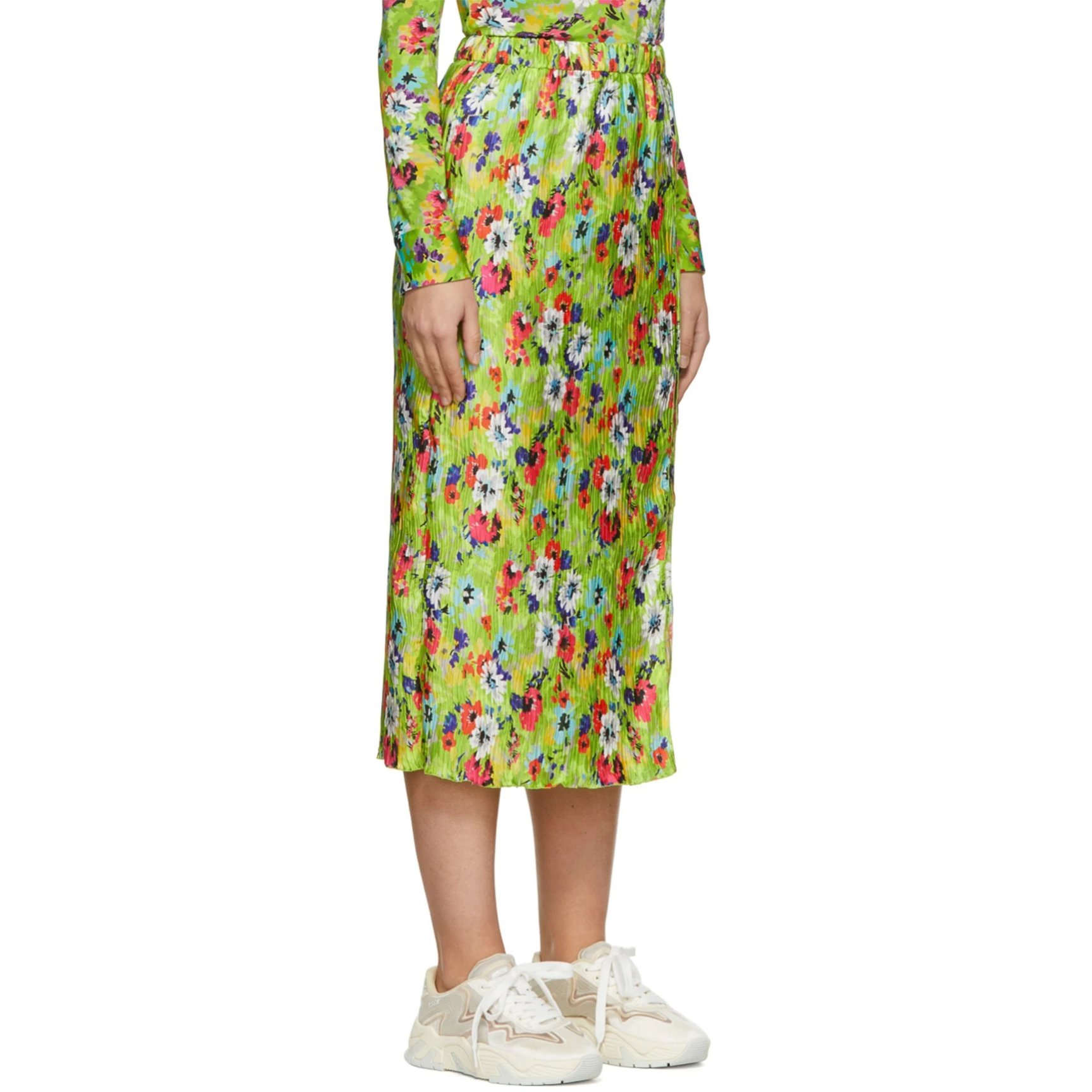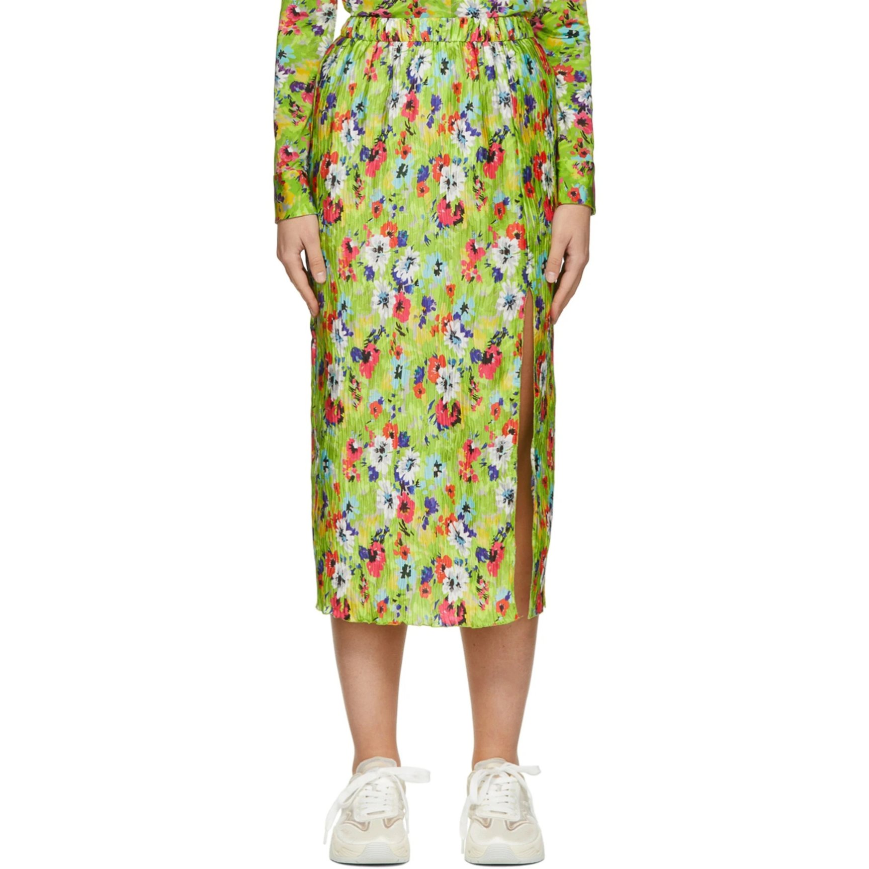 鮮やかなグリーンをベースに、色とりどりの花柄がプリントされた「エムエスジーエム(MSGM)」のスカート。サイドスリットが入っているので、愛らしさと大人の女性らしさが同居したデザインが楽しめます。