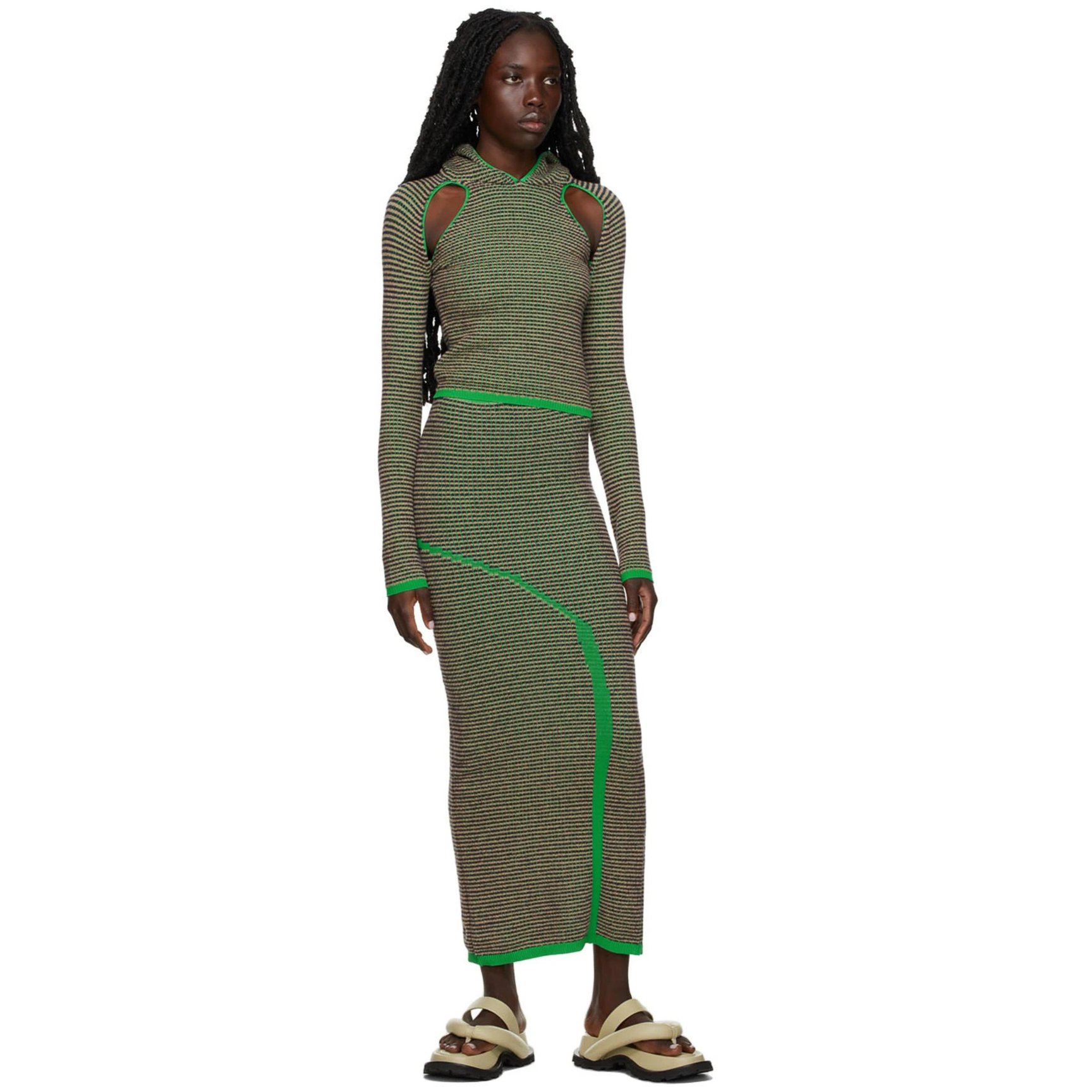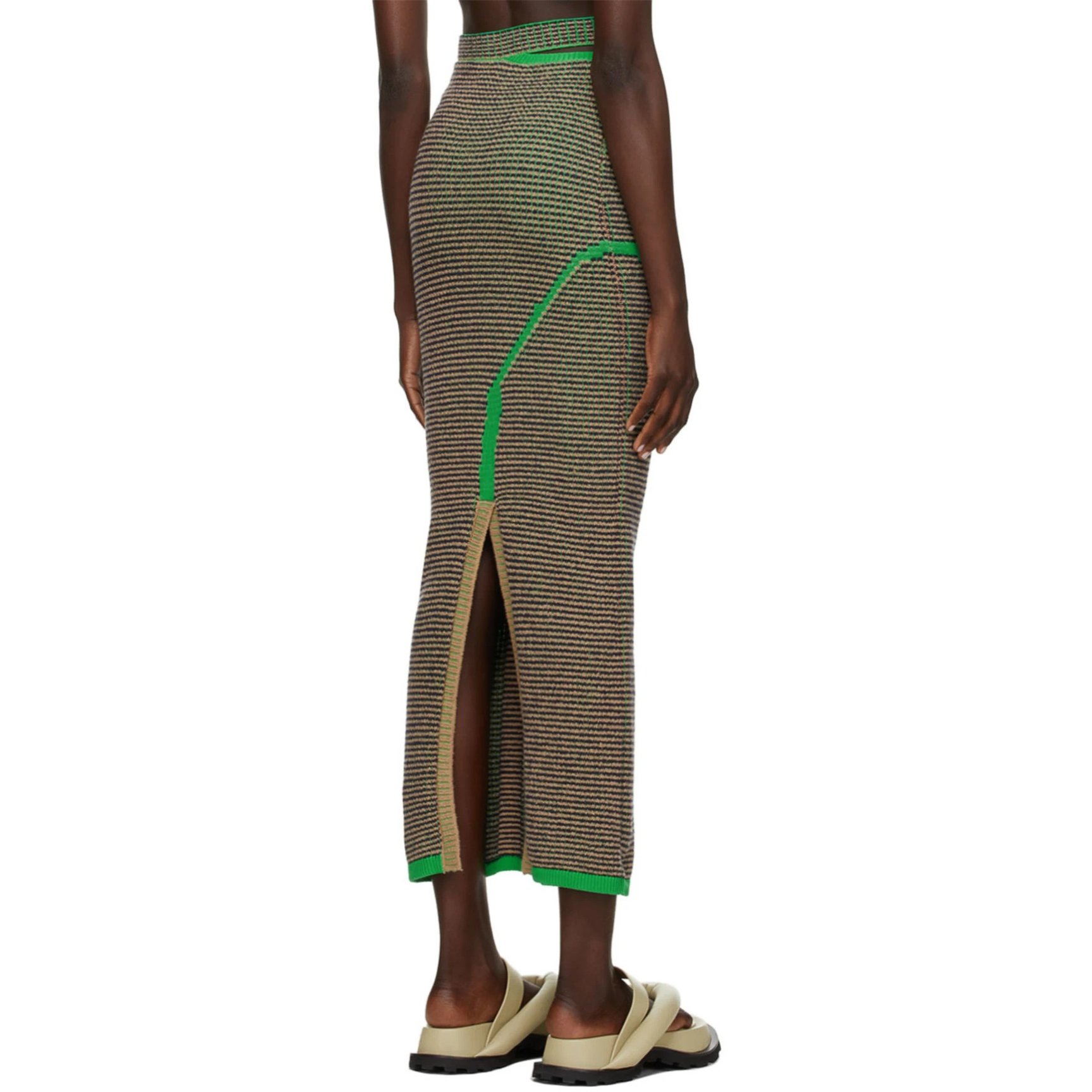グリーンのジャガード編みボーダーがモダンな「エコーズ ラッタ(ECKHAUS LATTA)」のニットスカート。カットアウトデザインの入ったウエストや、グリーンのトリムがコーディネートを小粋に彩ります。
