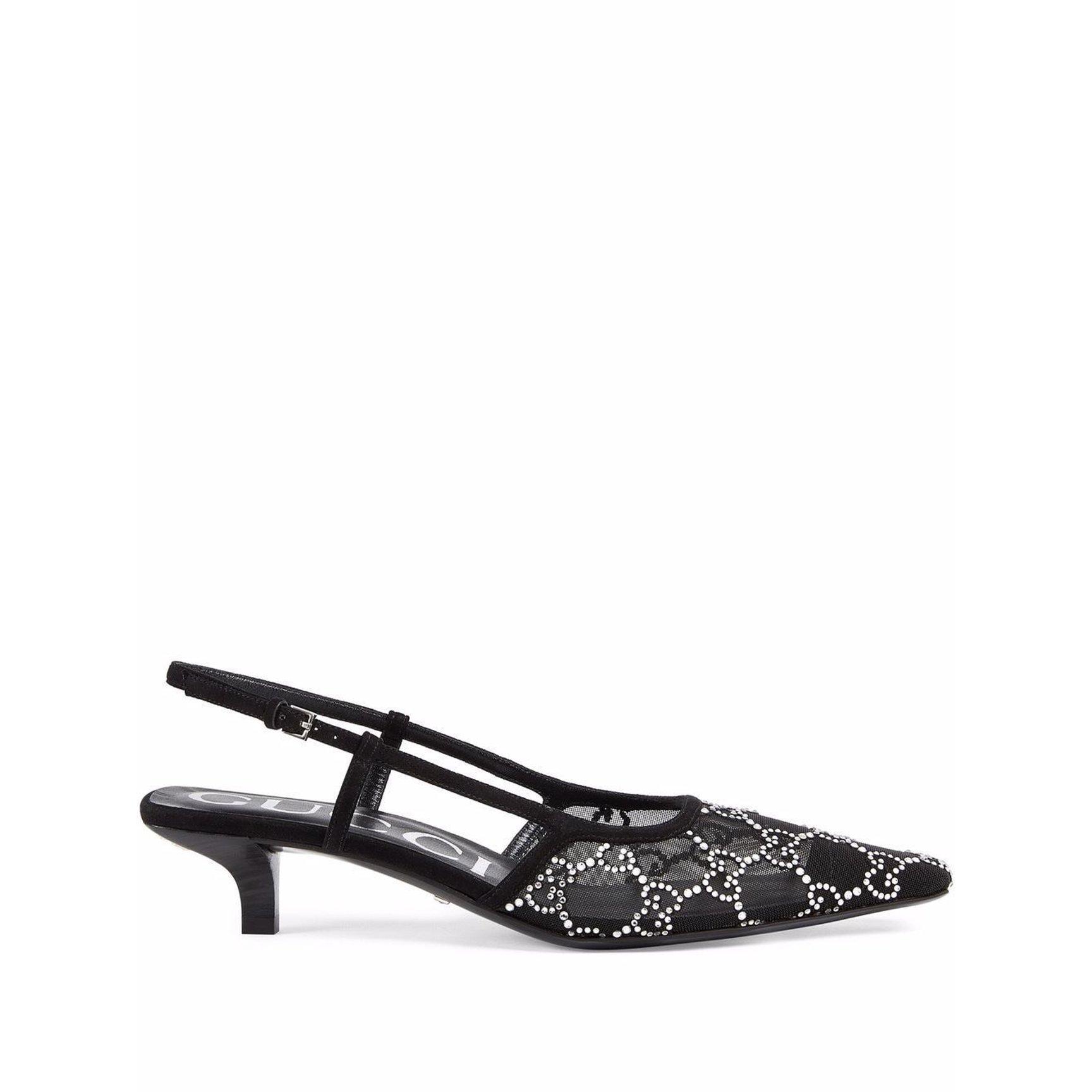 涼し気なメッシュのアッパーに、GGパターンを施した「グッチ(GUCCI)」のスリングバックパンプス。かかとをサポートするバックル式のベルトは調節が可能で、トリムにはドレッシーなスエードを採用。夏の夜を楽しむおでかけにもぴったりです。