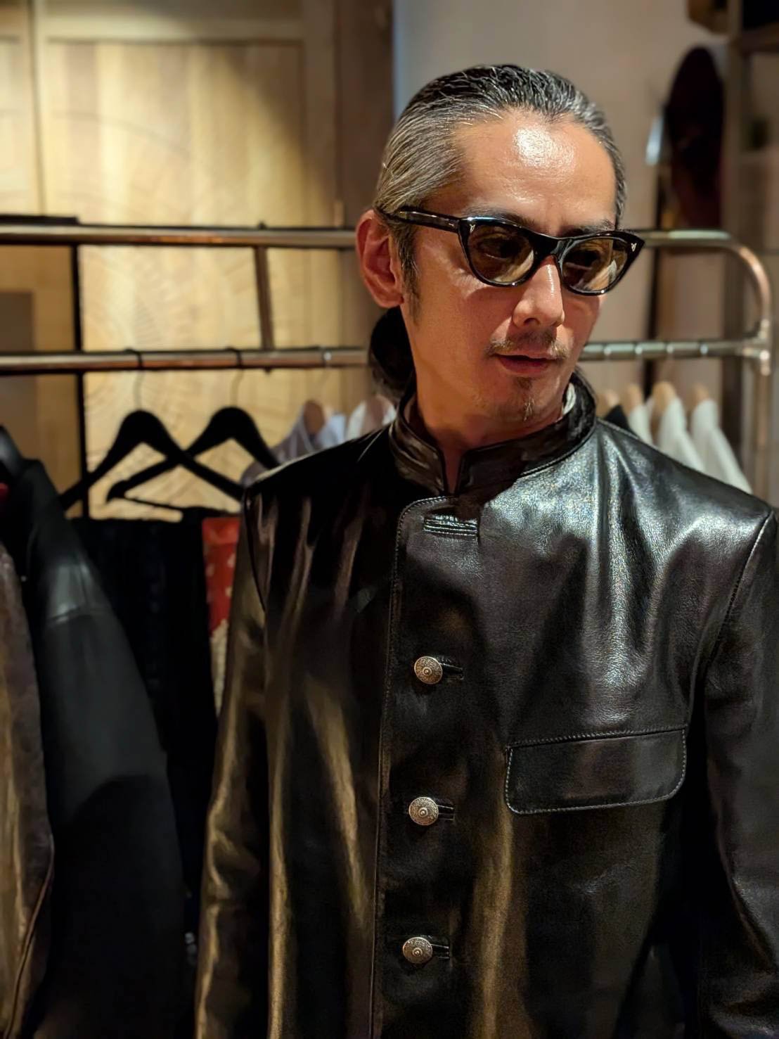 SOLAKZADE®︎ORIGINALのホースレザージャケット。ボタンは純銀製。店の扉の模様をあしらっている。眼鏡も弟の竜による完全ハンドメイドの一本。