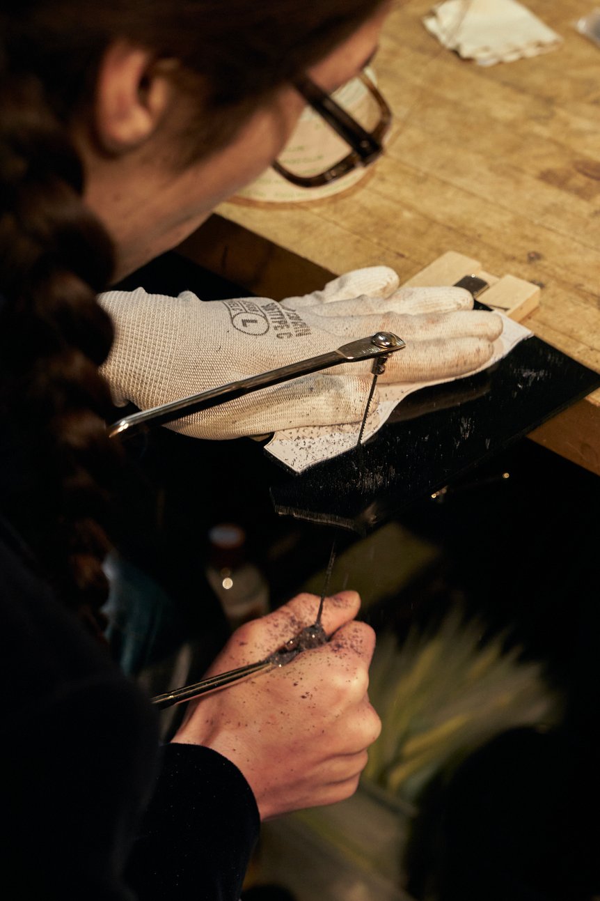 龍允:めちゃめちゃ育てています。最終的にシンプルな丸メガネに行き着くとして、最後は、誰に作ってもらうかが重要じゃないですか。そして、目の前の、かっこよくて、いいやつで、人間的にははみ出し者で手に負えないところもあるけど、最高の仕事をしてくれるような人間的魅力に溢れた職人が作ることに意味がある。昔の職人さんたちは、専門学校ではなく、師弟関係で育った人たちだったから。うちの店にもピュアでいいやつがたくさんいるので、そういうやつらの活躍の場をもっと作りたい。うちにはいろいろなバックボーンの人間が入ってきますが、昔から、ソラックザーデでは最初の3ヶ月間は修行をして、実際に一通りメガネが作れるようになるまでは人前に立たせないという伝統があります。技術は弟を中心に僕たち2人で教えています。