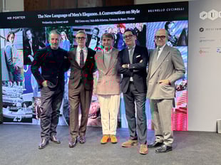 発表されたコレクションのタイトルは「IN FLORENCE」で、その根底に流れるのは、「ノスタルジア(郷愁)」という不可思議な感覚への問いかけ。大月が着目したのは、自身が実体験として持たない1980年代から90年代、すなわち日本のバブル期における「アルマーニ・スーツ」への熱狂である。当時、日本に大量に流入したイタリアン・テーラリングは、極東の島国という閉じた環境の中で独自の進化──いわば「ガラパゴス化」を遂げた。大月は、その歪みと情熱を孕んだ日本のスーツ文化を、今回テーラリングの聖地であるイタリアへと持ち込んだのだ(この行為を彼は「逆輸入」と呼ぶ)。それは西洋の規範に対する単なる模倣でも反抗でもなく、日本というフィルターを通した「カウンターポイント」としての提示であった。
