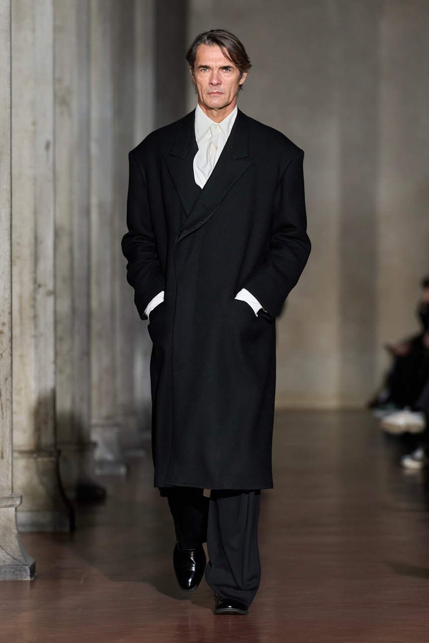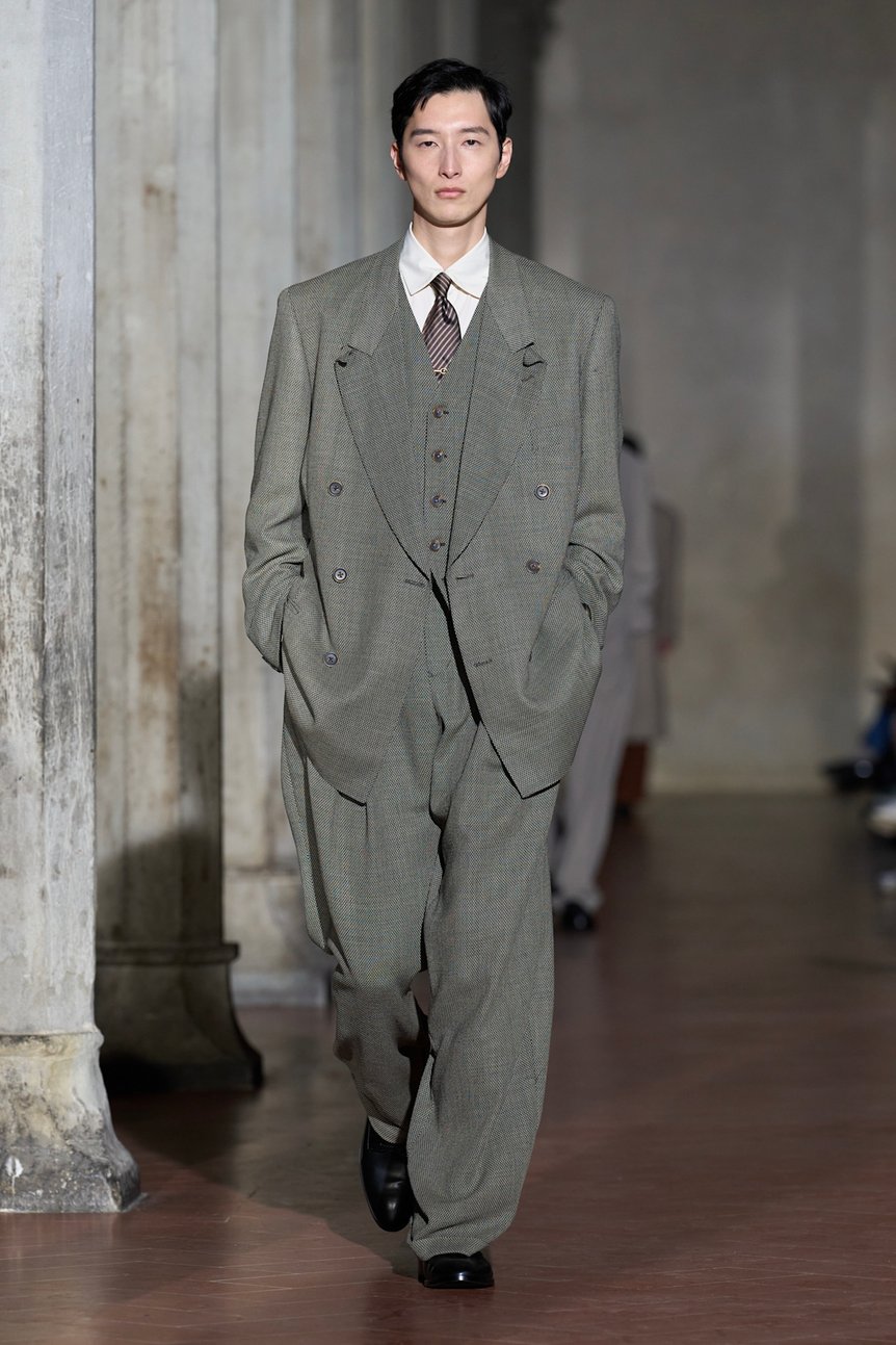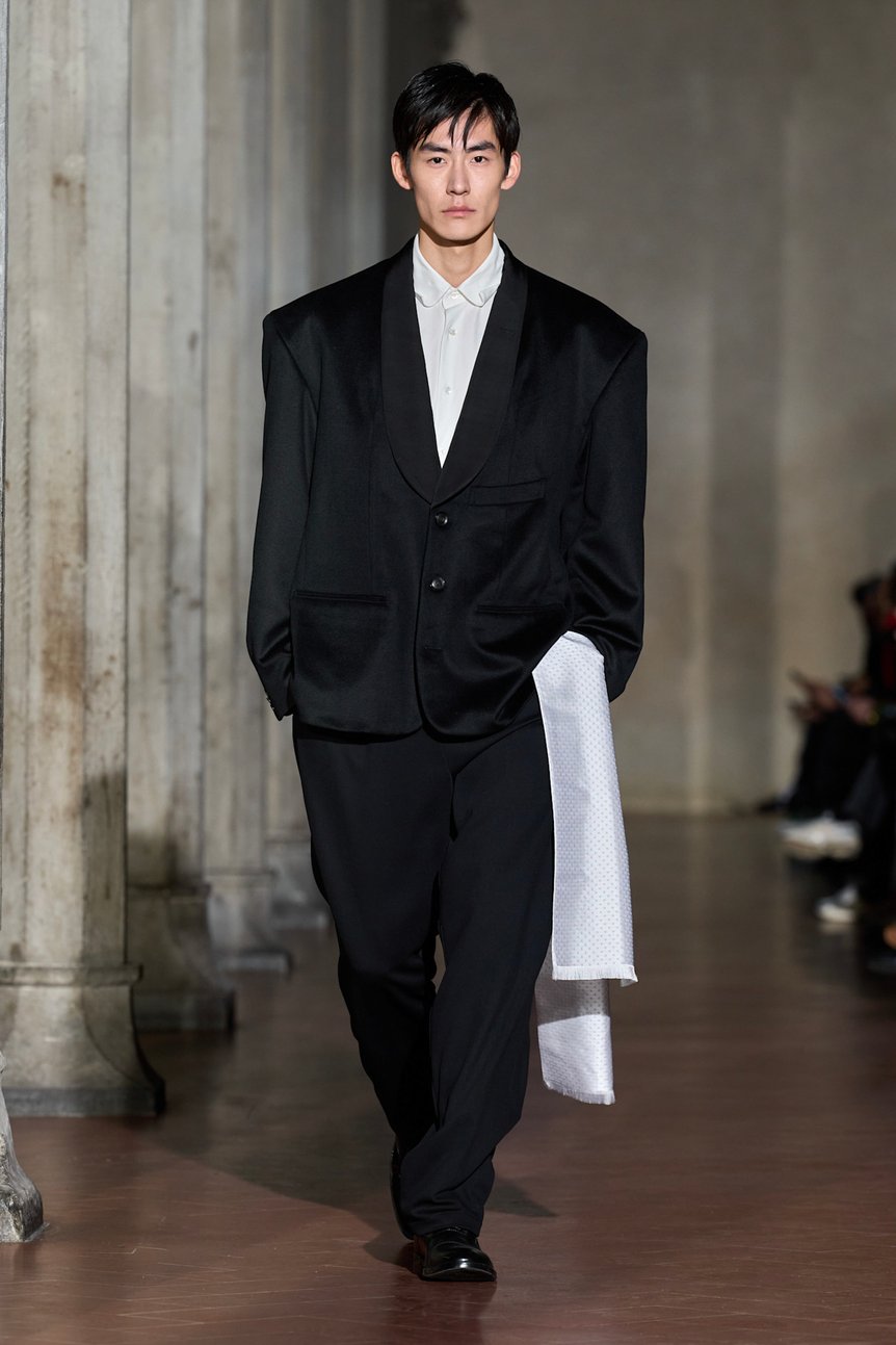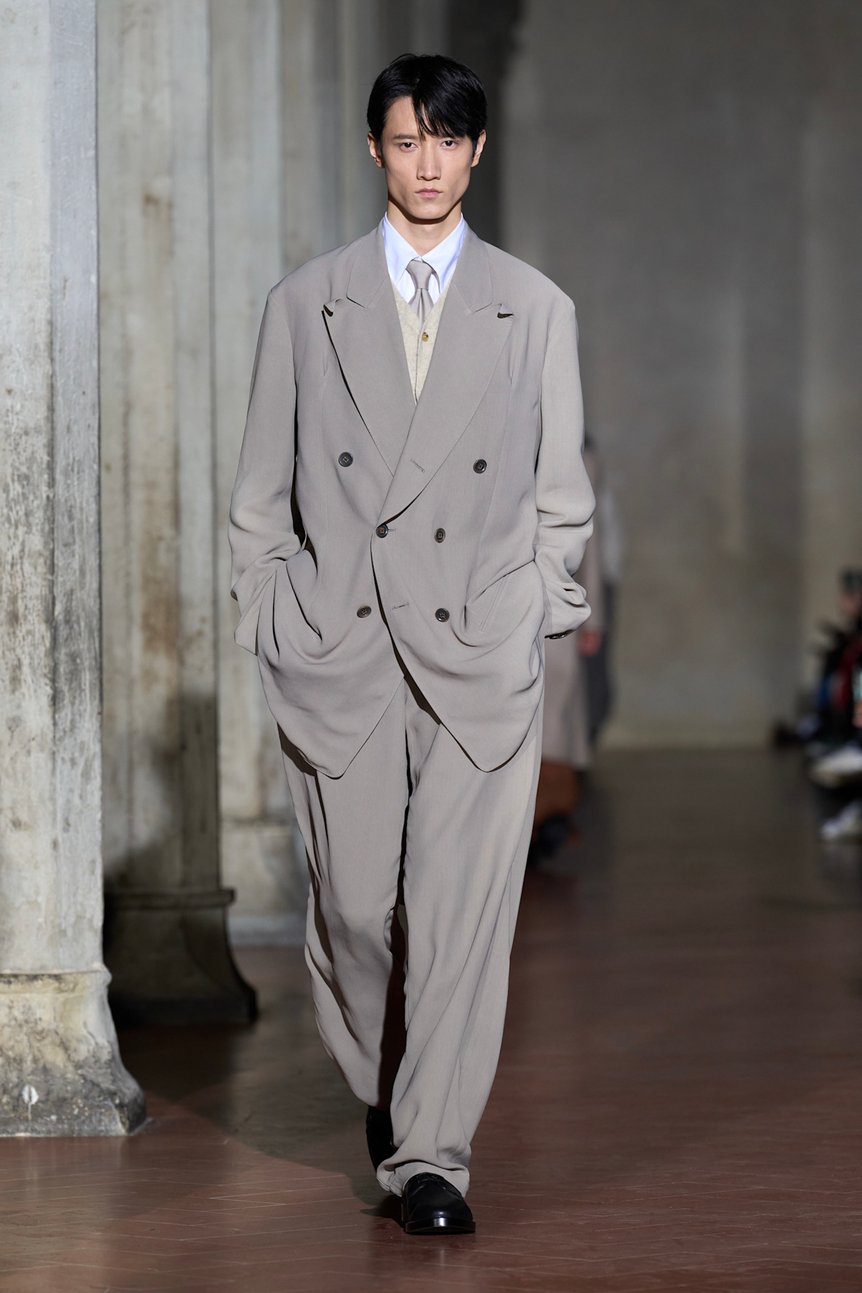 ショーの中盤、ジョルジオ・アルマーニ(Giorgio Armani)氏への憧憬を隠さない「イブニング」のルックが登場する。しかし、そこで提示されたのは、立体的な身体を包み込む柔らかなドレープではなく、どこか平面的で強さを持つシルエットだった。過剰な装飾や露骨な感情を削ぎ落とし、静謐(ひつ)かつ厳格に仕立てられたその服は、大月が語る「姿勢、決断、そして態度の蓄積によって形成されるアイデンティティ」を体現しているかのようだ。かつて日本人が憧れ、模倣し、独自に変形させた「イタリアン・テーラリング」。その憧憬を携えてフィレンツェの地に降り立ったソウシオオツキのコレクションは、単なる原点回帰ではない。それは、過去の亡霊を現代の技術と解釈で蘇らせ、未来のテーラリングの在り方を問う、静かなる「攪拌(かくはん)」であった。