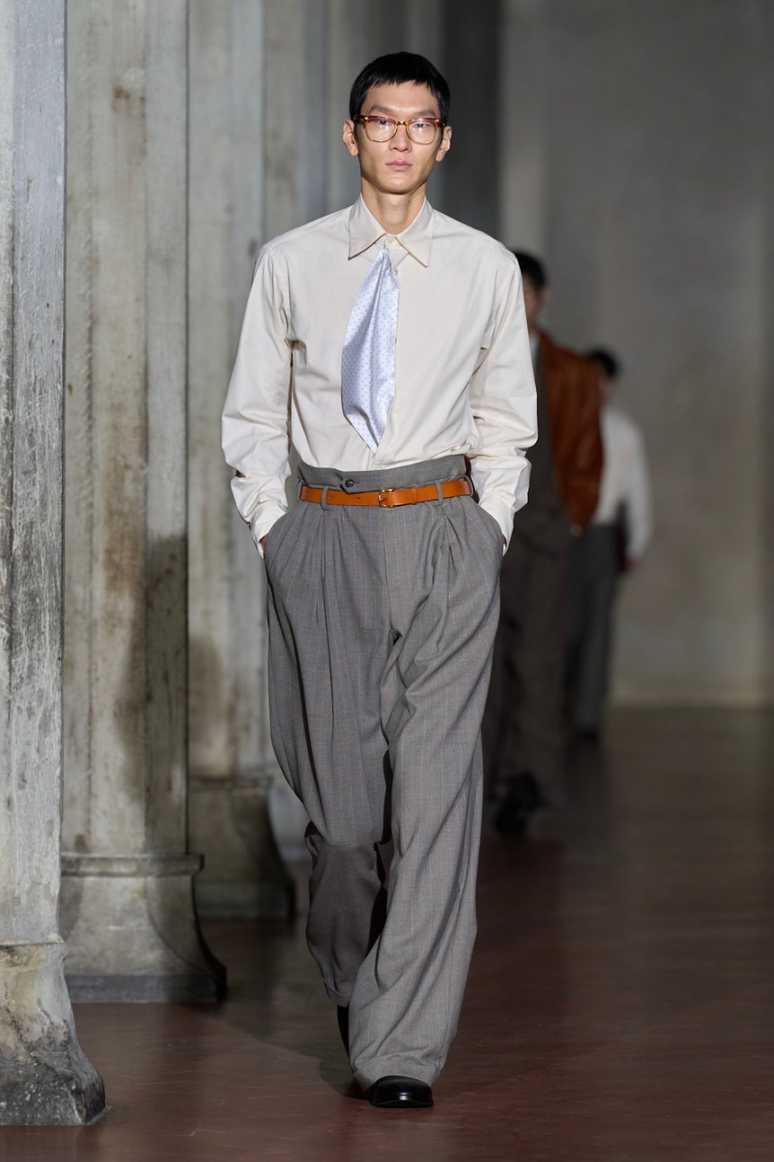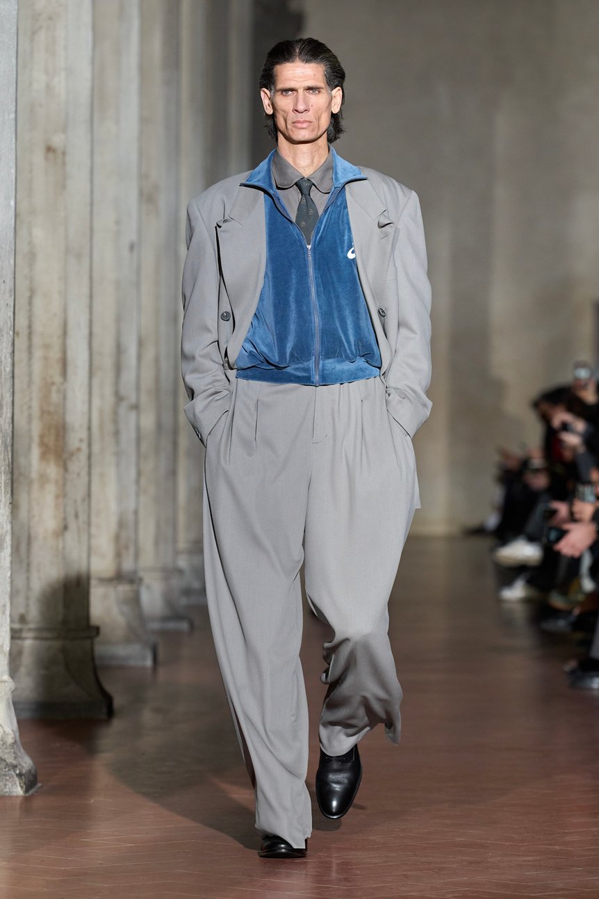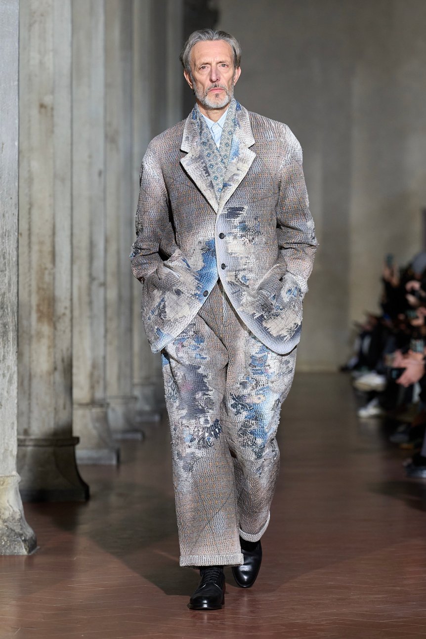 素材使いにおいても、重厚さと軽やかさが巧みに交錯する。肉厚なレザーや、裏地にシアリングを配したジャケットが冬の厳しさと高級感を演出する一方で、スポーティなフランネル素材が軽快なリズムを生む。特筆すべきは、今回発表された複数のコラボレーションが、テーラリングの文脈を拡張する装置として機能している点だ。「アシックス スポーツスタイル(ASICS SportStyle)」との協業によるジャージートップスは、構築的なジャケットのインナーとして差し込まれることで、クラシックな装いを現代のストリートやスポーツの領域へと引き寄せている。また、1896年創業の「グンゼ(GUNZE)」との肌着や、スペインのシャツメーカー「カミサス マノロ(CAMISAS MANOLO)」、そして古布と刺し子をアートへと昇華させる「プロレタ リ アート(PROLETA RE ART)」との共作は、歴史への敬意とアヴァンギャルドな実験精神が同居する、ブランドの多層的な視座を物語る。これらの要素は単なる「外し」ではなく、身体構造や機能性を再考するための必然的な実験として配置されている。