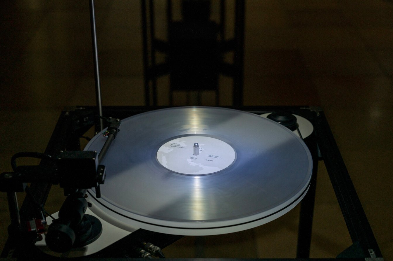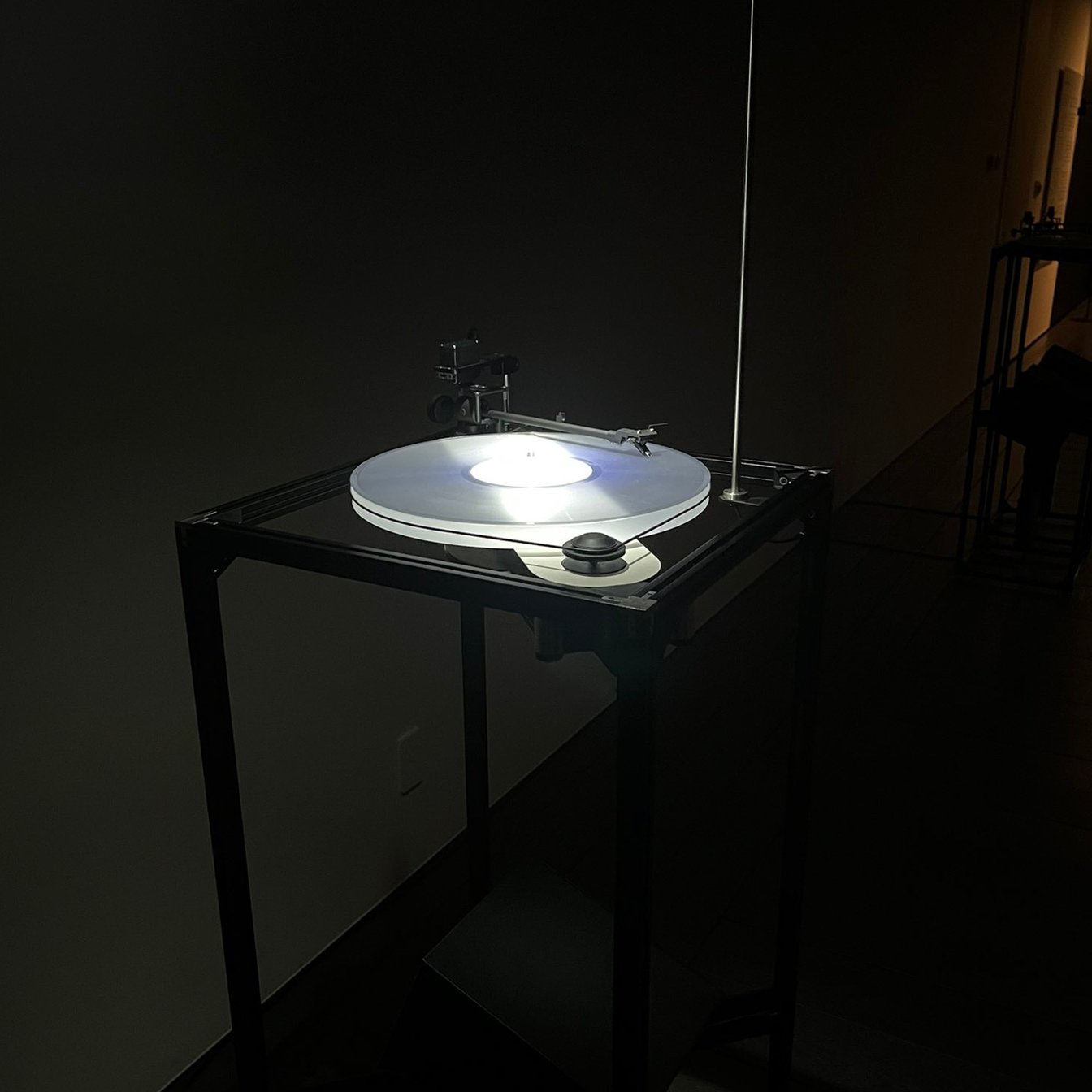 無機質かつハイテクノロジーな展示空間において、わざわざオールドメディアであるレコードを使っていることには意味があり、構造的なメッセージがあるだろう。そもそもこのコントラストにおいては、レコードというメディアはメタファー的意味が強く生じてしまうが故に、恐らくこれは安直な読みなのだ。だが実際に展示会場において、最初に目にするのはレコードプレイヤーであり、鑑賞者の意識に自然と強く作用しドラマトゥルギーとして機能してしまうのは避けられない。この展示空間そのものが一定の時間を刻むレコード(情報が書き込まれた媒体で、“誰か”にその情報が再生されることを前提としたもの)であり、北・東・南・西の方角に置かれた4台の高速回転する鏡は空間に流動性をもたらす。
