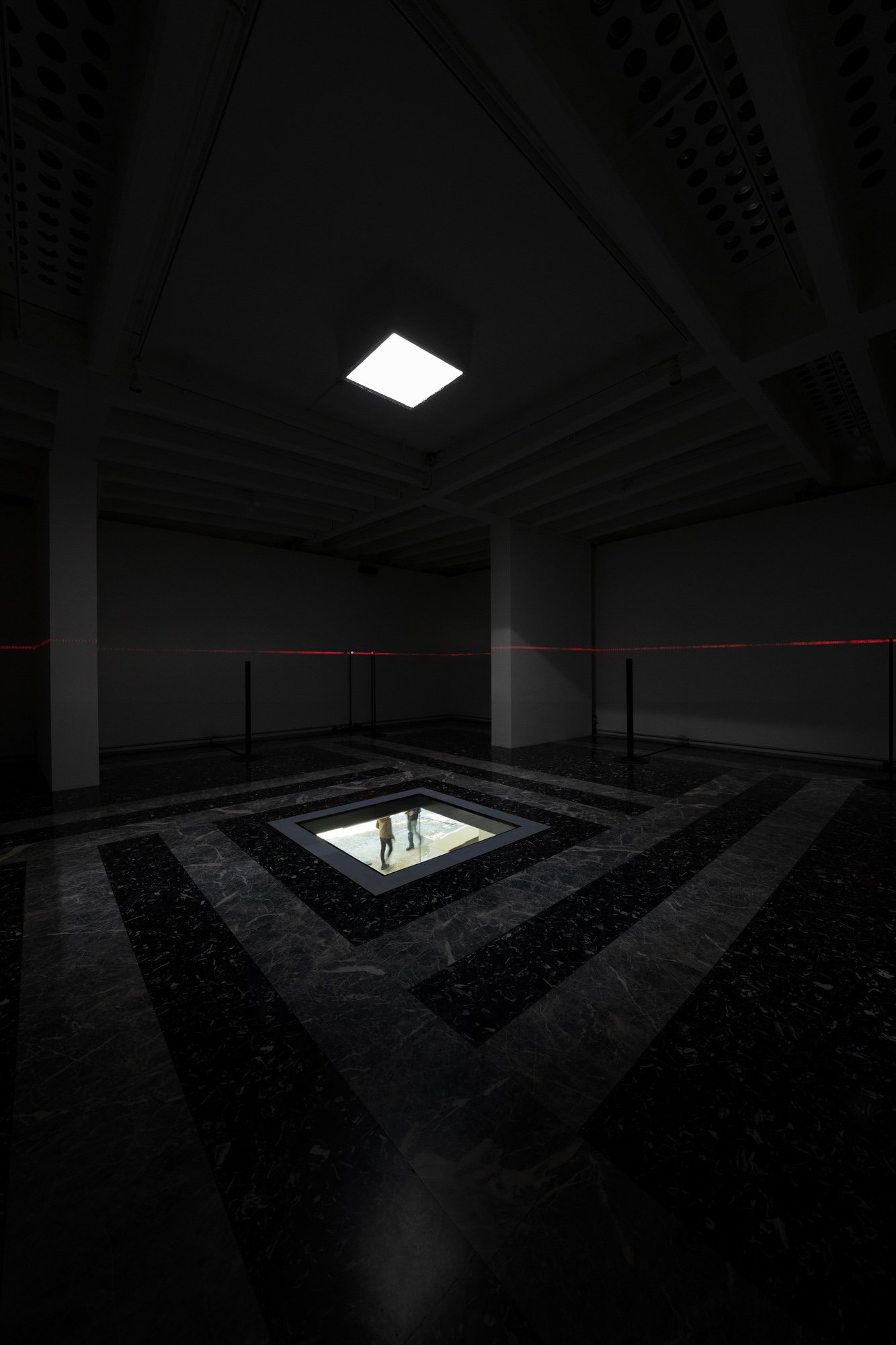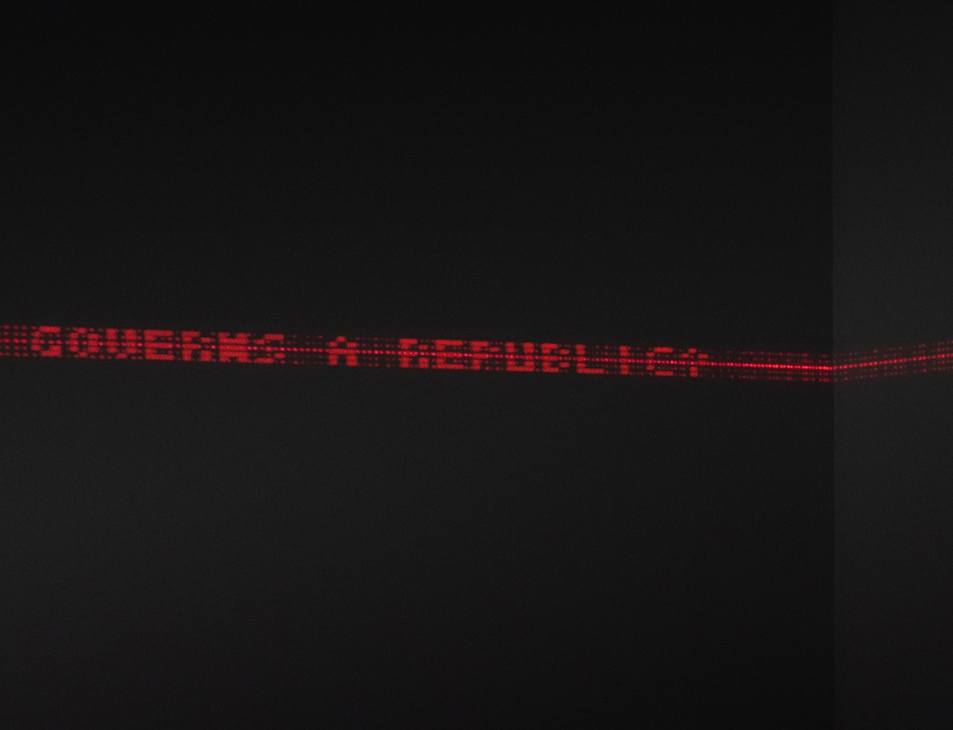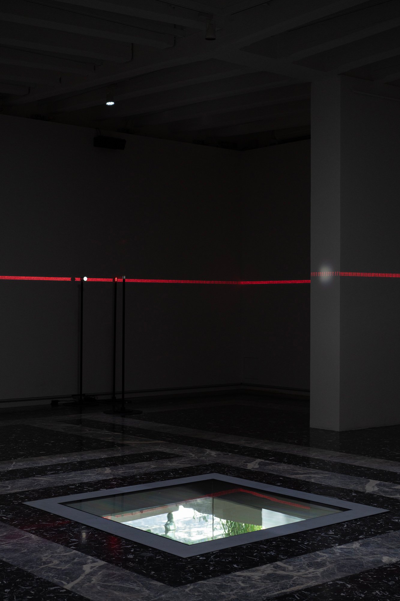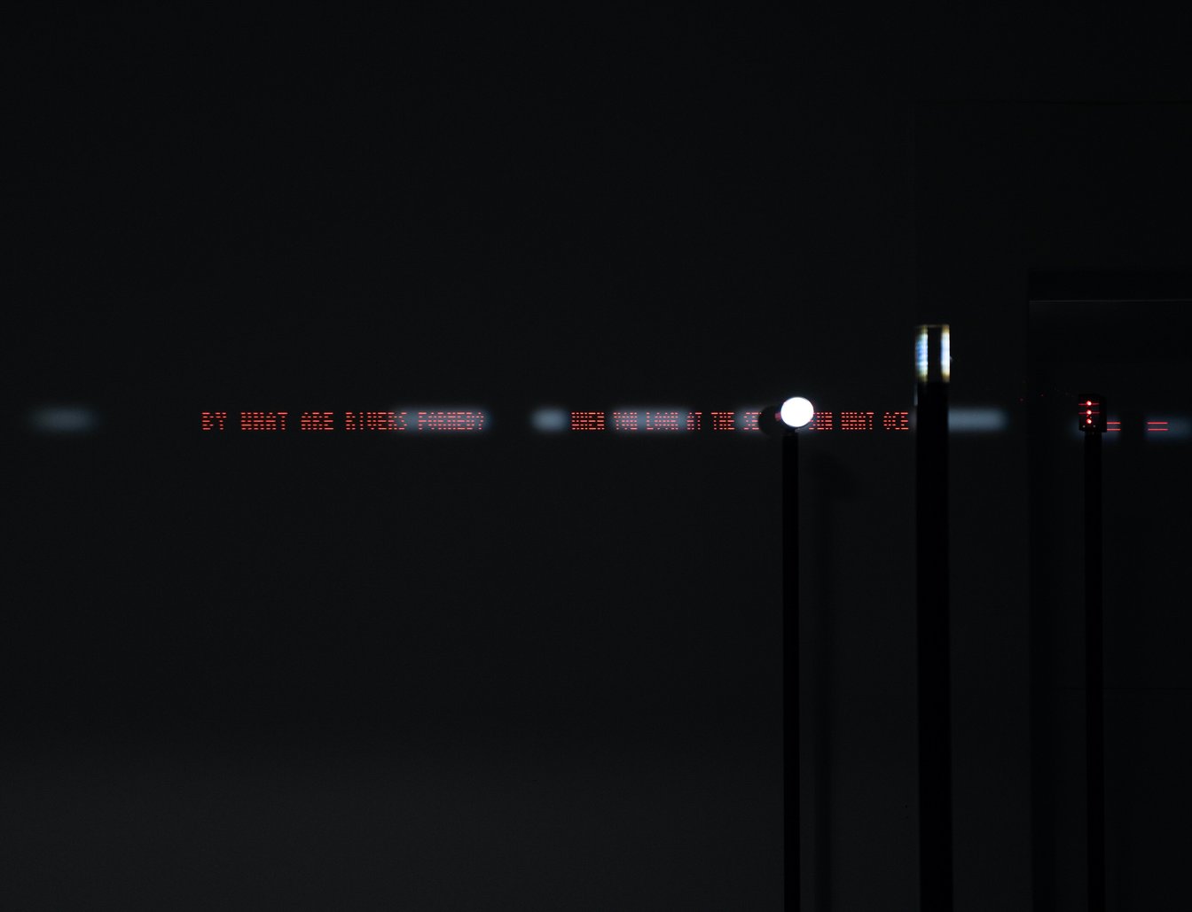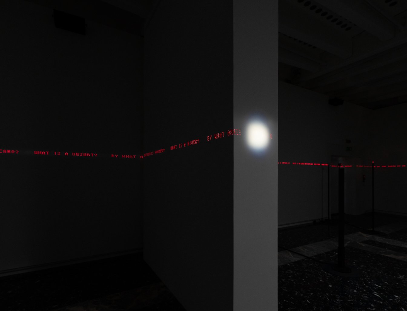 「日本館上階を90%の比率で模した展示室中央、その四方の壁に投影されるレーザー光は、中心から北・東・南・西の方角に置かれた4台の高速で回転する鏡によって反射されている。一秒間に12万2800回明滅する5本のレーザー光線は、6144個の点となってテキストをかたち作り、回転する超志向性スピーカーから流れる音声とともに、見えるか見えないか聴こえるか聴こえないかのはざまで、1850年代の地理の教科書から取られたシンプルで普遍的な問いを発している」
