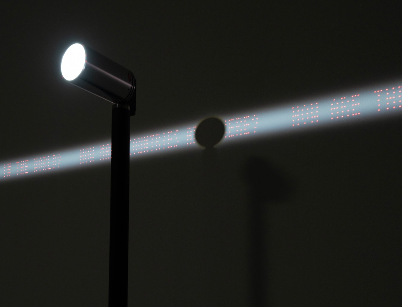 ところが、中心から四方の壁に照射される赤いドットの集合が書き出す殺伐とした問いに目を凝らしてみると、次第に私たち鑑賞者は狭い“ただの壁”に取り囲まれていることに気付かされる。その暗い展示室の壁の向こう側に広がる荒涼たる世界を想像したとき、筆者はポーランド出身のイギリスの小説家ジョゼフ・コンラッドが書いた「闇の奥」を想起した。私たち鑑賞者の眼と耳を、外へ向けるように促す遠心的な構造を持つこのインスタレーションは、同時に、中心に座する灰色の鏡の存在によって、私たちの意識を求心的に中心へ誘導し“今ここ”に留めようとする。その求心性は、展示空間の一番外側に点在するレコードプレイヤーというメディアの形式とも共鳴し、求心性をより強く暗示する。というのも、レコードの特性上「回転するレコードの溝に導かれる針」は時間的座標を示し続け、求心的かる単線的に時間が進行していくものだからだ。それはまるで人間の「意識の流れ」と相似であり、また無機的なものに対してこのような感覚を抱いてしまったことに、独特の違和感を覚えた。