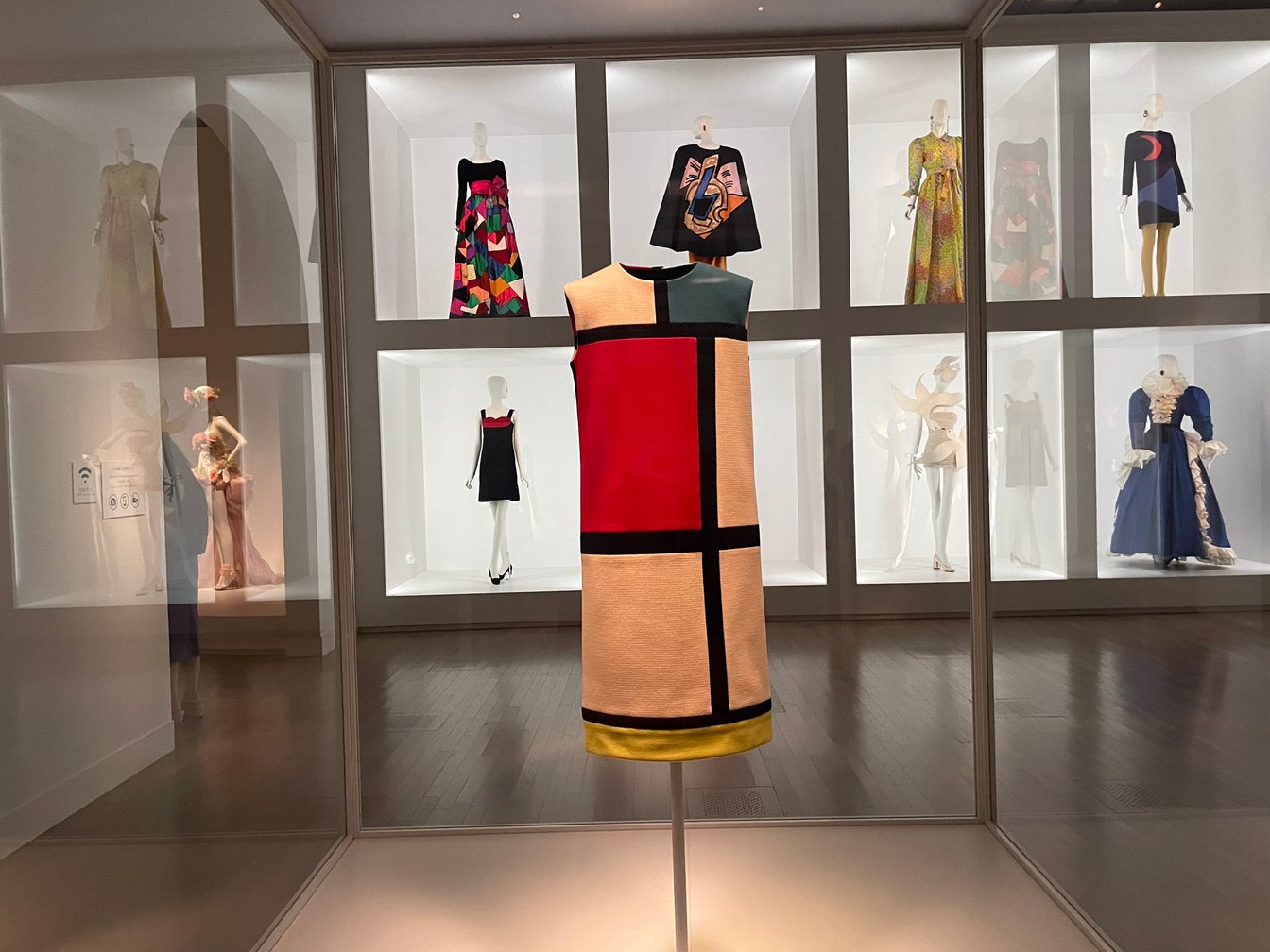 故に規範意識が漂う中心的なルックを外していき、イヴ・サンローラン個別のスタイルを浮彫にしていこうと思う。例えば、有名なトラペーズ・ラインは、ディオールの後継としての規範性が色濃くあり、ディオールが軸とした形態を中心とする美学の中で作られている。またトレンドをダイレクトに反映した代名詞サファリルック、ジャンプスーツ、タキシードといったルックたちも時代から自立的ではないという意味で、ほとんど中心的なものではなくなる。代わりに注目すべきものは、芸術家へのオマージュのシリーズと服飾の歴史をレファレンスしたシリーズ、また展覧会では紹介されていなかったが、1966年にオープンしたプレタポルテのブティック「サンローランリヴ・ゴーシュ」(以下、リヴ・ゴーシュ)の存在も非常に重要なものになると考える。