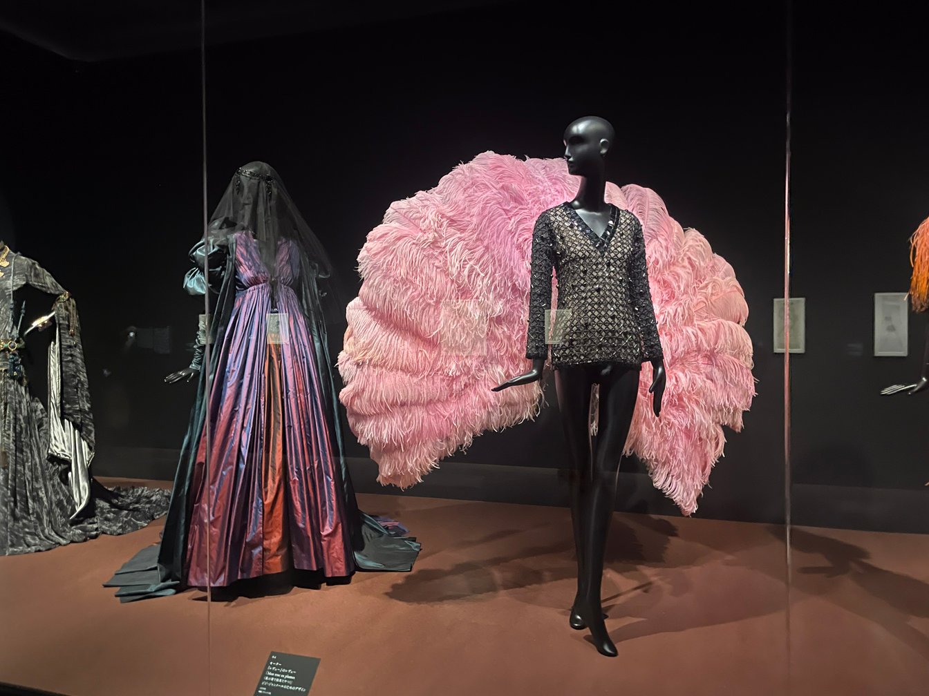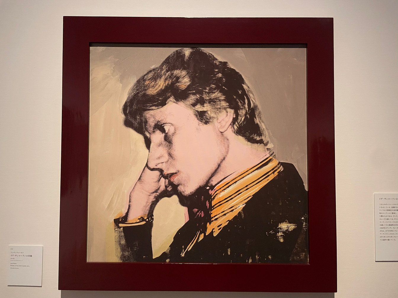 展示全体の構成は非常にシンプルで標準的なものとなっており、細かに区切られた章立てのもと、順繰りにサンローランの仕事を網羅的に巡るもの。マネキンに衣服を着せ、ガラスケースに衣服やジュエリーを飾り、関連資料を什器に入れて随所に配置し、極めて一般的な博物館キャビネットのような様相で、どちらかと言えば「歴史的事象をなぞる」という印象を覚えた。同展の序章にあたる「第0章」で、イヴ・サンローランの人生へフォーカスしていたのに対し、それ以外の章で展示されている衣服やジュエリーらとのコントラストが強いことも非常に気になった。イヴ・サンローランがその人生において纏ったスター性に焦点を合わせるポートレートの連続で始まるこの展覧会は、時代によって生み出された「イヴ・サンローラン」のアイコニックなスター的イメージを最初に最大化し、それをまず否応なしに観客へ印象付ける。この第一印象はなかなか強烈なものがあり、筆者は観覧中終始抜けることがなかった。これはイヴ・サンローランをどのように見せたいかという主催者の意図に関わると思うが、いずれにしても、構成的にサンローランの芸能的なポートレートがパッケージとしてあり、その内容物として衣服などがあるような、やや世俗的な構図になっていると感じられた。ただ筆者としては、もう少し踏み込んだ記述を試みたいので、ここからはあえて狭く切り取った視点を導入してみたい。