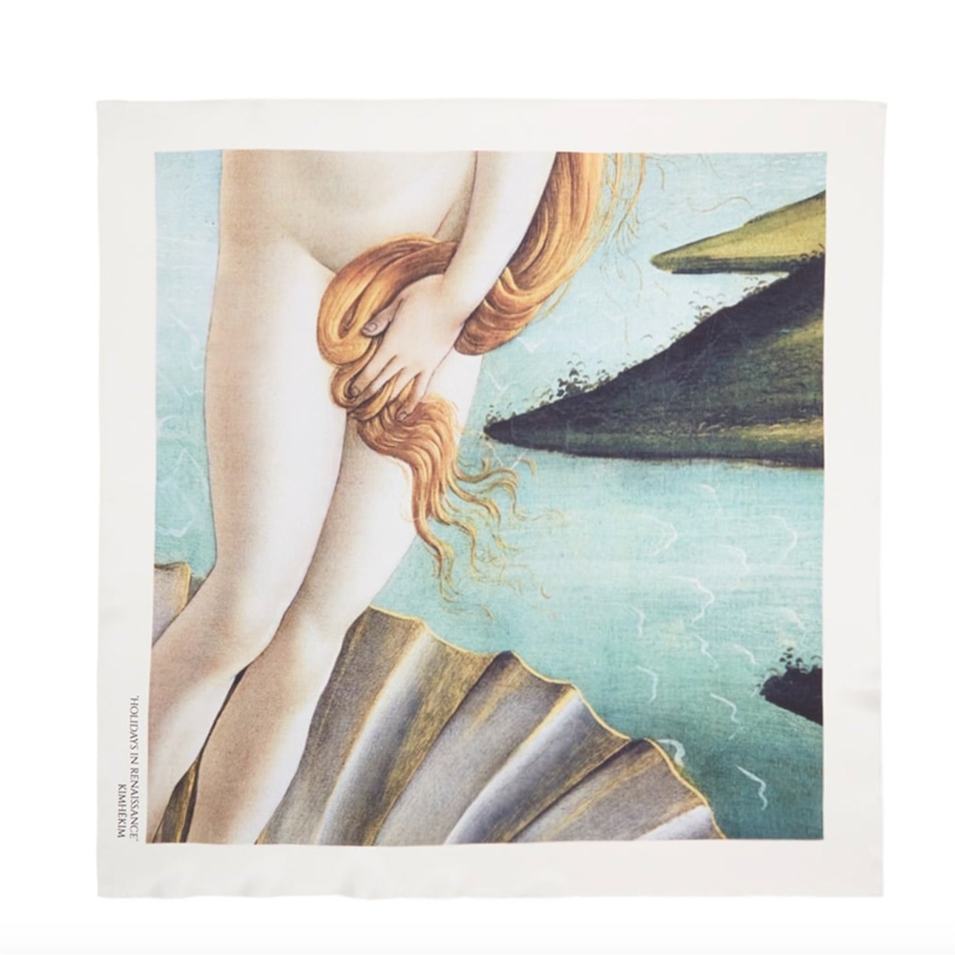 「キムヘキム(KIMHĒKIM)」のスカーフには誰もが知る名画、ボッティチェリのヴィーナスが。フォルムによって見える部位が変わるからこそ多様な表情を楽しめるスマートさと遊び心を兼ね揃えたプロダクトです。