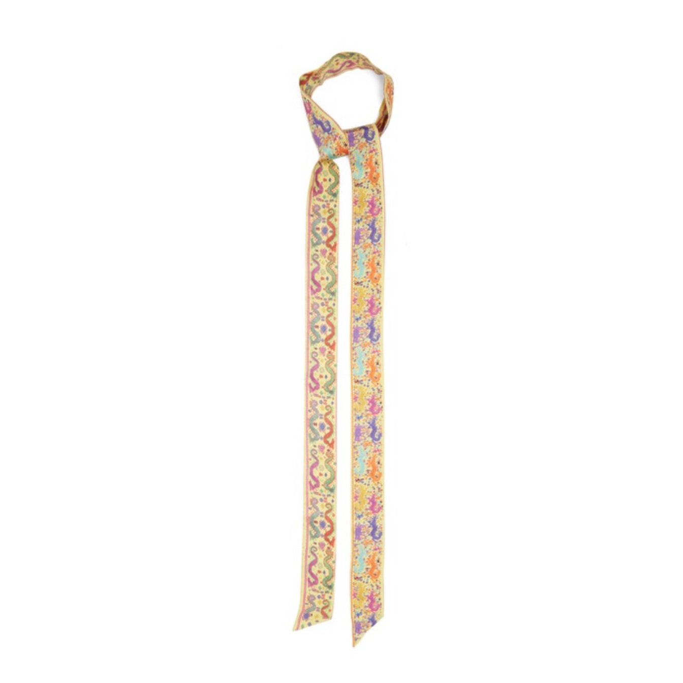 「エトロ(ETRO)」のタイスカーフは一見繊細なリボンのような繊細さですが、よく見てみるとテキスタイルには高貴でタフなモチーフのドラゴンとスネークのプリントが。創業者のアンティークテキスタイルのコレクションから着想を得たのだとか。