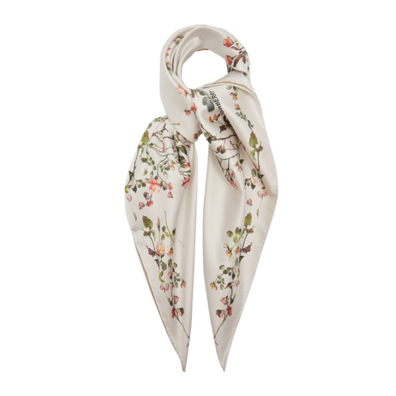 シンプルでスッキリ、上品でいるけれどどこか少女性とロマンチックさを兼ね揃えるこちらのスカーフは「バーバリー(BURBERRY)」のもの。薄手のシルクツイルは肌触りがよく、何歳になっても使用できるエフォートレスでピュアな美しさ。