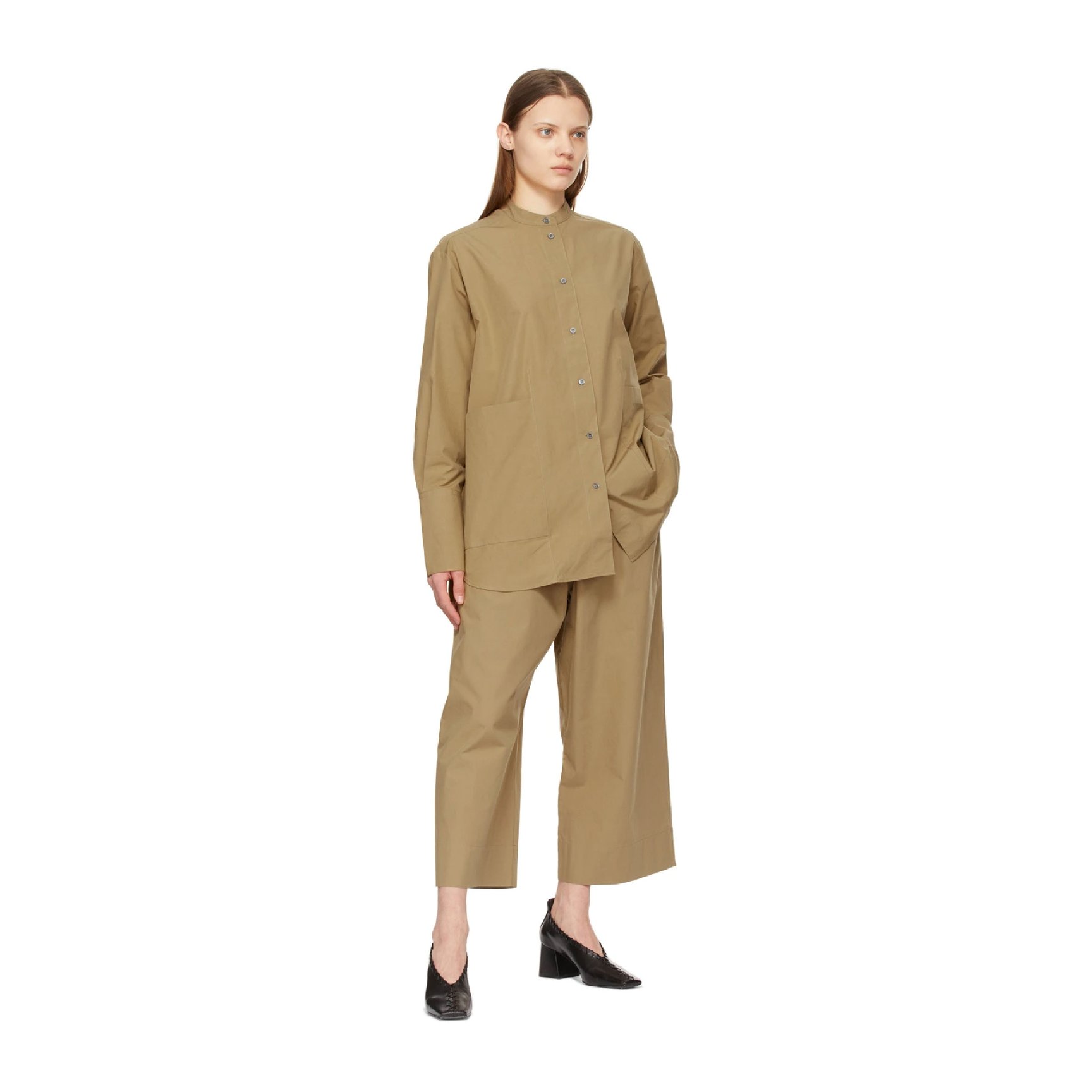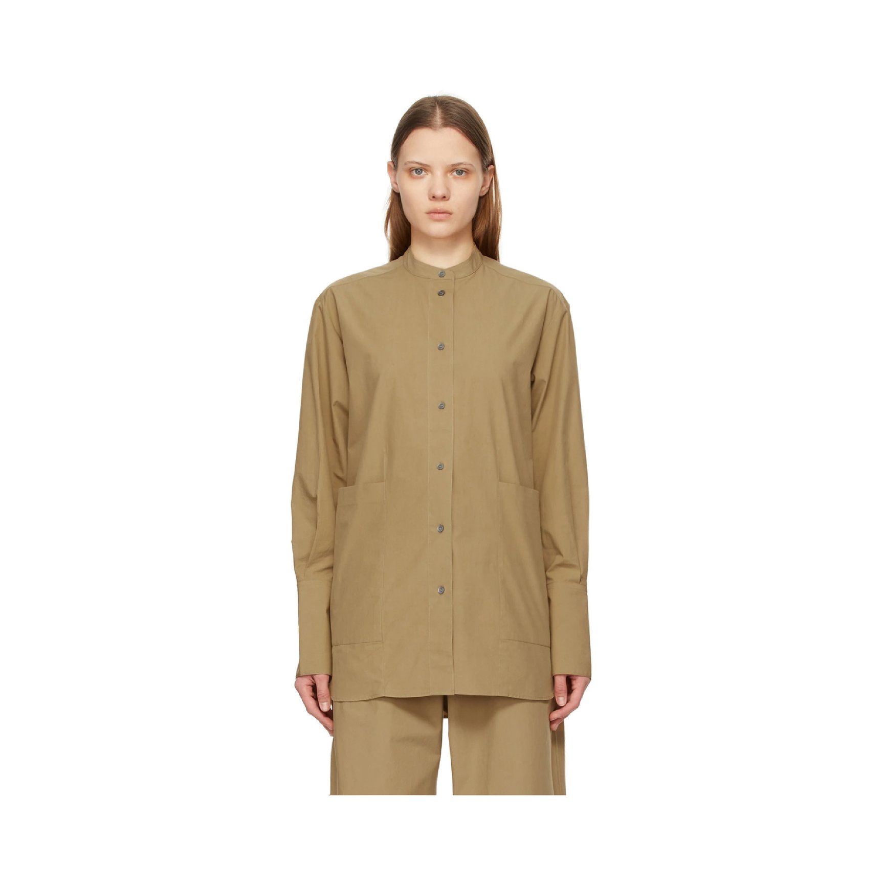 「スタジオ ニコルソン(STUDIO NICHOLSON)」のベージュシャツは、ノーカラーと大きめに配置されたポケットと身幅のバランスが、ゆるやかながらも洗練された印象に仕上げてくれます。
