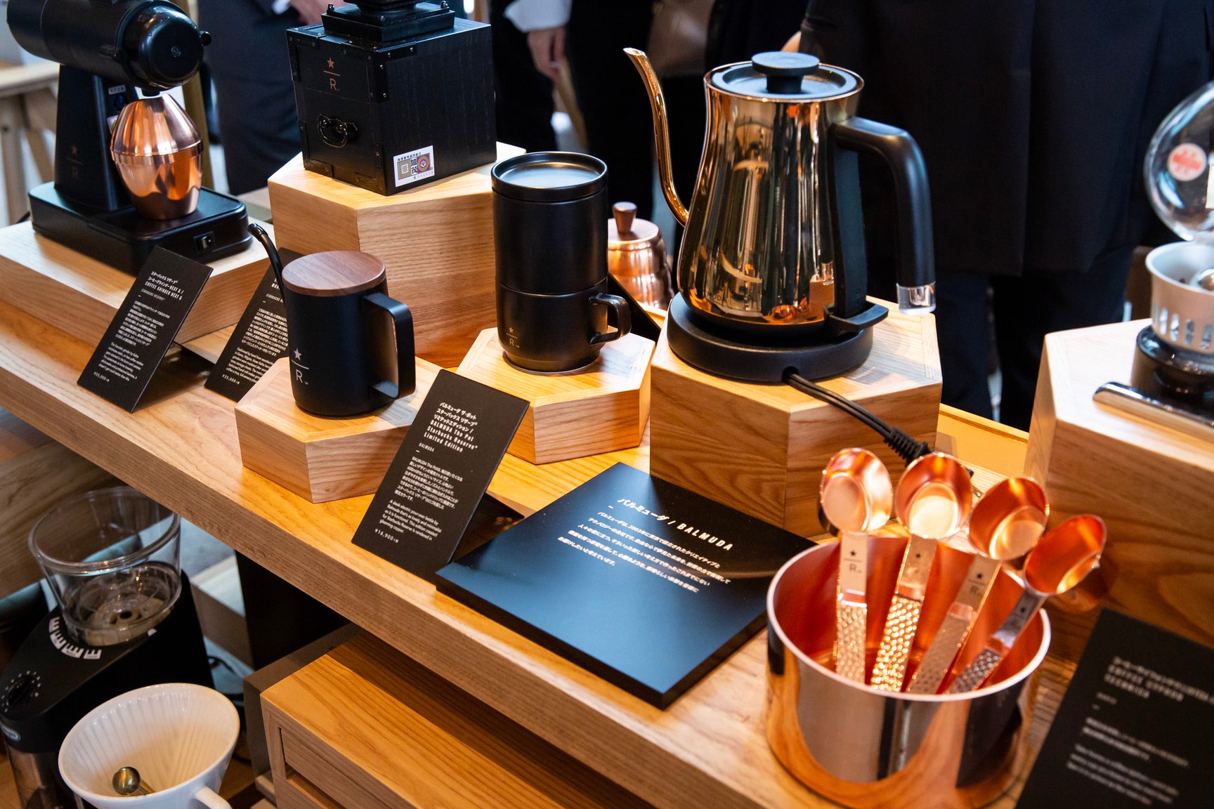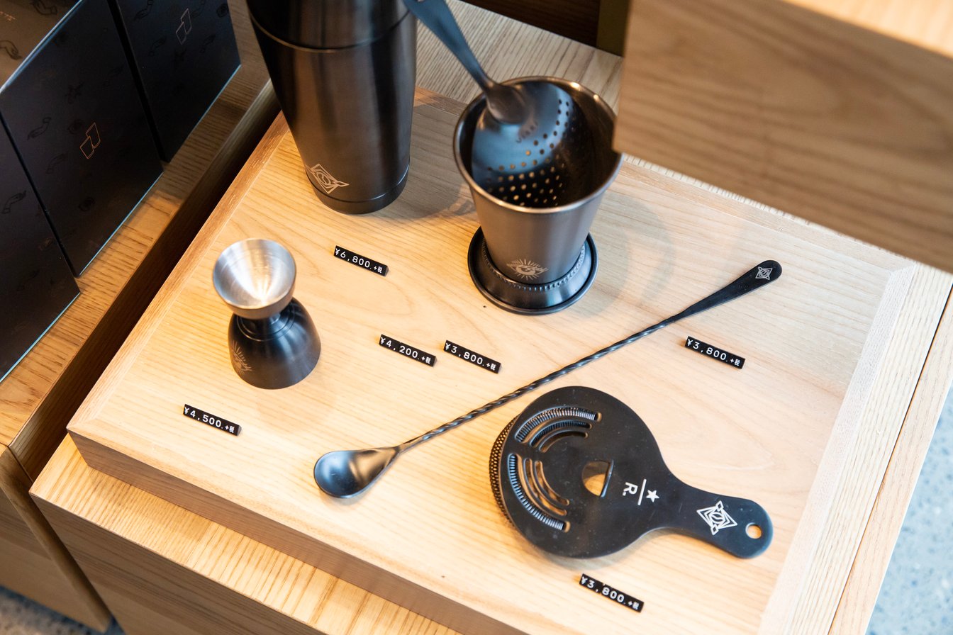 アリビアーモ™️ バーにちなみ、こちらのフロアでは「VISKI スターバックス リザーブ® ボストンシェーカー」(税別6800円)など、自宅でカクテルが作れるオリジナルグッズも販売。