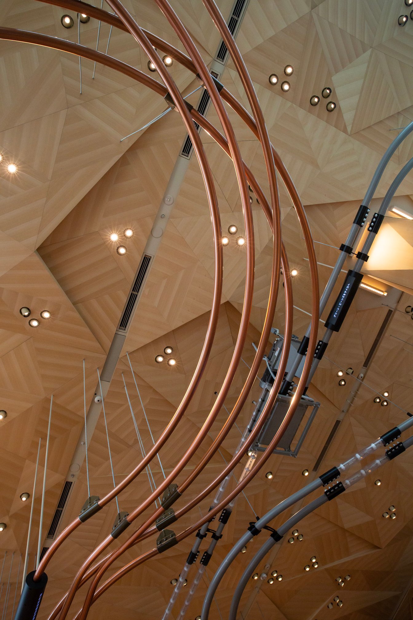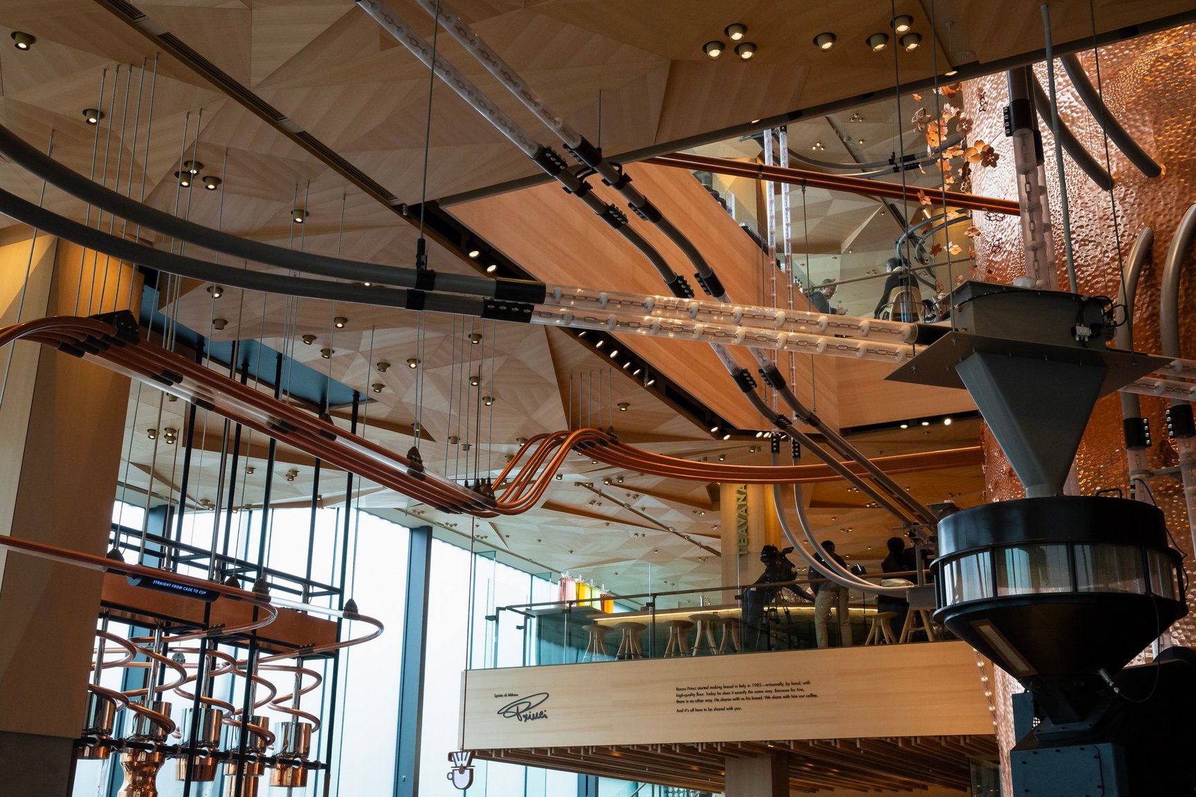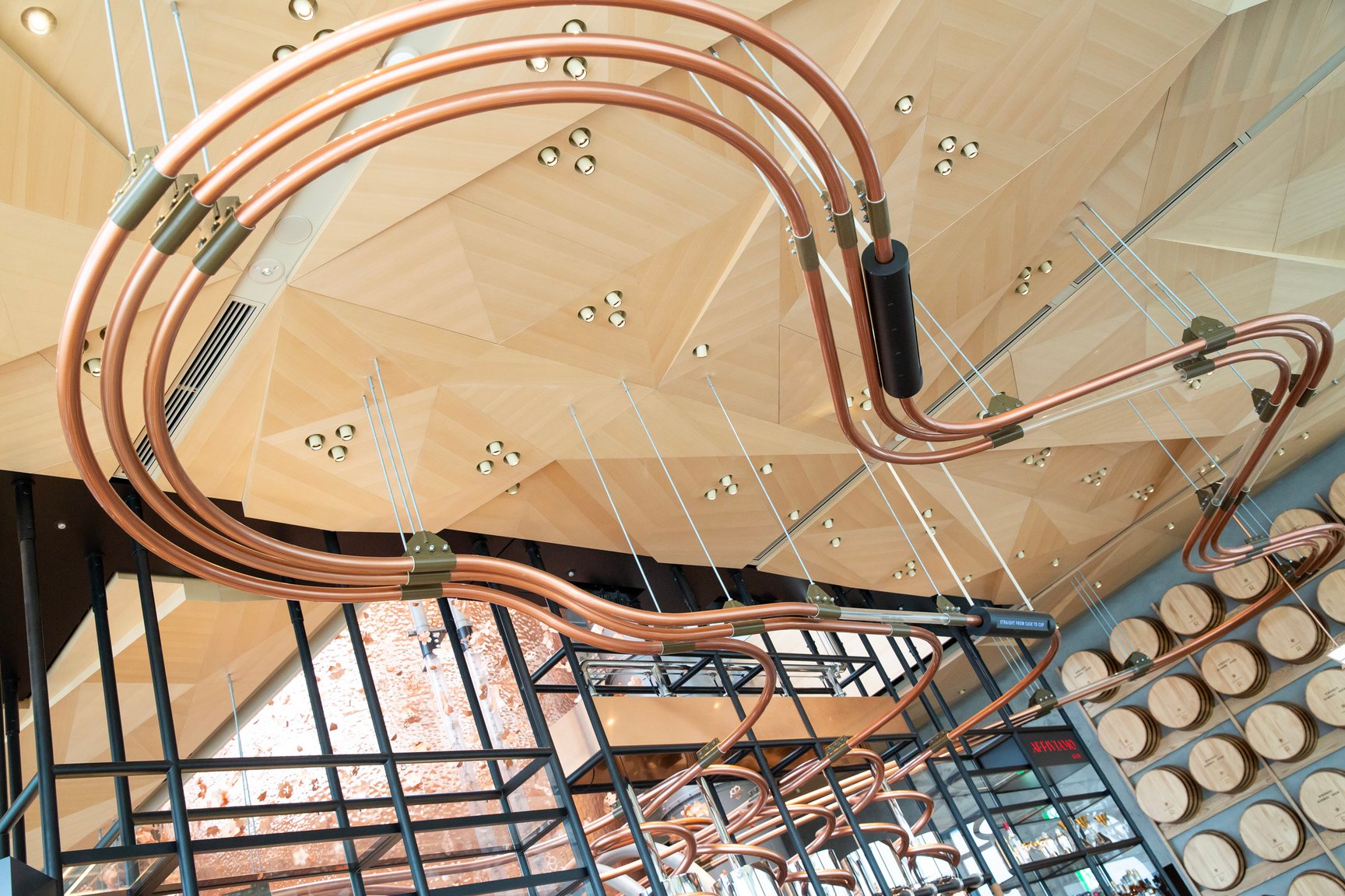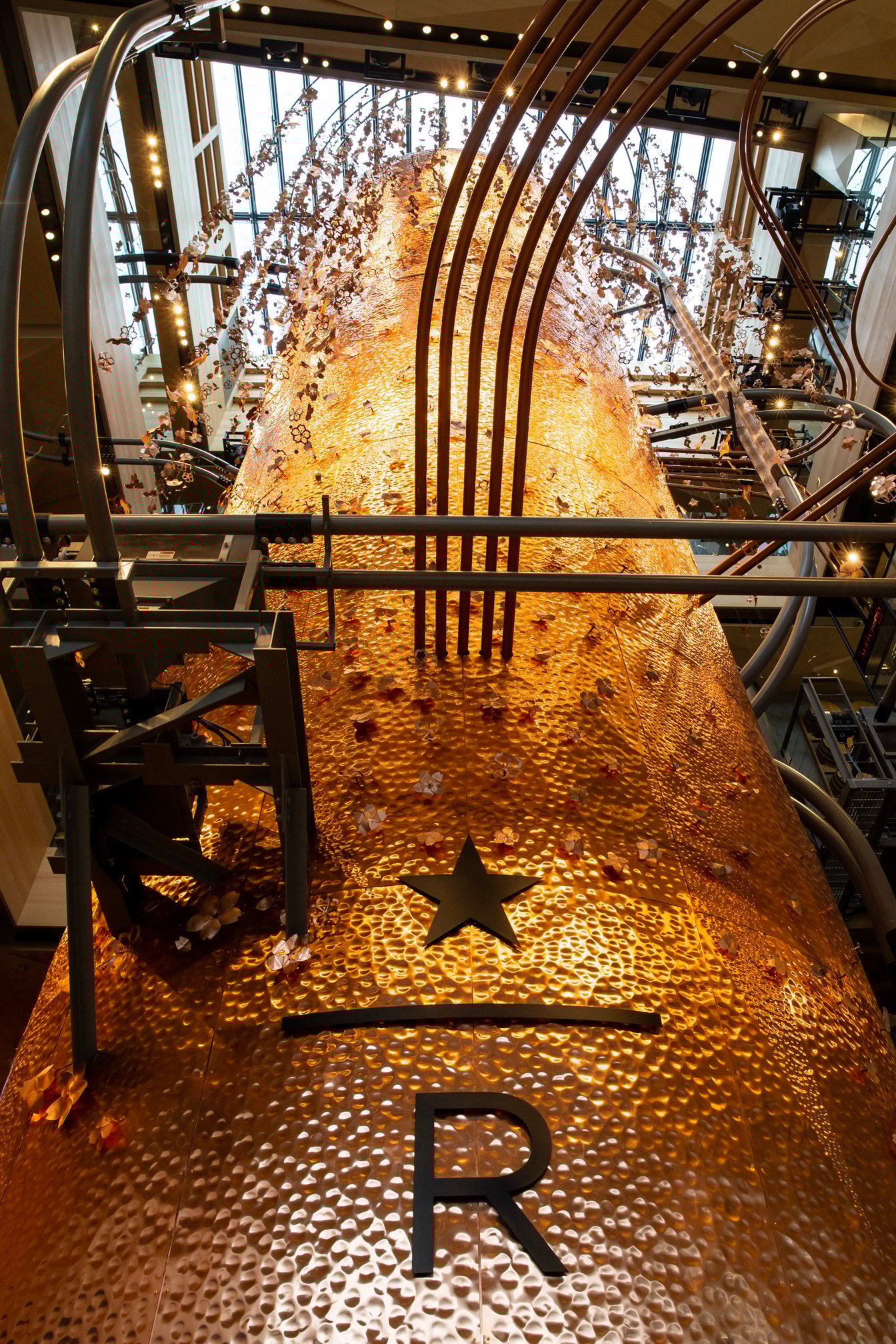 フロア中央には、4階まで届く高さ約17mのキャスクを設置。淡く赤みを帯びた銅板にスターバックス リザーブ® ロースタリー 東京の建設に関わったすべての人が自ら銅板をひと打ちし、表面の質感や模様を作り上げたとのこと。2100枚におよぶ桜の花びらモチーフの装飾にも注目です。