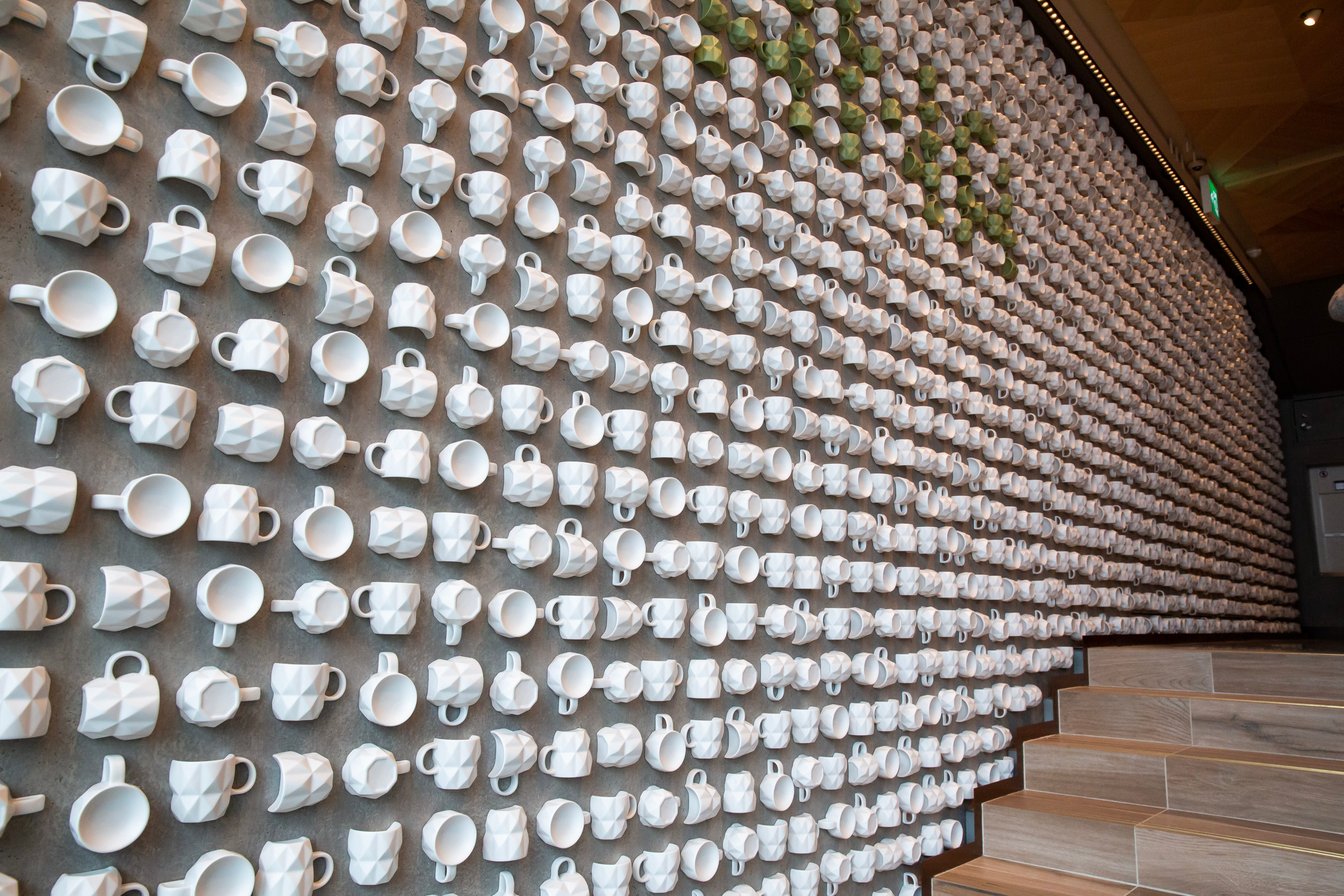 2階につながる階段の壁にはコーヒーカップのモチーフがずらり。中央にはグリーンのカップで「TEAVANA」の文字があしらわれています。