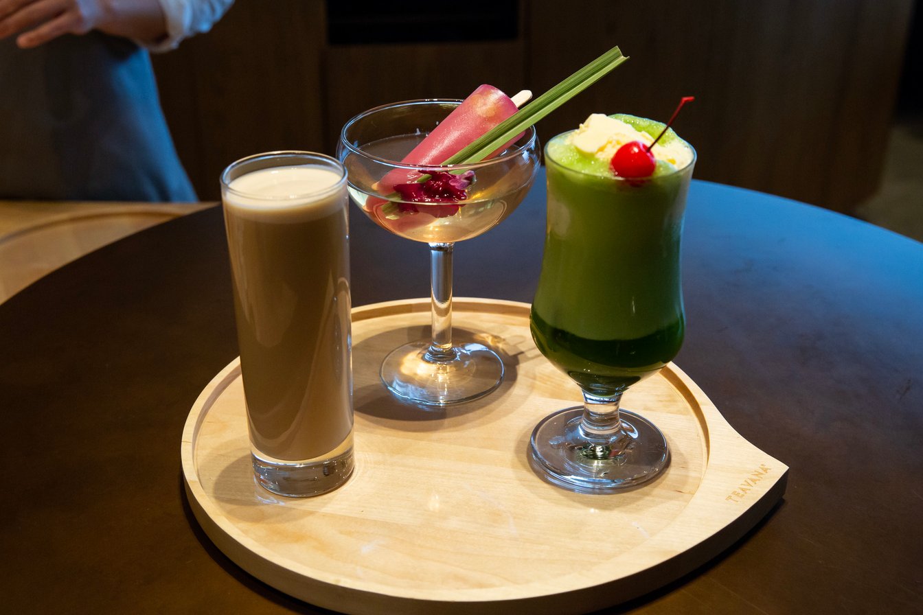 (写真右)喫茶店のクリームソーダからインスピレーションを得た「ティバーナ™️ クリームソーダ 抹茶」(900円)では、バリスタが注文を受けてから一杯ずつ点てる京都宇産の抹茶を使用。(写真中央)「ポップン ティー さくら ジャスミン」(950円)には色鮮やかなアイスキャンディーが添えられています。(写真左)「ナイトロ ミルクティー」(900円)はロイヤルミルクティーに窒素ガスを加たなめらかな口当たりが特徴です。