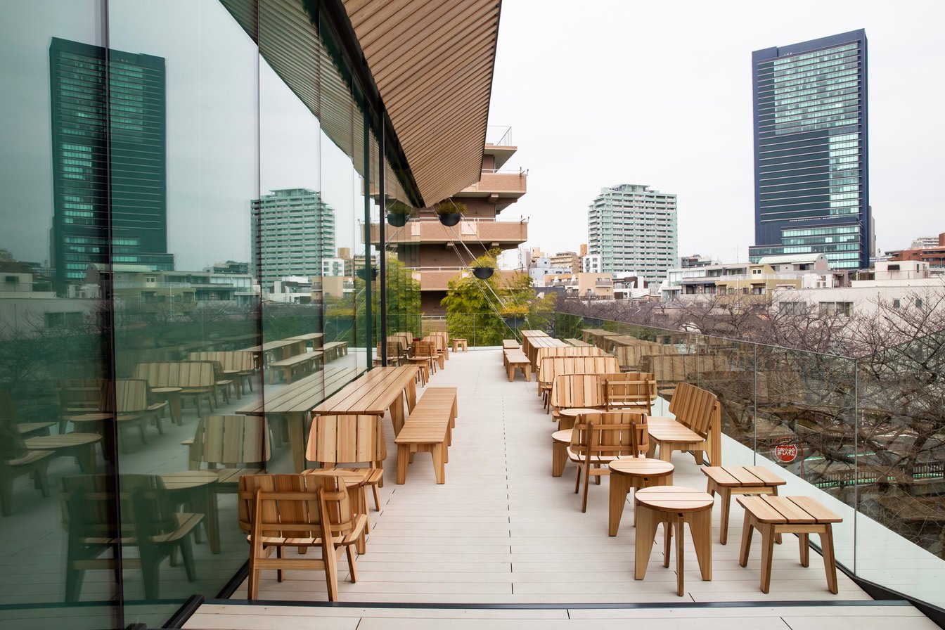 中目黒駅から徒歩約10分、目黒川沿いを歩いていくと4階建ての巨大な店舗が出現。外観は建築家の隈研吾氏が手掛けており、杉の木を使用した明るい色合いに仕上げられています。