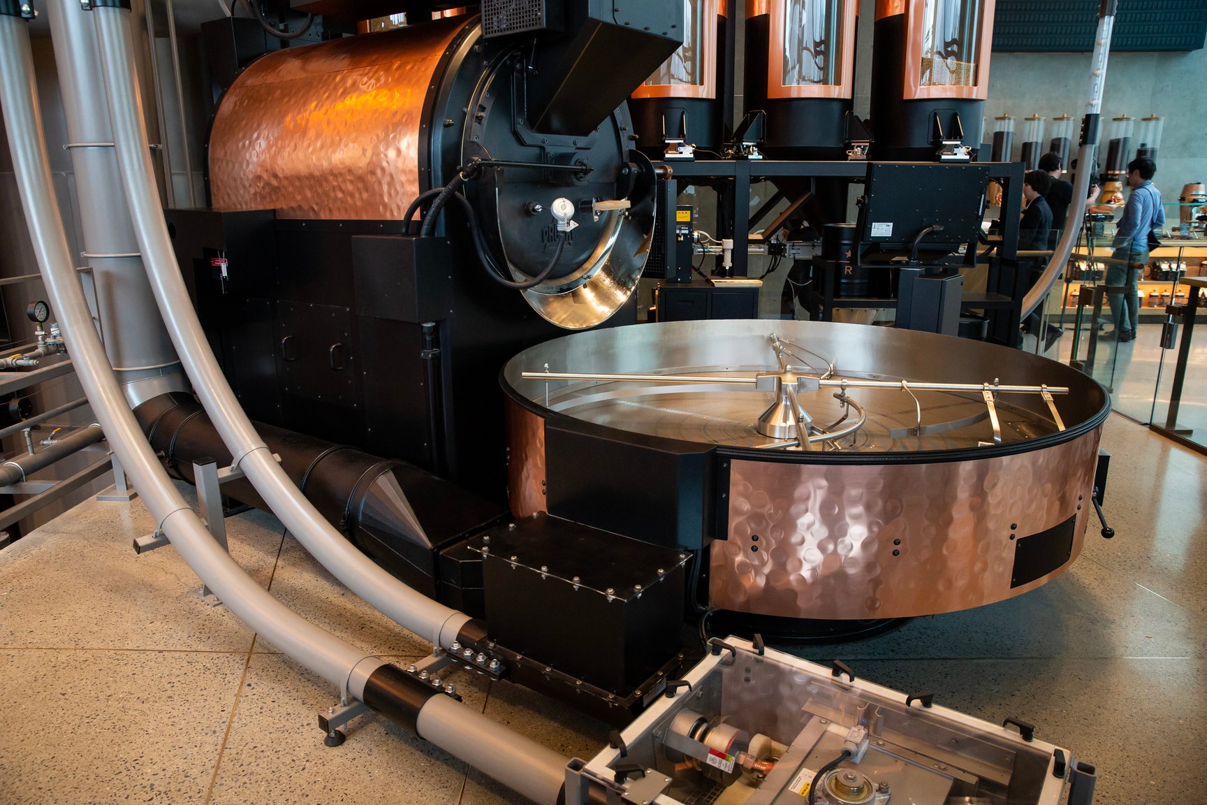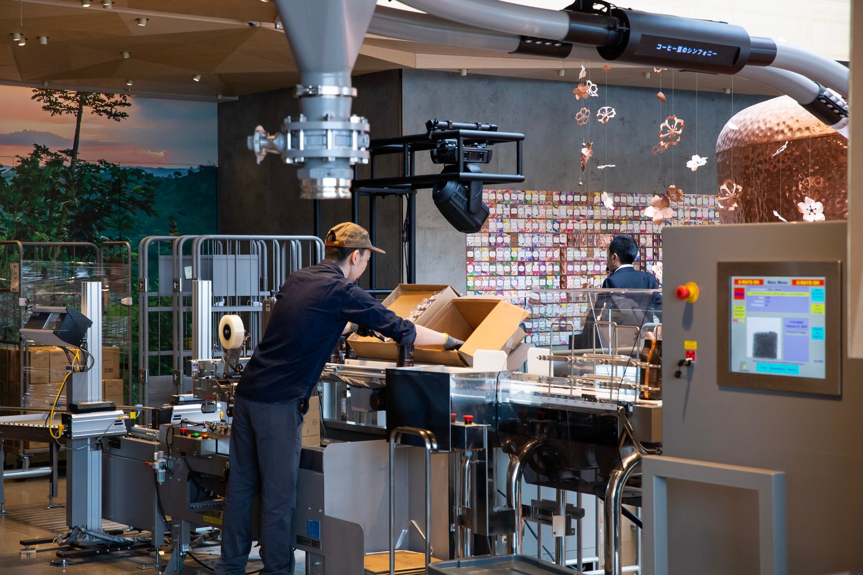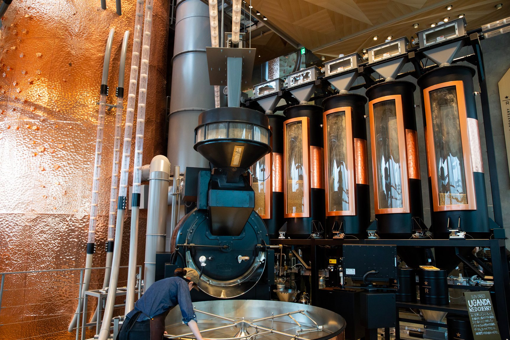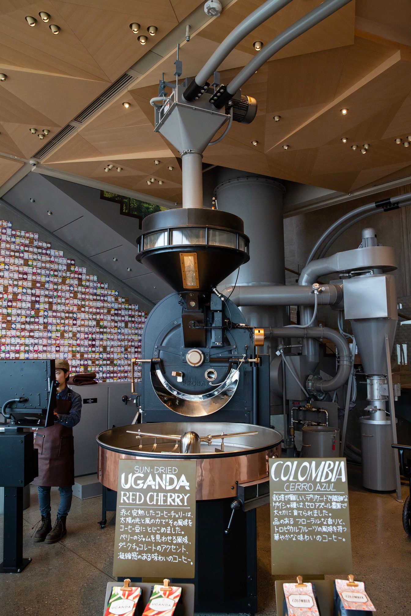 入口の大きな扉を開き、目に飛び込んできたのは国内で初めて併設したというロースタリー。全国の店舗に届けるコーヒー豆を焙煎しています。