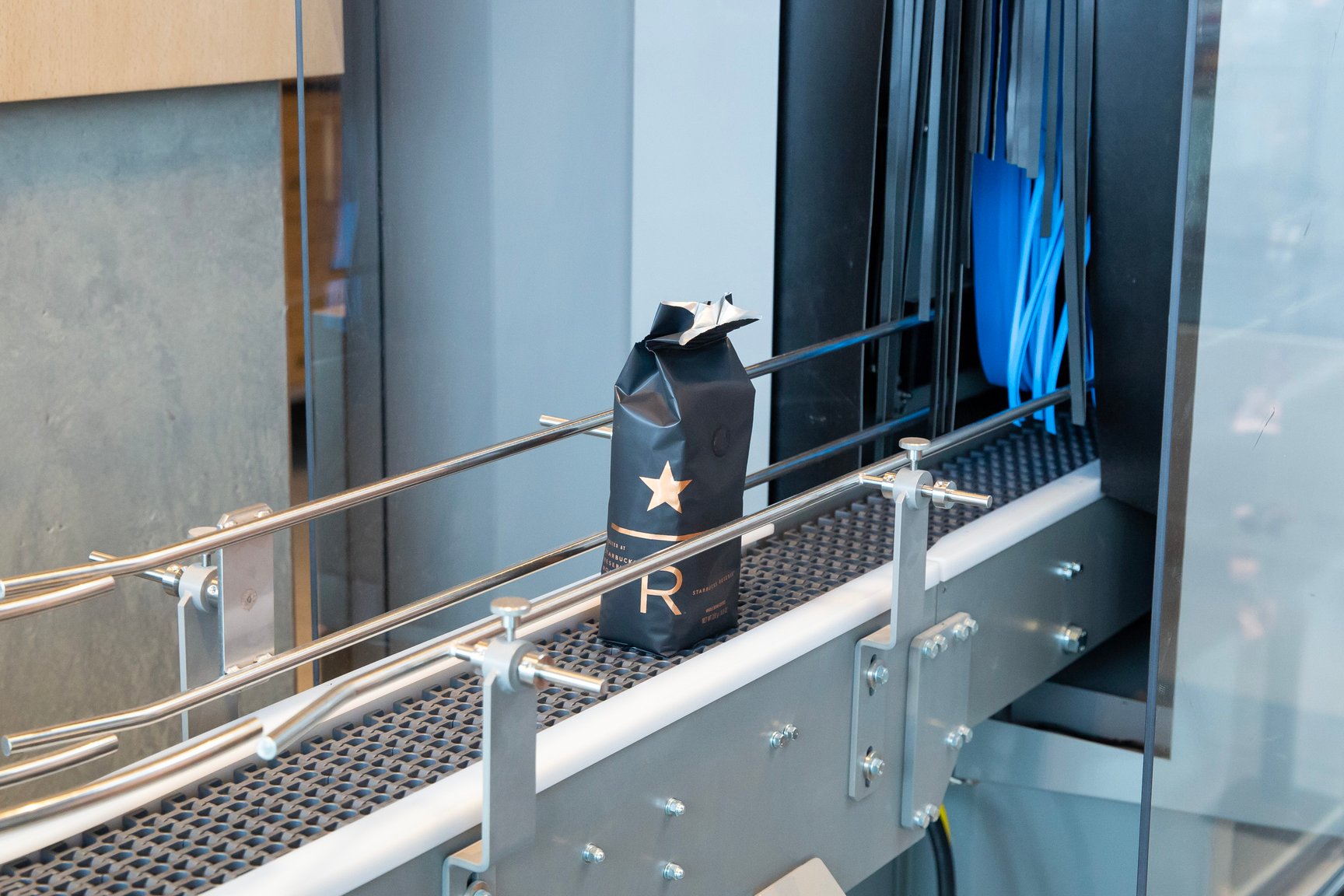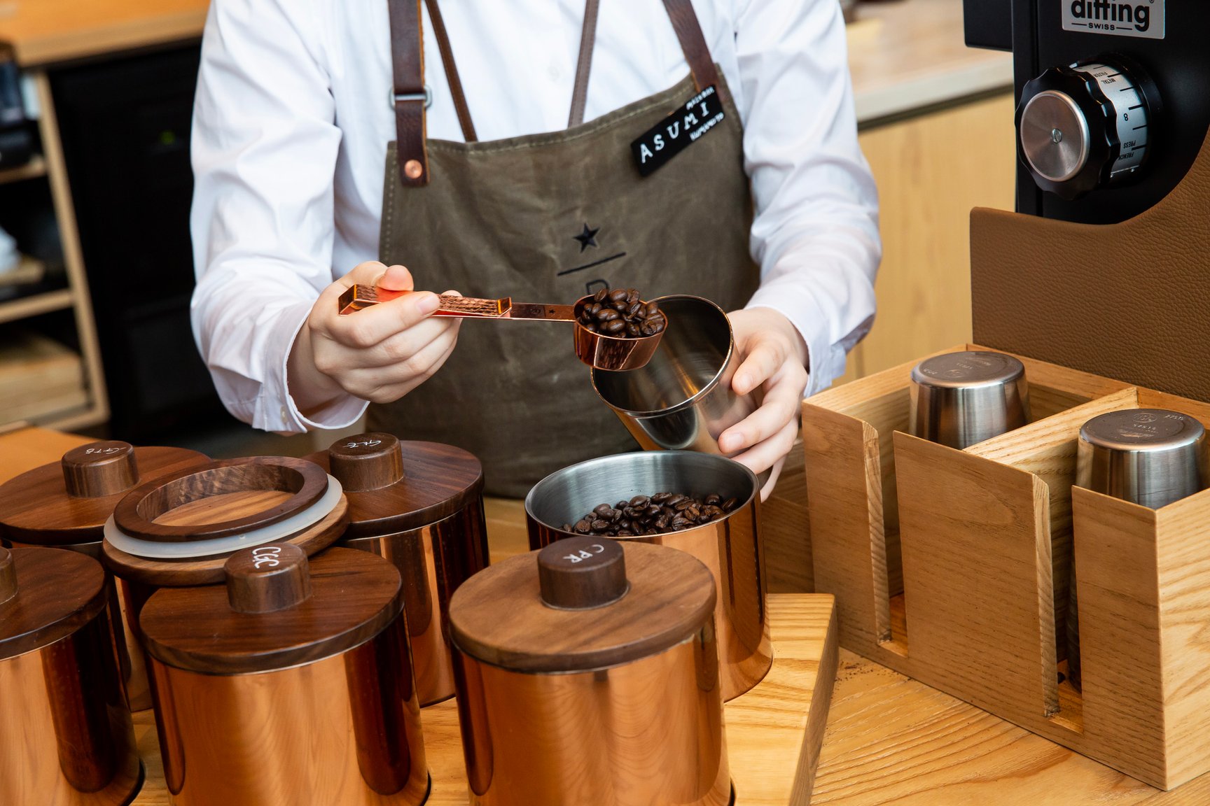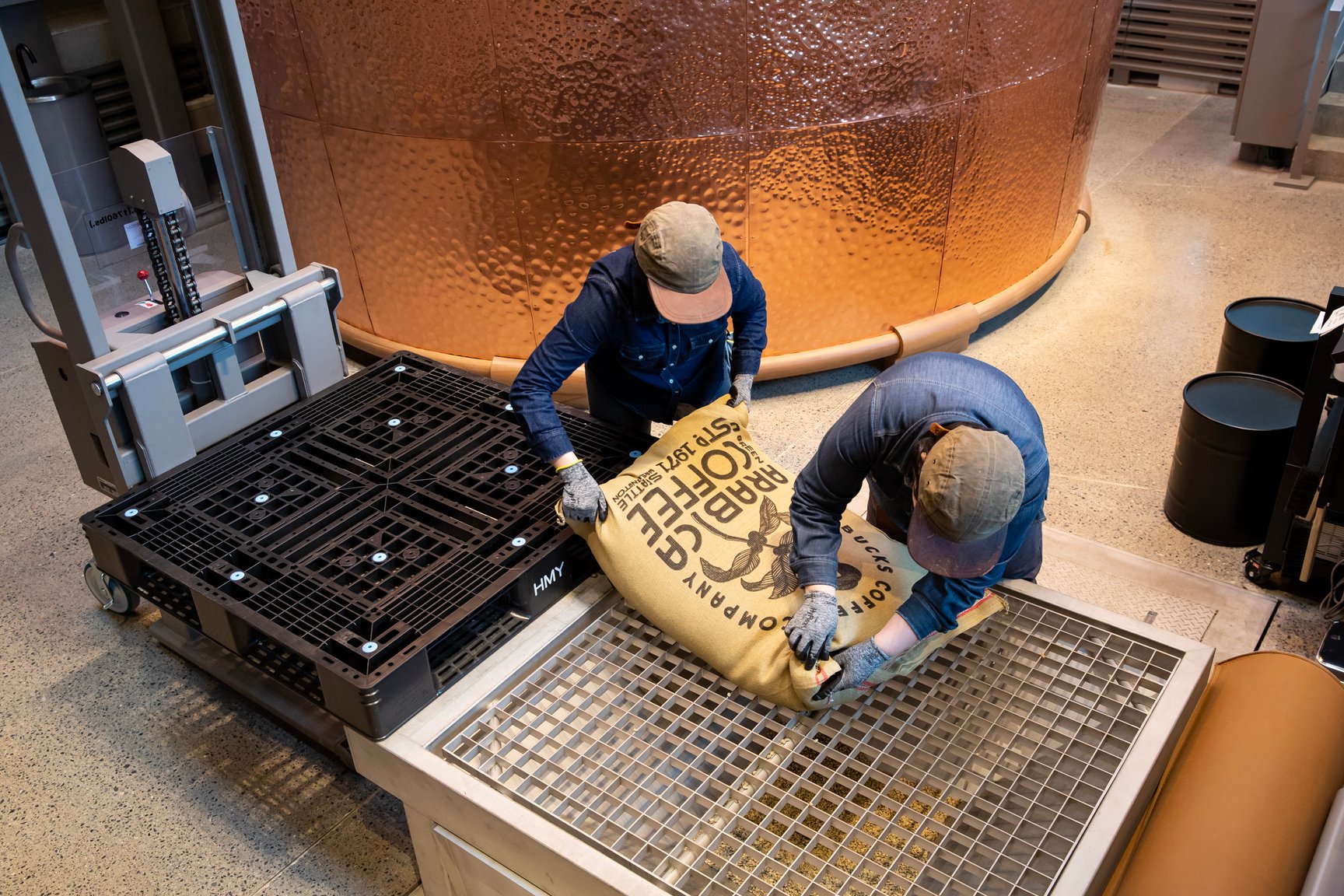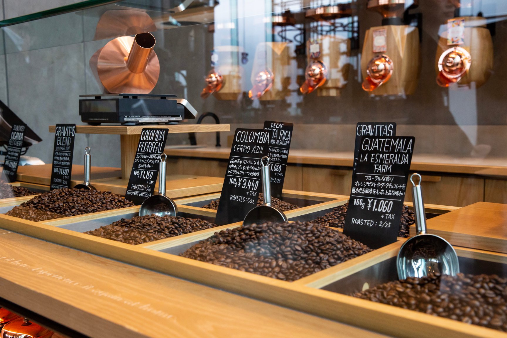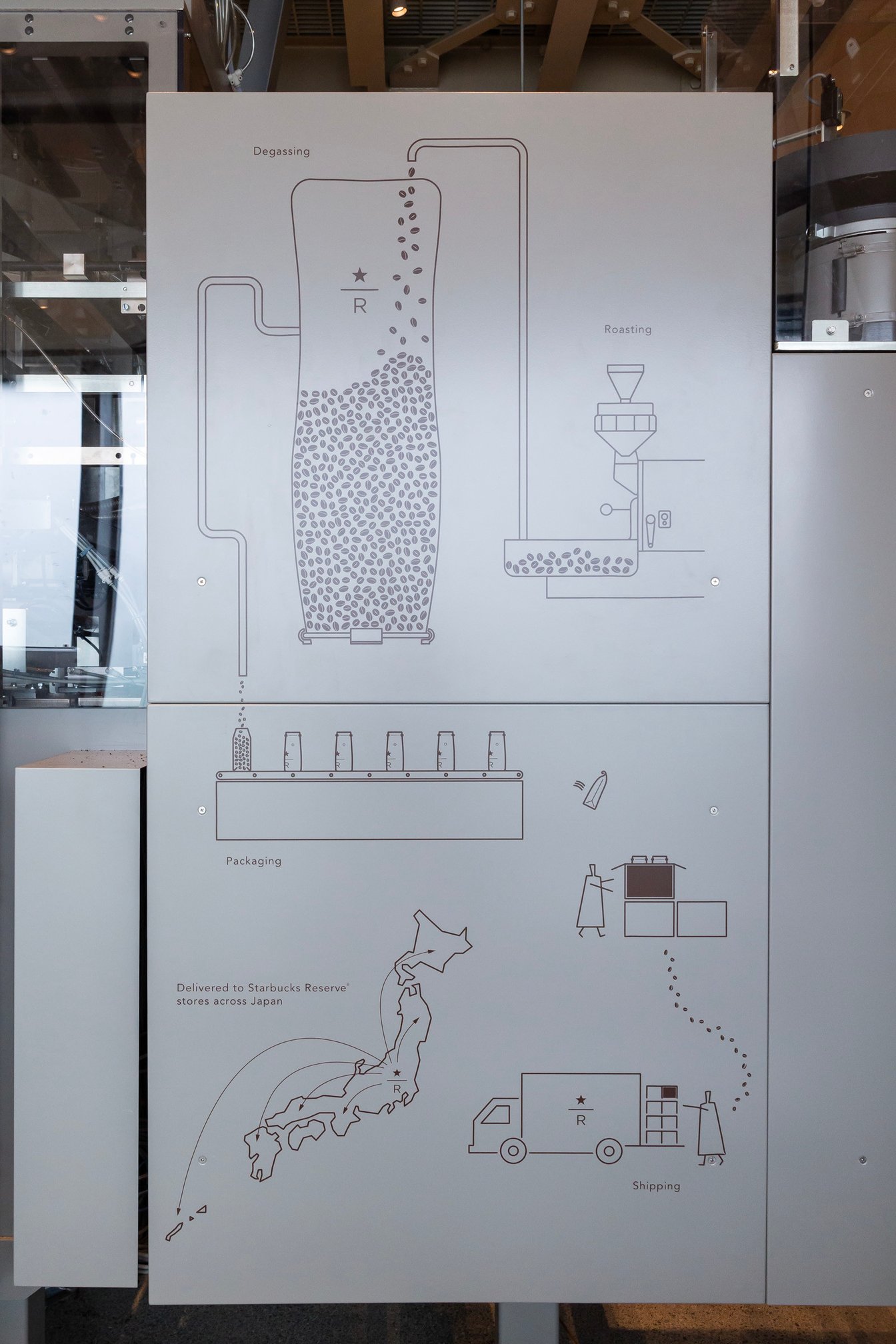入口の大きな扉を開き、目に飛び込んできたのは国内で初めて併設したというロースタリー。全国の店舗に届けるコーヒー豆を焙煎しています。