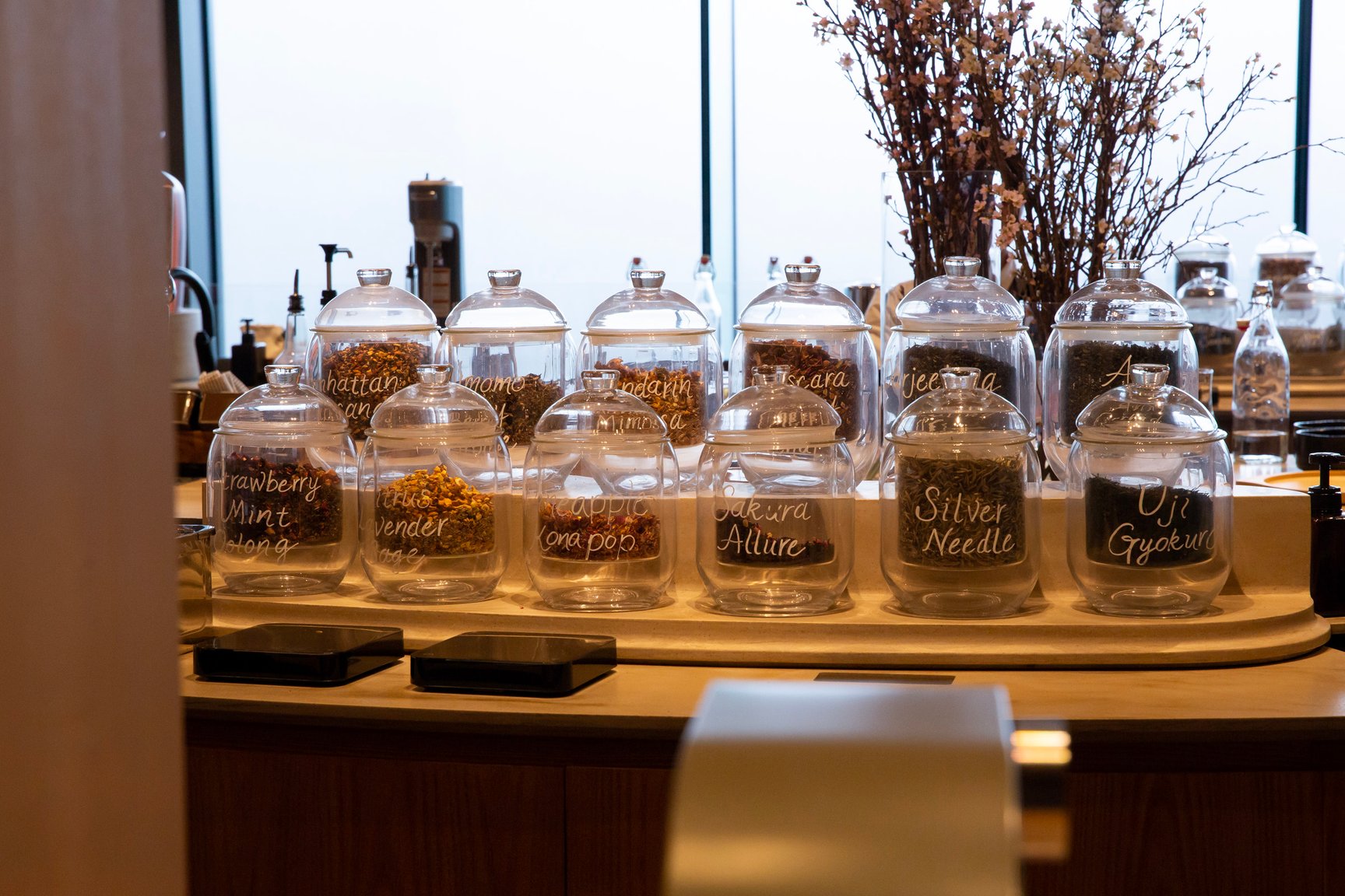 スクープ バーでは「ダージリン ドゥ トリオンフ」「宇治 玉露」などのピュア ティーや、「さくら アリュール」や「スモモ ベリー パープル」といったシグネチャー ブレンドティーなど全16種類の茶葉を販売。通常の店舗ではボックスに入った状態で展開されていますが、ここでは実際に香りを試しながら選ぶことができます。