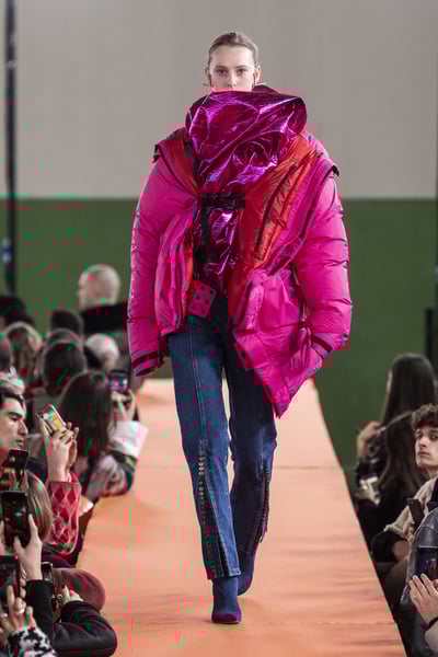こちらも同じくワイ・プロジェクト×カナダグースのベージュダウンジャケットです。フロント部分をはじめ、全体的にねじれたようなディテールが目を引きます。アーシーなカラーを活かして、トライバル風の柄プリントアイテムを合わせた着こなしもおすすめ。