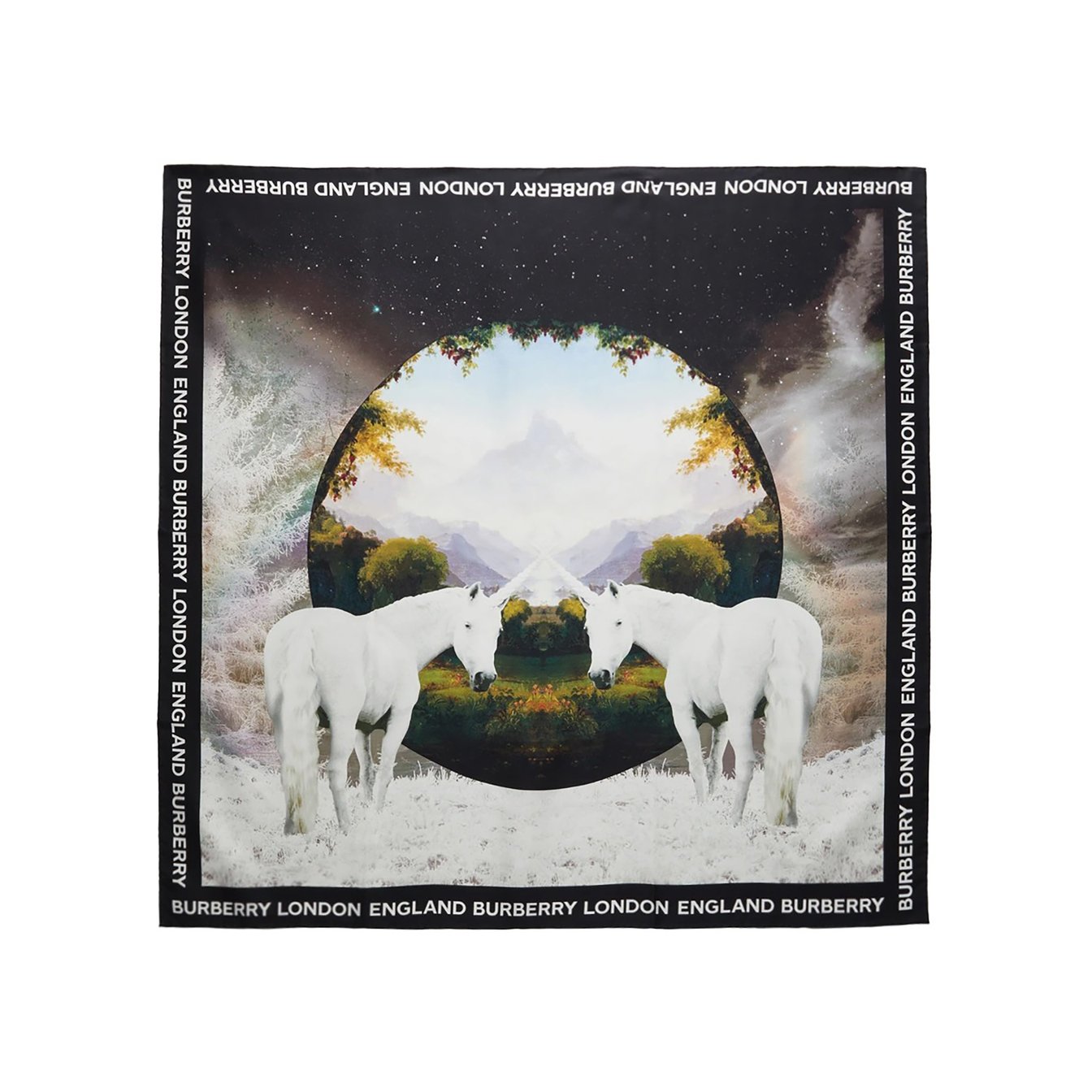 一点投入でコーデのアクセントになるスカーフは、「バーバリー」のシグネチャーアイテムのひとつ。あえてチェックプリントではないものをセレクトしてみませんか?ドリーミーなユニコーンプリントは、思わず目を引くユニークさです。