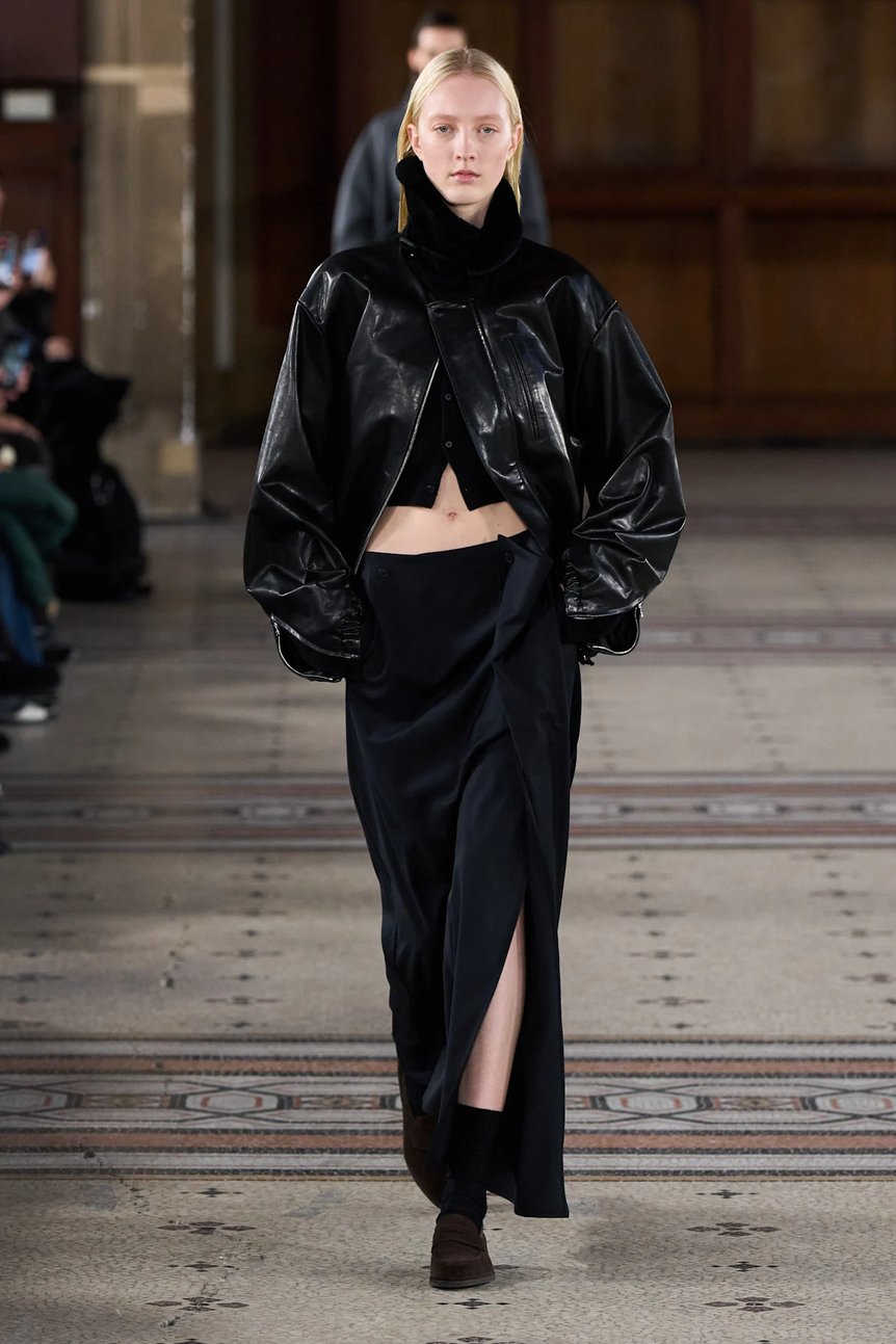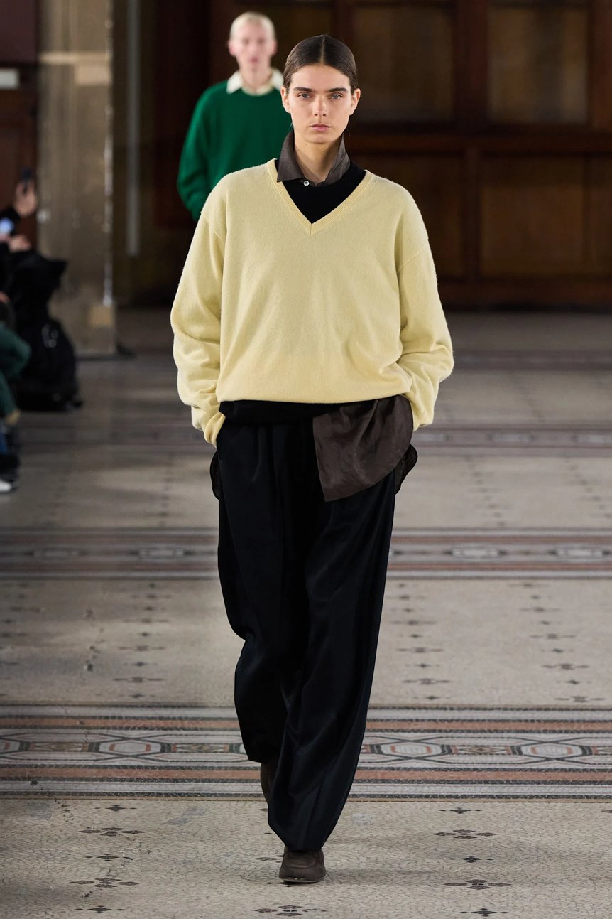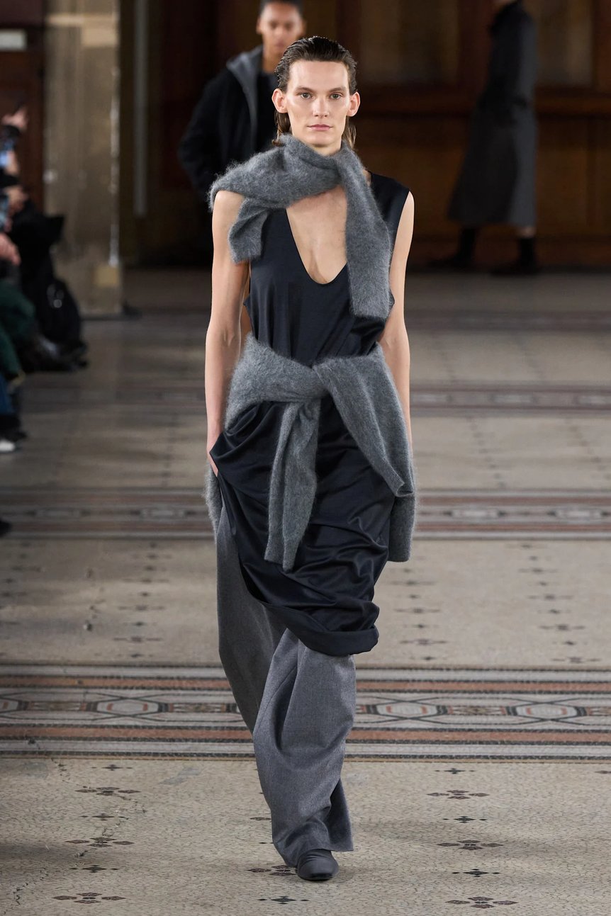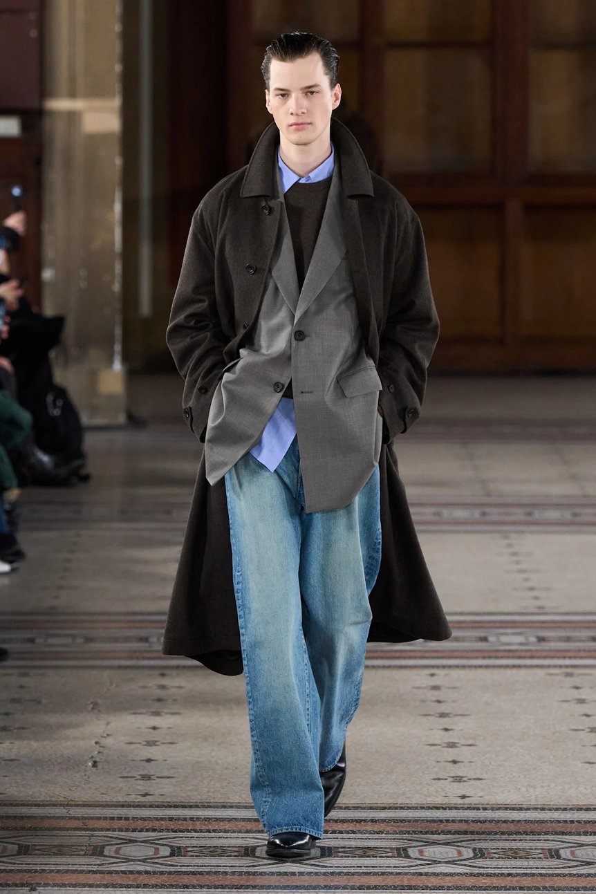 ショーの会場として選んだのは、1794年に建てられたパリの高等教育機関 フランス国立工芸院。中世の宗教建築と、19世紀産業革命期の機能美が融合した空間で、荘厳なBGMとともにショーはスタート。ファーストルックでは、ブランドの代名詞とも言える静寂の美学がグレーの濃淡によるレイヤリングで表現された。肩をドロップさせたリラックスシルエットに、首元から覗くサックスブルーのシャツが知的さを加え、歴史的建造物の空気感と共鳴。生地をたっぷり使ったワイドトラウザーは、モデルの歩みに合わせて優雅に波打ち、静寂の中にも確かな力強さを感じさせる。