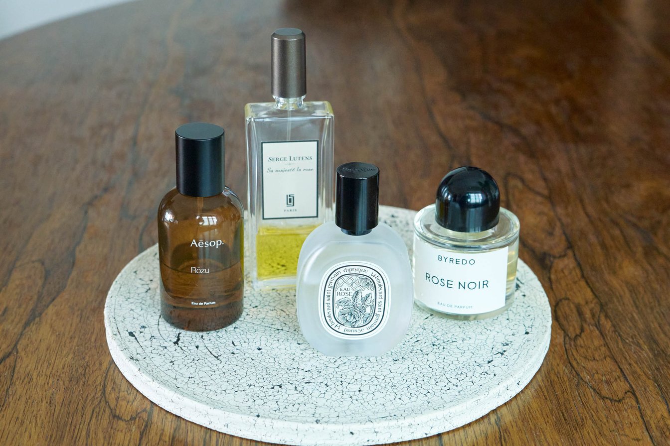 愛用のローズ系フレグランス。左から、イソップ「ローズ オードパルファム」(50mL 2万3870円)、セルジュ・ルタンス「Sa Majeste La Rose」※現在は生産終了、ディプティック「オーローズ ヘアフレグランス」(30mL 9240円)、バイレード「ローズノワール」(50mL 2万8050円)
