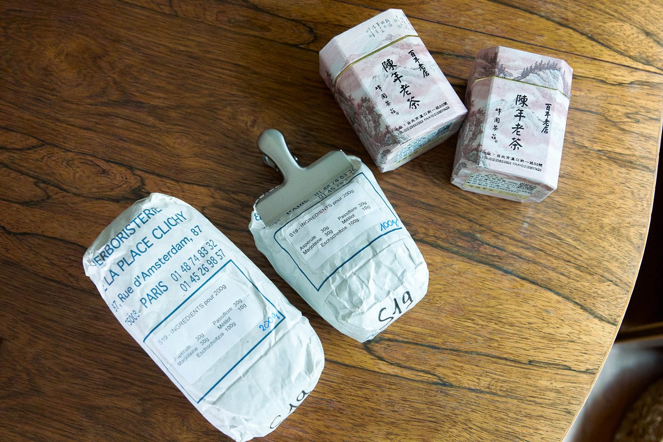 左から、パリの老舗ハーブ薬局「グランデ・エルボリステリア・メディケール・ドゥ・ラ・プラス・ド・クリシー(Grande Herboristerie Médicale de la Place de Clichy)」のハーブティー、台湾の老舗 峰圃茶荘の「陳年老茶」(100g 3000円)