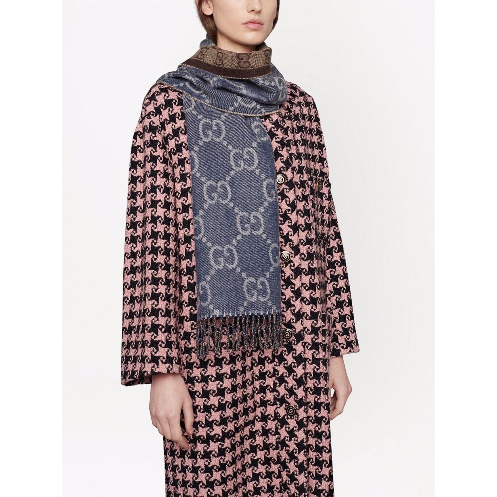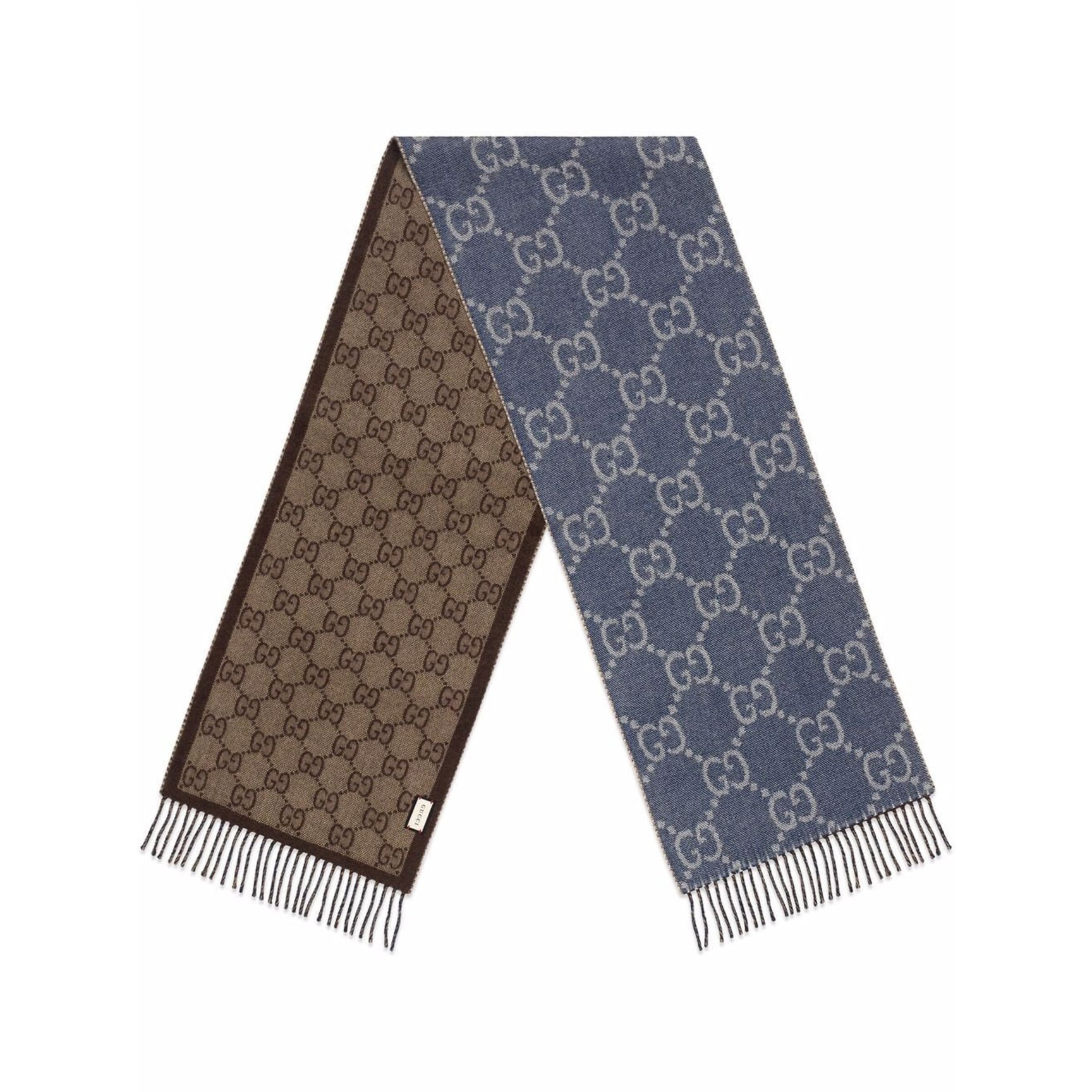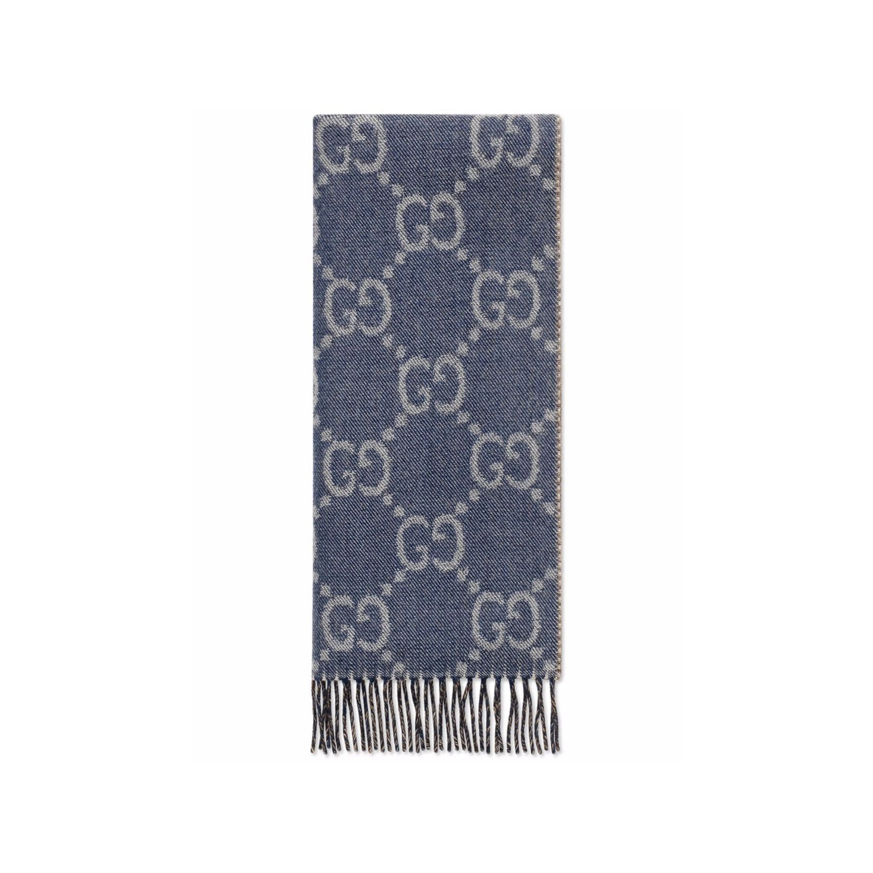 最初にご紹介するのは、表と裏で異なる表情を見せる「グッチ(GUCCI)」のニットスカーフ。ブランドを象徴するGGモノグラムが均等にデザインされた一枚は、オーガニックウール100%で触り心地も抜群。巻き方によりさまざまなスタイリングを楽しめます。