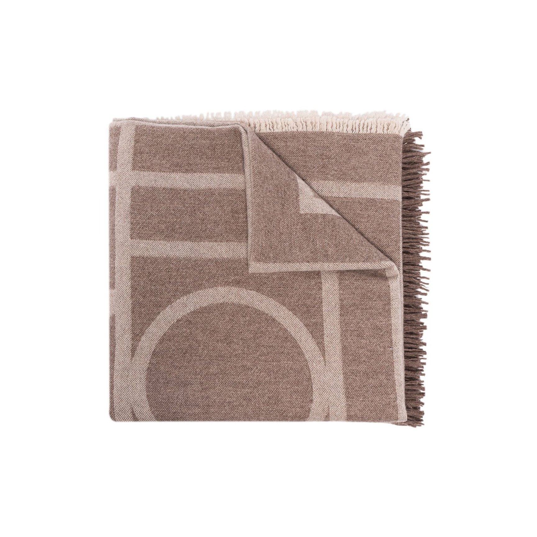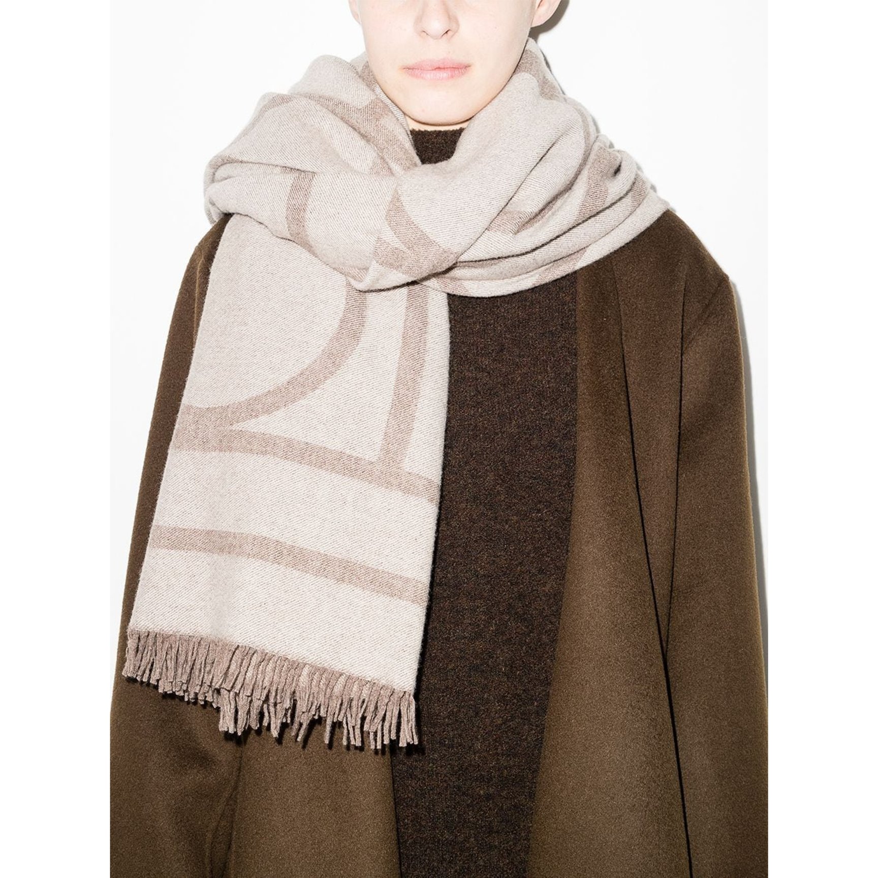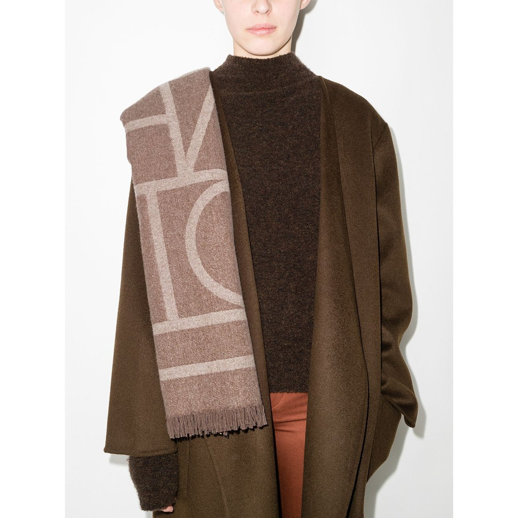 大きく描かれたロゴが、ドラマティックに見え隠れする「トーテム(TOTÊME)」のストール。カシミヤ混のバージンウールで仕立てられた一枚は、濃淡をつけたベージュで秋冬のスタイリングにやわらかく馴染みます。