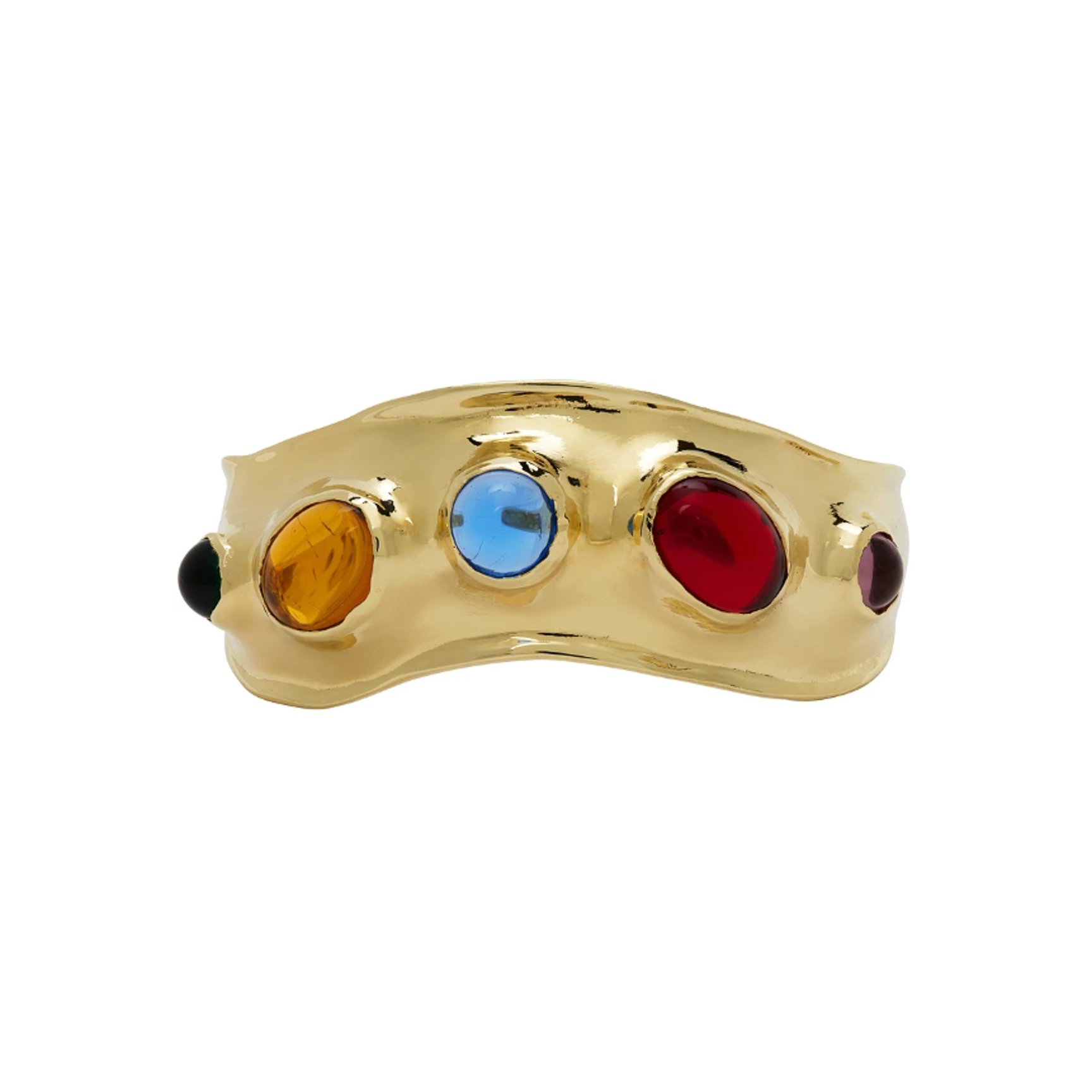 シンプルでありながらも、本物の品格を漂わせるジュエリーを作り出す「モンド・モンド(MONDO MONDO)」から登場するカフブレスレット。光沢のあるゴールドトーンのバンドには、マルチカラーのガラスストーンが全体に散りばめられています。光沢のあるストーンがお好みの方、手元を華やかに飾りたい方におすすめです。