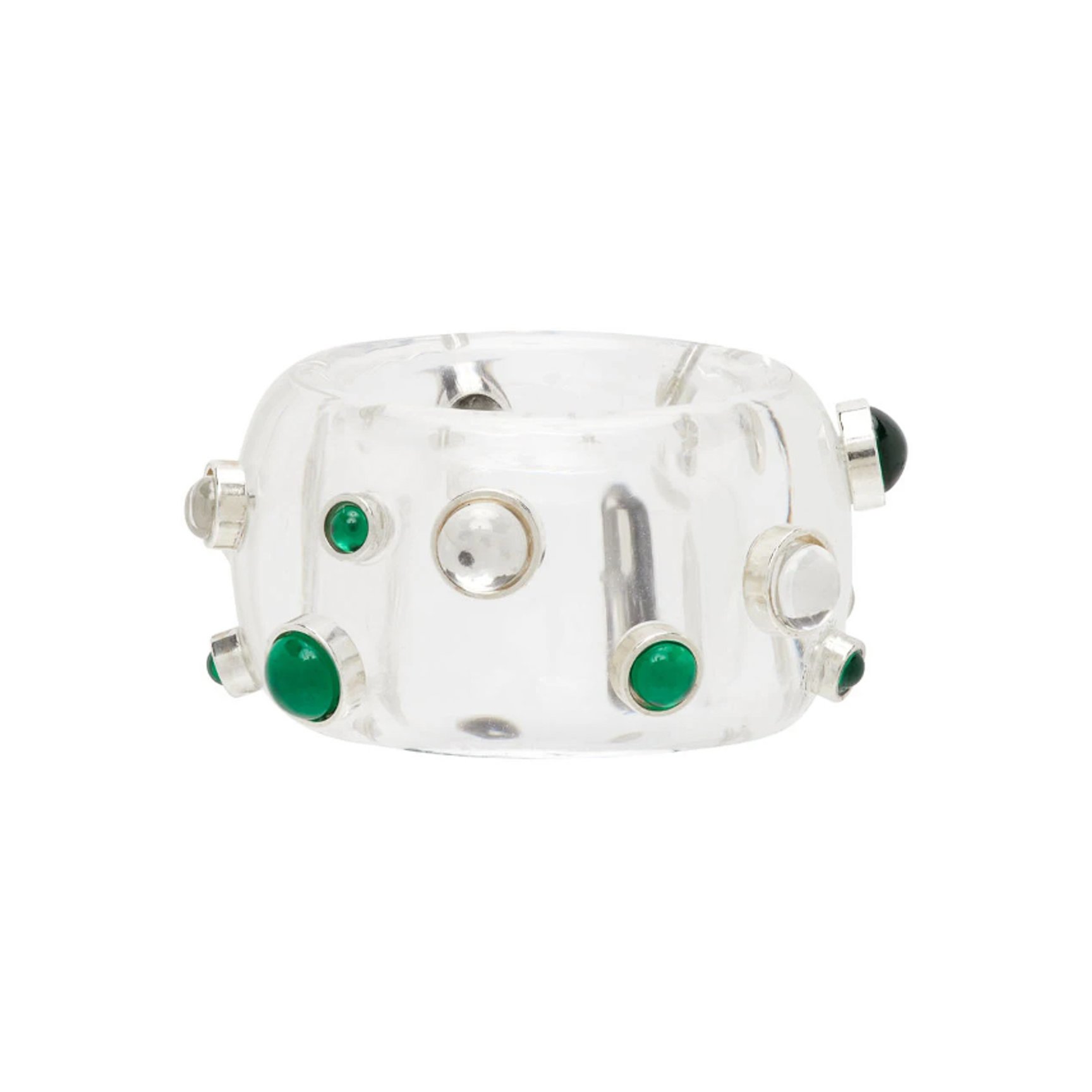 他には見ない、個性的なデザインが特徴のリングは「ボッテガ・ヴェネタ(BOTTEGA VENETA)」のもの。透明な樹脂のバンドリングには、グリーンカラーのキュービックジルコニアとガラスのストーンが散りばめられています。リングが太めなので、クリアでも存在感を放ってくれる点がワンポイント。シンプルでありつつも、目立つリングをお探しの方にイチオシです。
