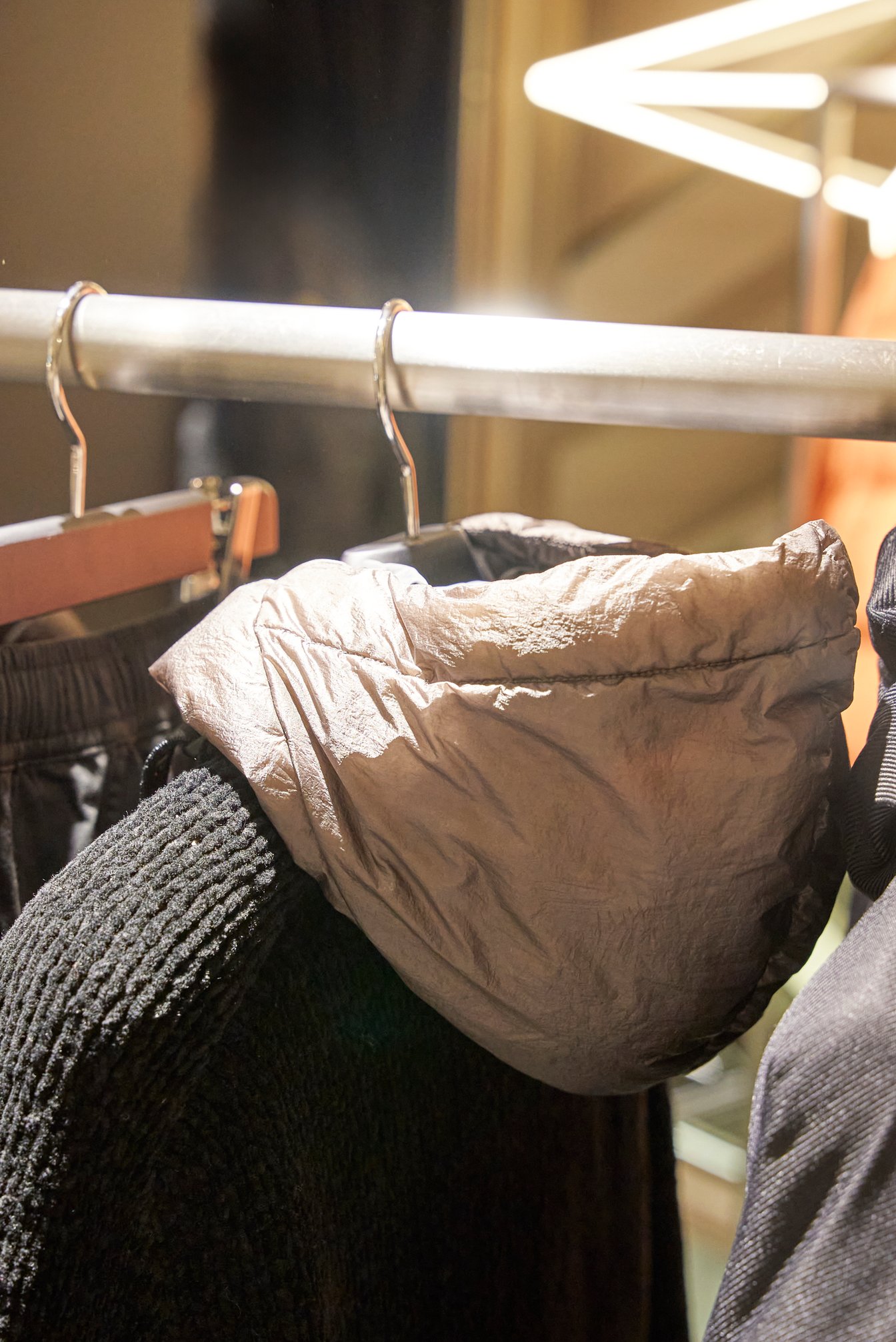 まず手に取ったのは、ここでしか手に入らない限定ダウンコート。古来からウールに使用されてきた「ダイアゴナル織」をナイロンに転用したアイテムで、高級感のある生地の光沢が特徴。2色のウールを使用したファンネルネックセーターが良いアクセントに。