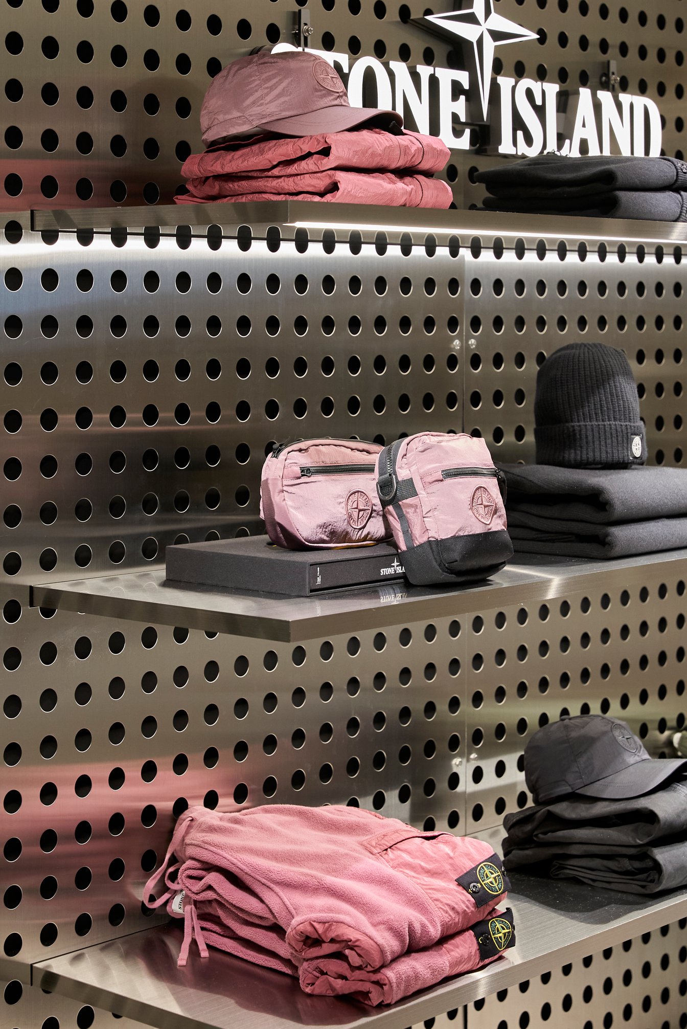 リサイクル素材100%の軽量ナイロンレップスを使用し、ガーメントダイを施した定番ダウンジャケットの新色ブルー「ズッケロ」をチョイス。深みのある寒色に、ピンクのフリースカーゴパンツの合わせが映える。全て単体でもパワーを発揮するアイテムだが、全身ストーンアイランドで揃えることで、コンパスロゴのトラディショナルかつフューチャリスティックな魅力が倍増。ブランドのフィロソフィーを余すところなく感じられる。