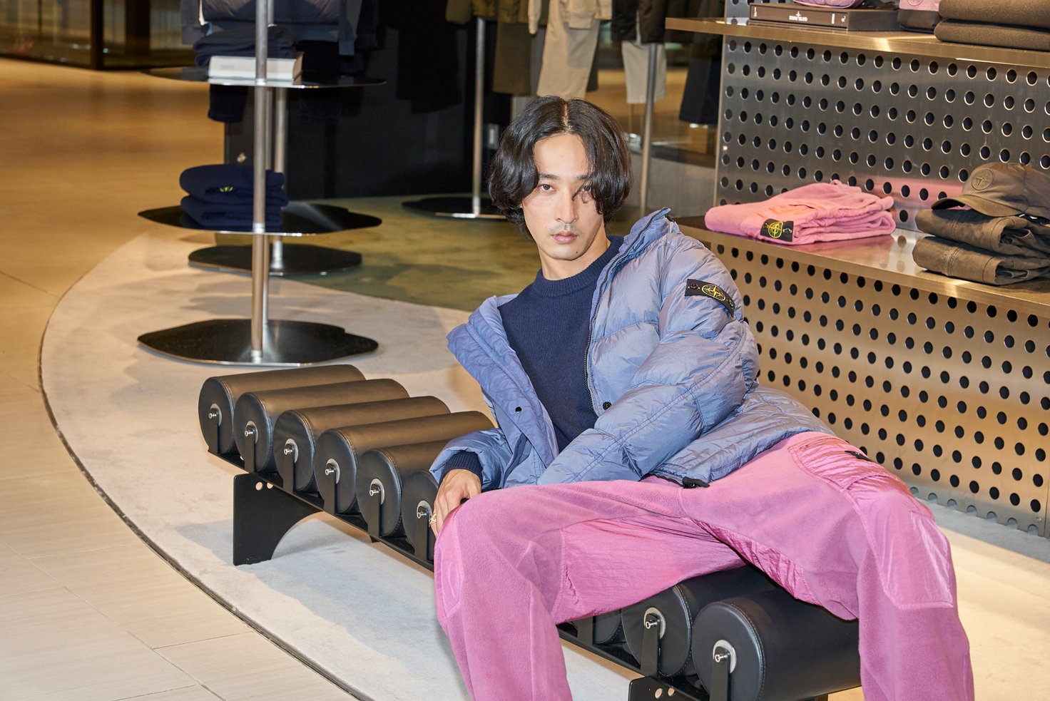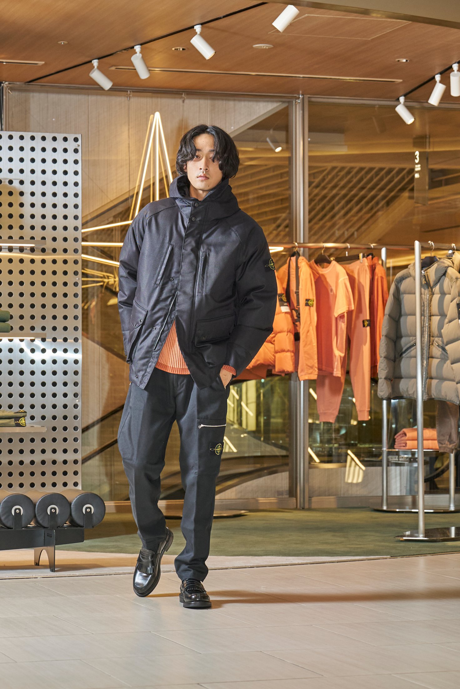 「ギンザシックスの中でも、一際存在感を放っているストーンアイランドのポップアップストア。店内を回っていると自分のワードローブに加えたいアイテムが多く、目移りしてしまいました。今回は着ませんでしたが、プライベートでも愛用しているバッジがボディと同色の「GHOSTライン」も揃っていたりと、ラインナップが充実しています。ブランドのコアなファンからこれからチャレンジしたい人まで、全員がワクワクできる空間になっていると思うので、ぜひ足を運んでみてください」-上杉柊平-