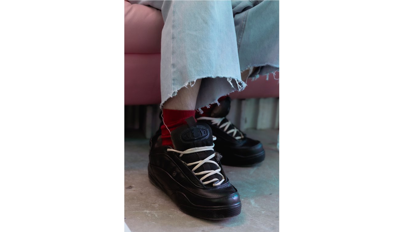 取材当日着用していたパンツの裾は自分でカット。靴は家庭用の染料で着色したという。