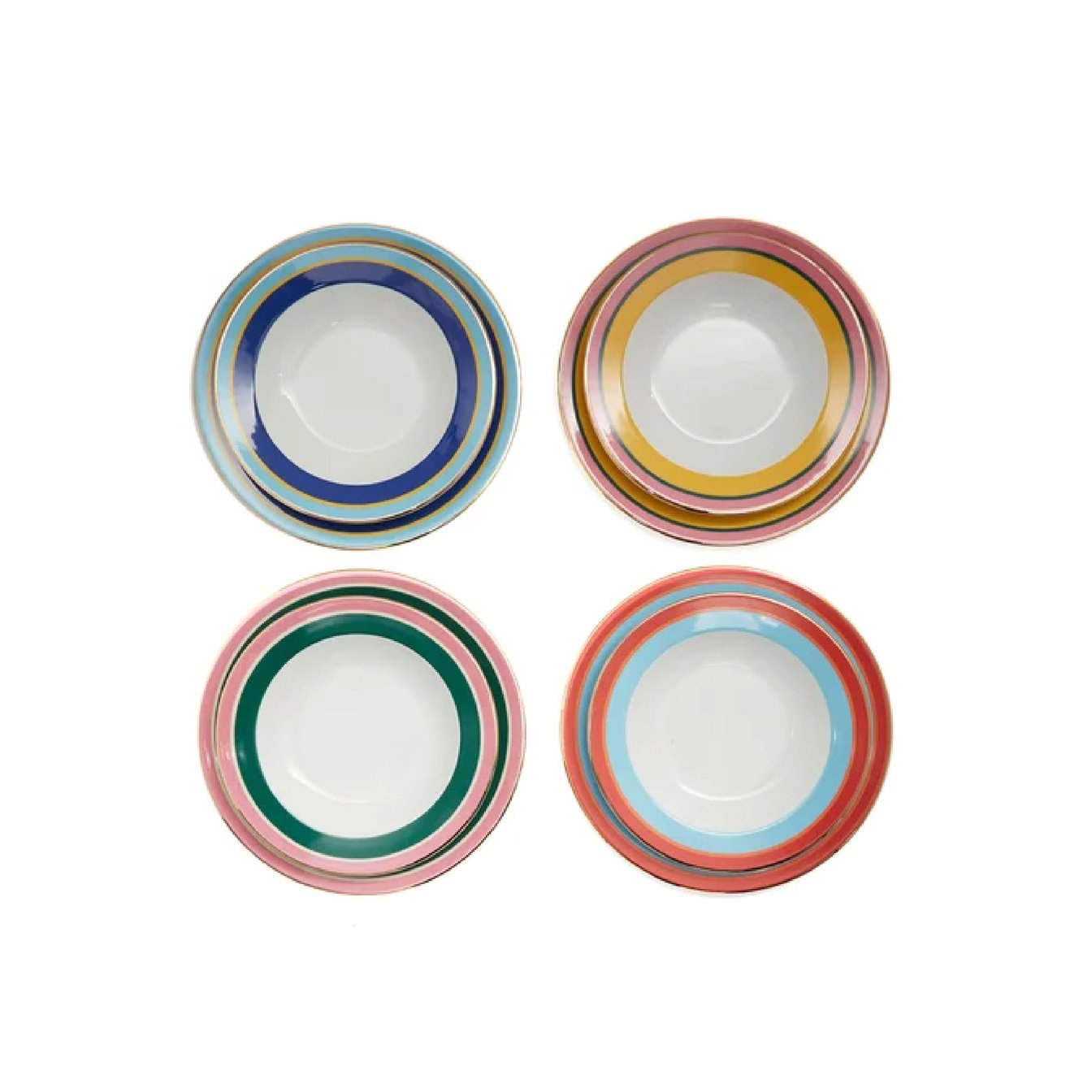 マルチカラーのボウルとプレートがセットになったテーブルウェア。ポップな色使いながら、縁に施したゴールドラインでエレガントに仕上がっています。プレイフルな食卓で、家族や友人と食事を楽しんで。