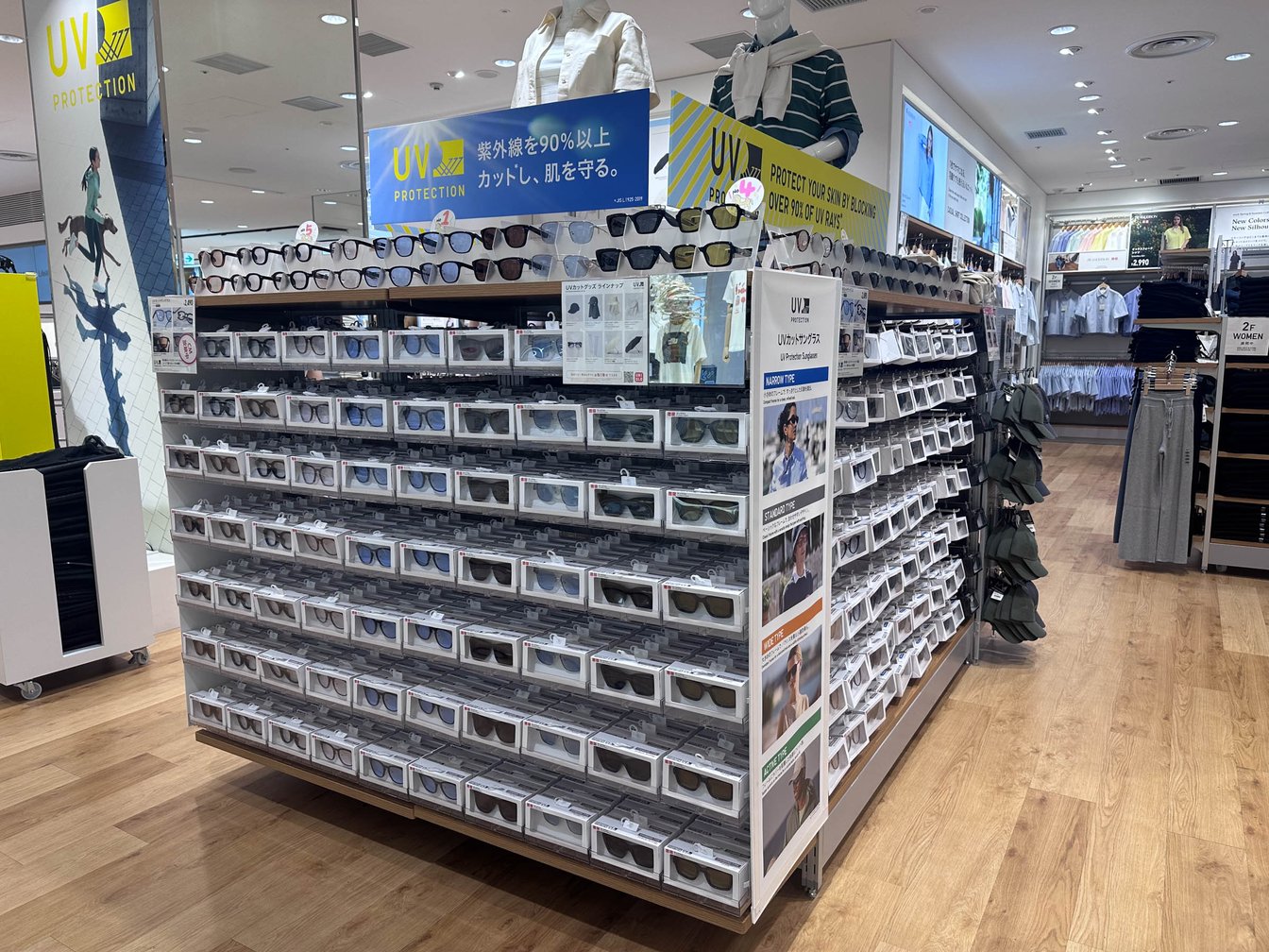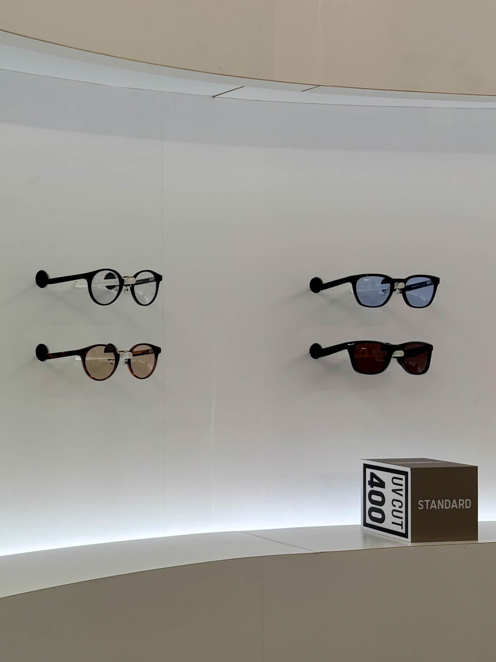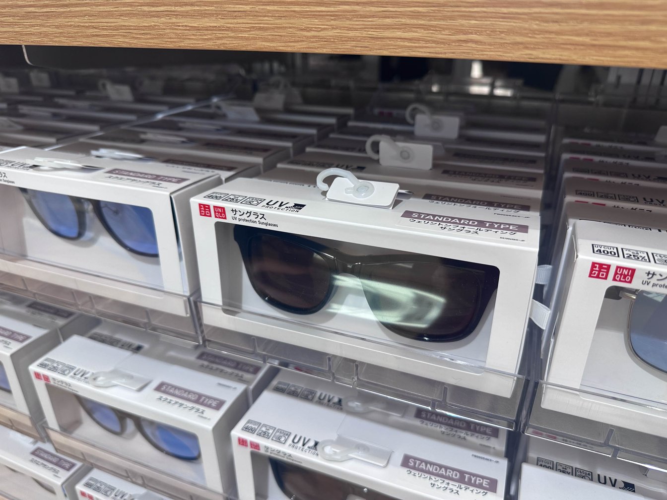 ユニクロは、世界的にUVカットへの関心が高まっていることを受け、今春夏はサングラスの打ち出しを強化、2026年はユニクロの「サングラス元年」になると期待する。型数は昨年とほぼ同じ18型だが、クリエイティブディレクター クレア・ワイト・ケラー(Clare Waight Keller)が初めて監修し、機能とデザインを両立させたアイテムを提案している。価格は2490円で統一し、ラインナップの変化が一目でわかるようにするために、パッケージや陳列方法を見直した。これまでは袋状のパッケージに入れて左側を上にして吊るしていたのに対して、横向きに吊るすことができる箱型のパッケージに変更することで、かけた時の印象に近い見え方でフロントのデザインが確認しやすい売り場に刷新した。新作サングラスコレクションは、2月の発売以降売れ行き好調という。