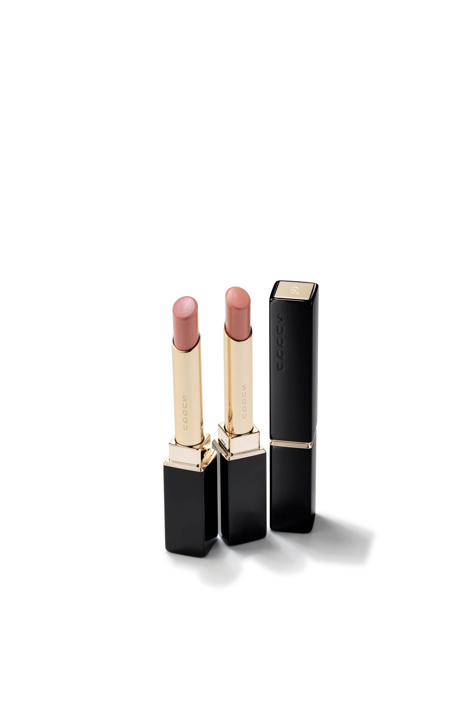 高発色・高密着・長時間の色持ちを叶える「ベルベット フィット リップスティック」の限定色は、やわらかなフラワーピンク「11 恋綴」と、ウォームベージュの「12 想秘」がお目見え。唇にツヤをのせるリップスティック「モイスチャー グレイズ リップスティック」には、赤と緑のパールを含んだブライトピンク「110 蜜咲」と、ゴールドパールがシックなイメージを演出するモーヴブラウン「111 意装」が登場。