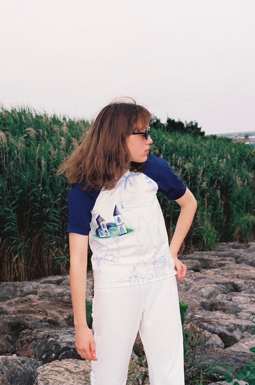 新型コロナウイルス感染症で学校に通えなくなった時期に、手描きや手染めを始めました。工程の多いプリントとは違い即興性があり、感覚的に作れる所が自分と相性が良くて今すごくハマっています。手描きのイラストは、自分のパーソナルな気持ちや思い付きのアイデアを頼りに、「こんな絵や形が服に描いてあったらいいな」と思うものをイラストにしています。これまではスマホで撮った写真をプリントしたり直接生地に描いていましたが、次はスマホで描いた絵で作るプリント生地にチャレンジしてみたいなと思っていて。電車の中や公園で描いたものを使って、服が作れたら楽しそうだなと妄想してます(笑)。
