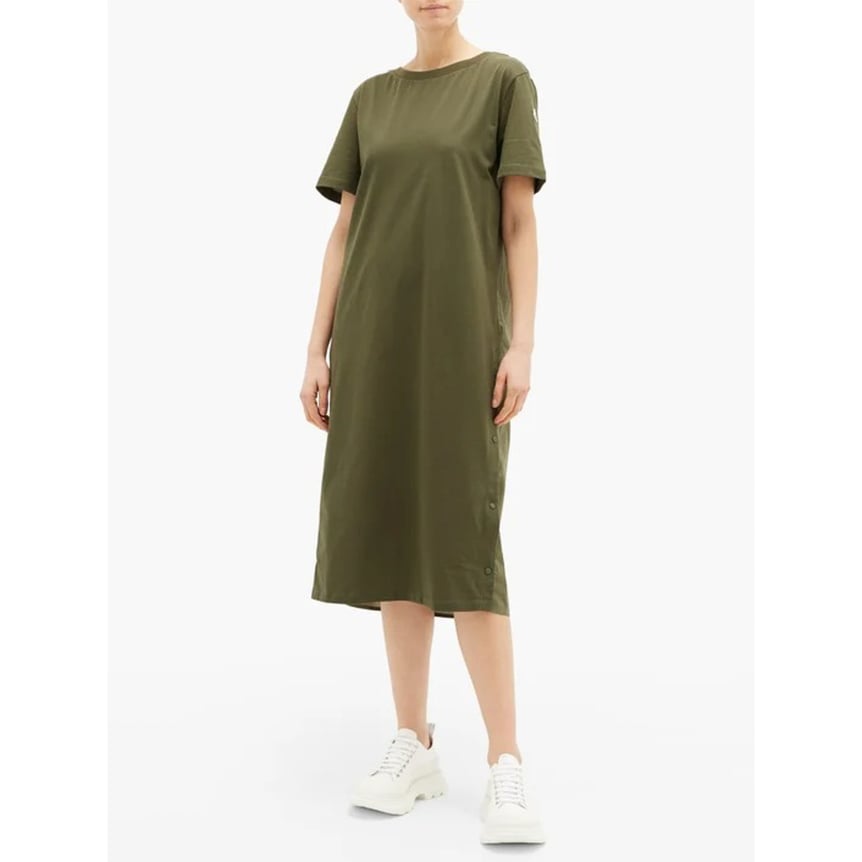 伸縮性のあるコットンジャージーとシャツで使われているポプリンのブレンド素材を使用した「モンクレール(MONCLER)」のワンピース。リラクシングなボックスシルエットの裾には、スタッズボタン付きのスリットが入っているので、アクティブに動く日も快適に過ごせます。