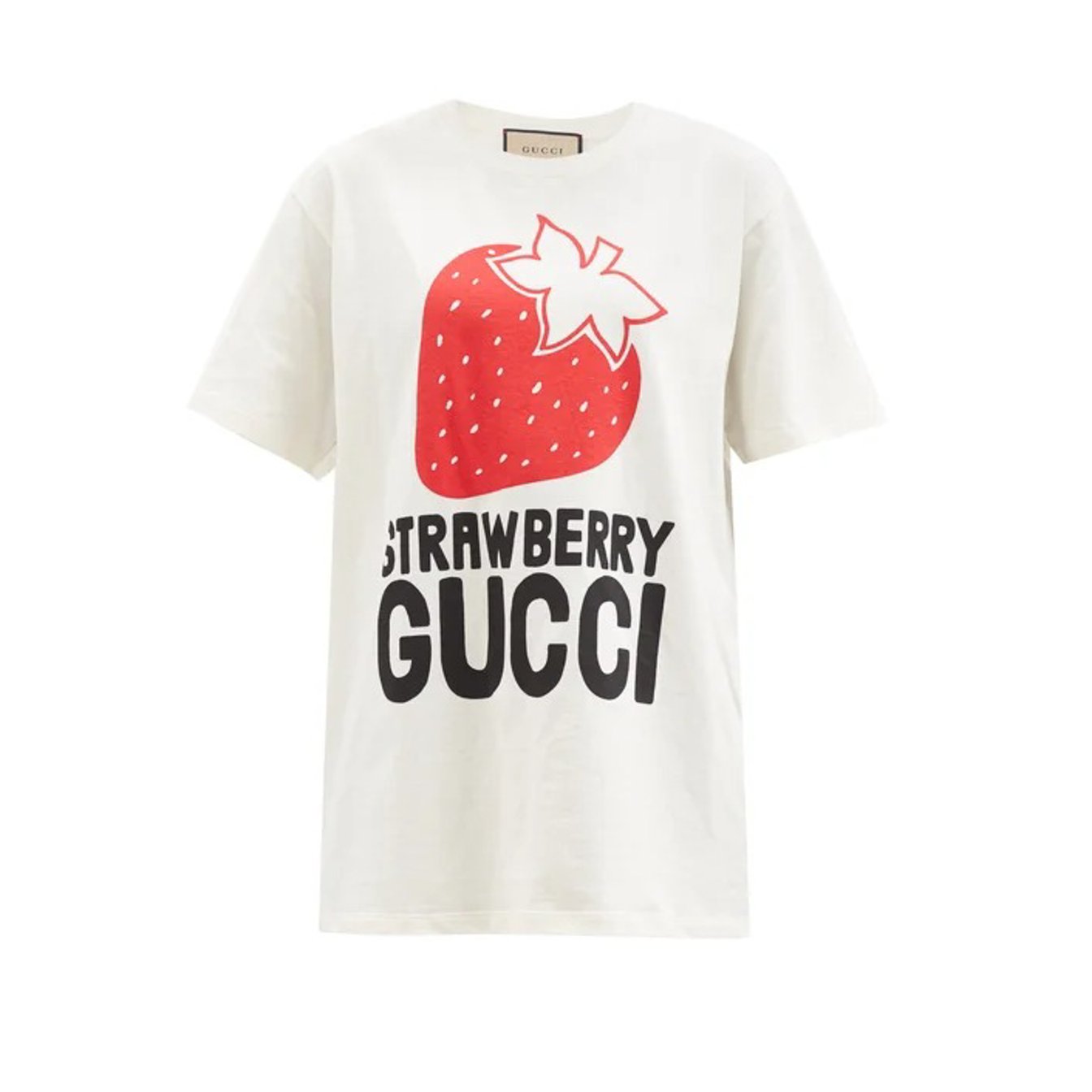 まず最初にご紹介するのは、大きなストロベリーとロゴがパッチされた「グッチ(GUCCI)」のTシャツ。インパクトのあるデザインが、気分の上がる夏にぴったりなアイテムです。ビッグなシルエットなので、ワンピース風に楽しんでも◎。