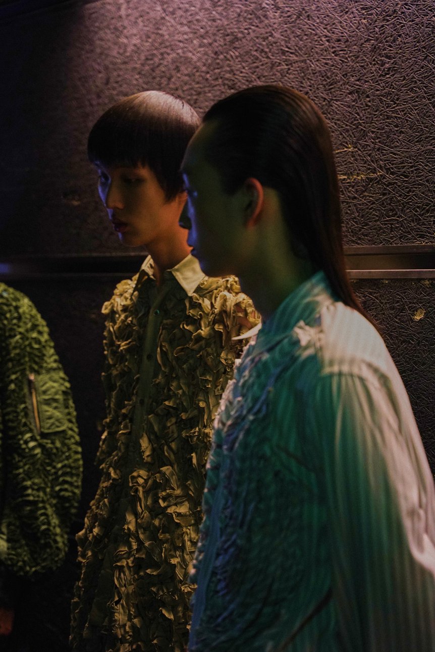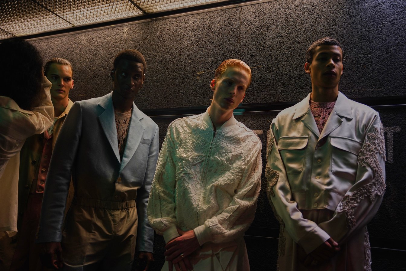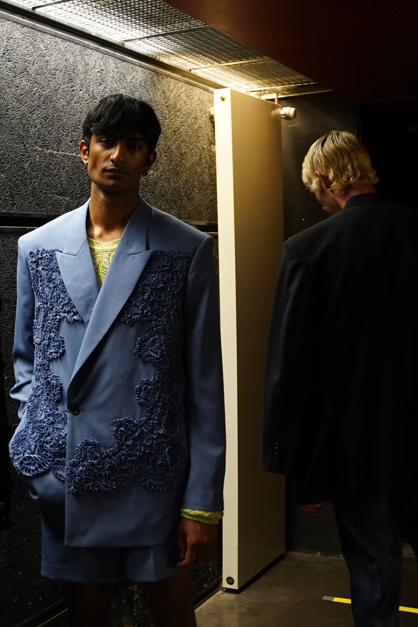 森川にとって、素材は服作りの根本であり、「カルチャーでもある」ともいう。ただし、テキスタイルの複雑さを誇示しようともせず、ことに今季は、より繊細にセットアップを解体し、装いの探求も冴えている。たっぷりの分量でドレッシーな印象もあるトラウザーズ、ドレスシャツ、カッティングが映えるブルゾンと素材にふさわしいアイテムを厳選し、ブランドを象徴もする異なるふたつの生地がグラデーションのように織りで切り替わるMA-1や、デニム、うだるような暑さにぴったりなショーツ、ややフォーマルなジャケットからタキシードまで、色とスタイルはメンズウェアのワードローブにしたがって幅広くも端的だった。時に刺繍をフレームのように装飾したり、肌がのぞく着こなしを差し込んで爽やかに調合し、かえって、洋服の細部の再発見を促してくる。