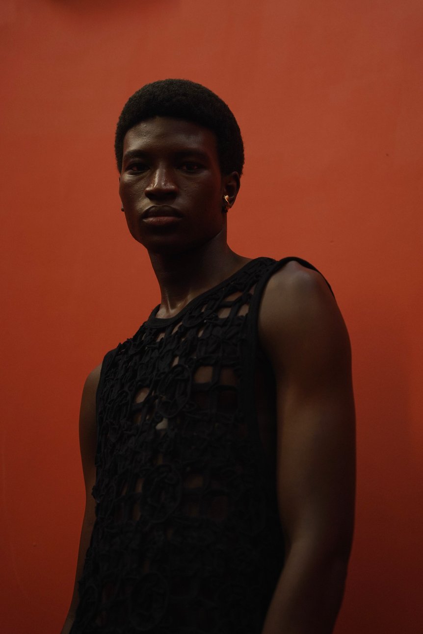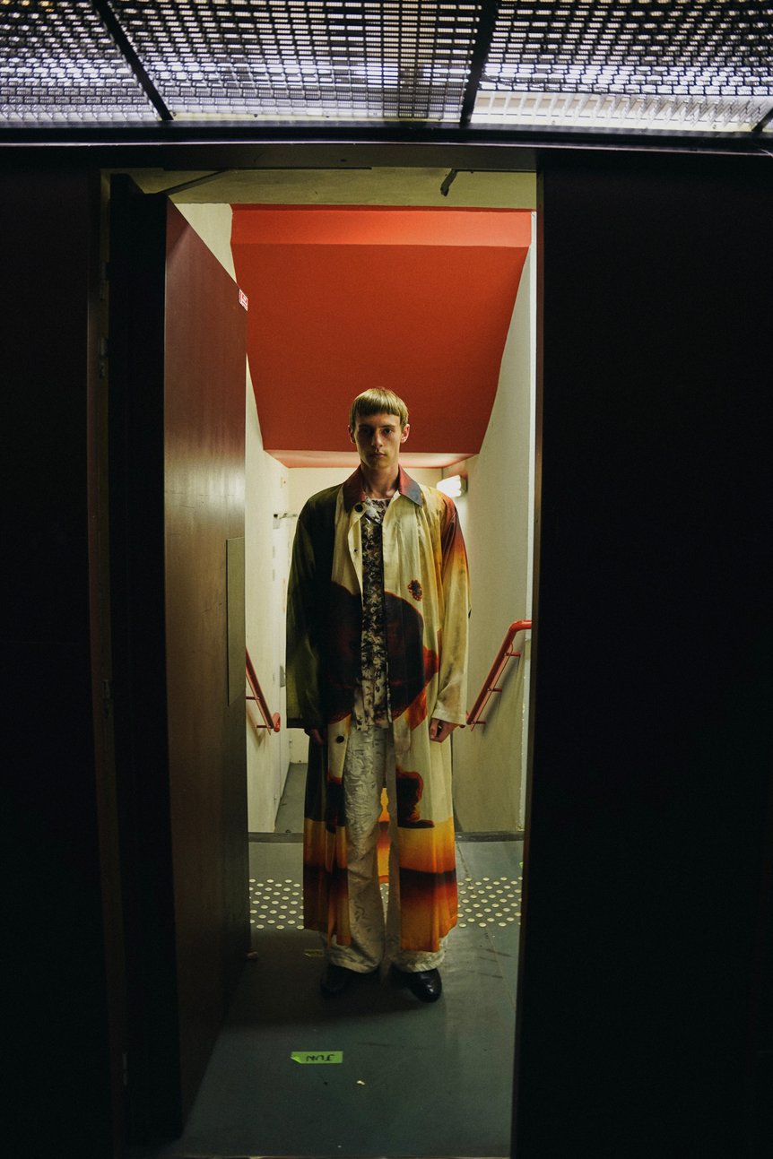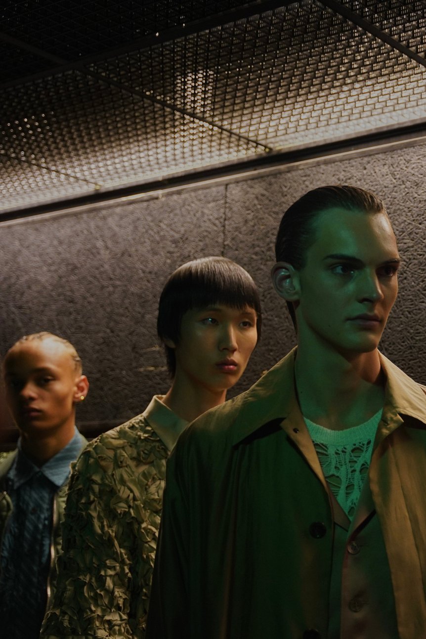 森川にとって、素材は服作りの根本であり、「カルチャーでもある」ともいう。ただし、テキスタイルの複雑さを誇示しようともせず、ことに今季は、より繊細にセットアップを解体し、装いの探求も冴えている。たっぷりの分量でドレッシーな印象もあるトラウザーズ、ドレスシャツ、カッティングが映えるブルゾンと素材にふさわしいアイテムを厳選し、ブランドを象徴もする異なるふたつの生地がグラデーションのように織りで切り替わるMA-1や、デニム、うだるような暑さにぴったりなショーツ、ややフォーマルなジャケットからタキシードまで、色とスタイルはメンズウェアのワードローブにしたがって幅広くも端的だった。時に刺繍をフレームのように装飾したり、肌がのぞく着こなしを差し込んで爽やかに調合し、かえって、洋服の細部の再発見を促してくる。