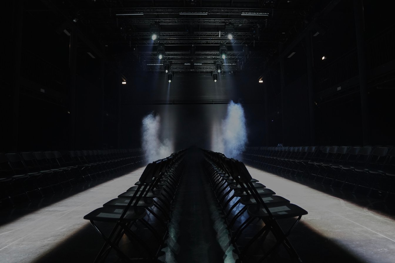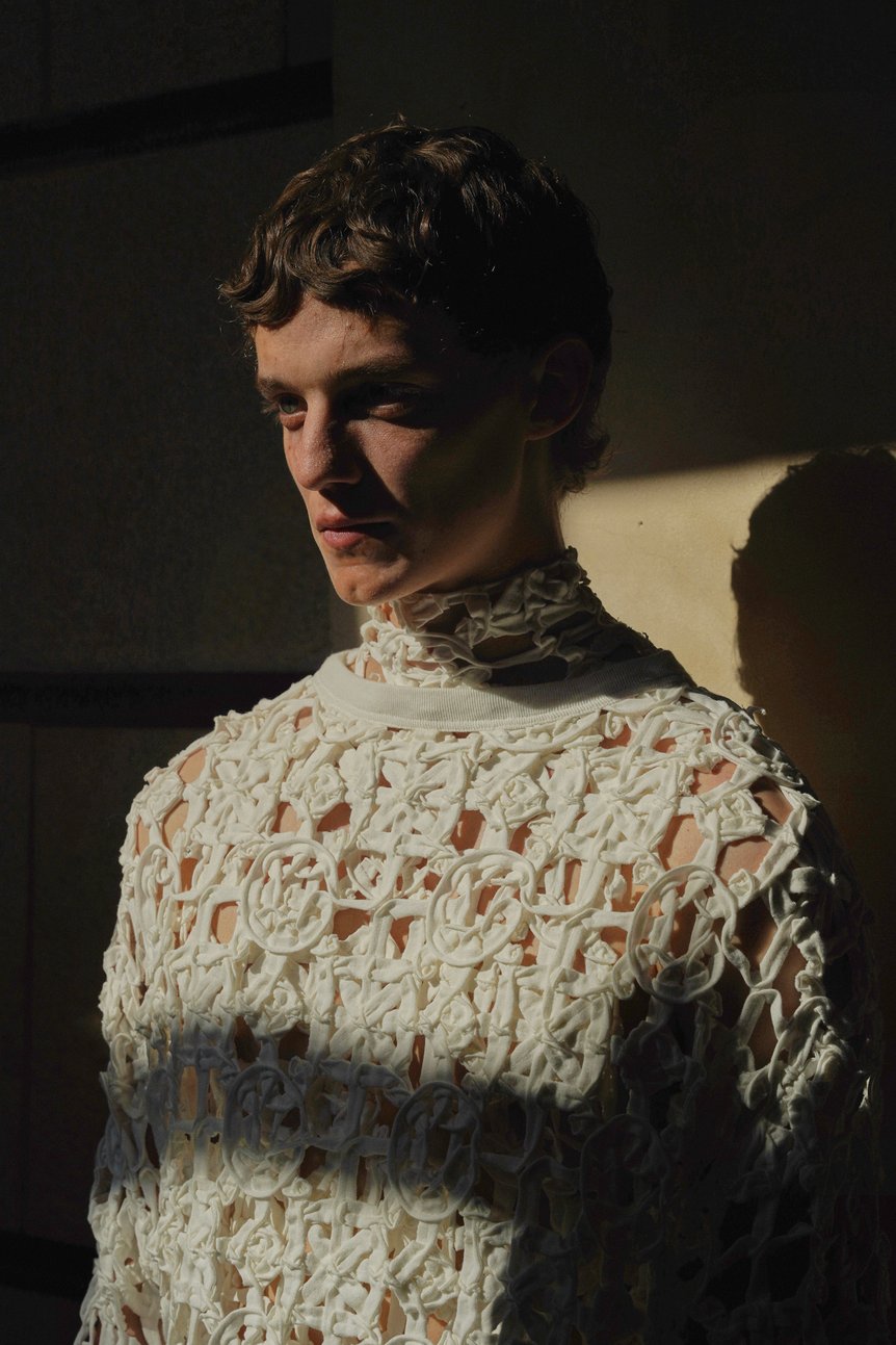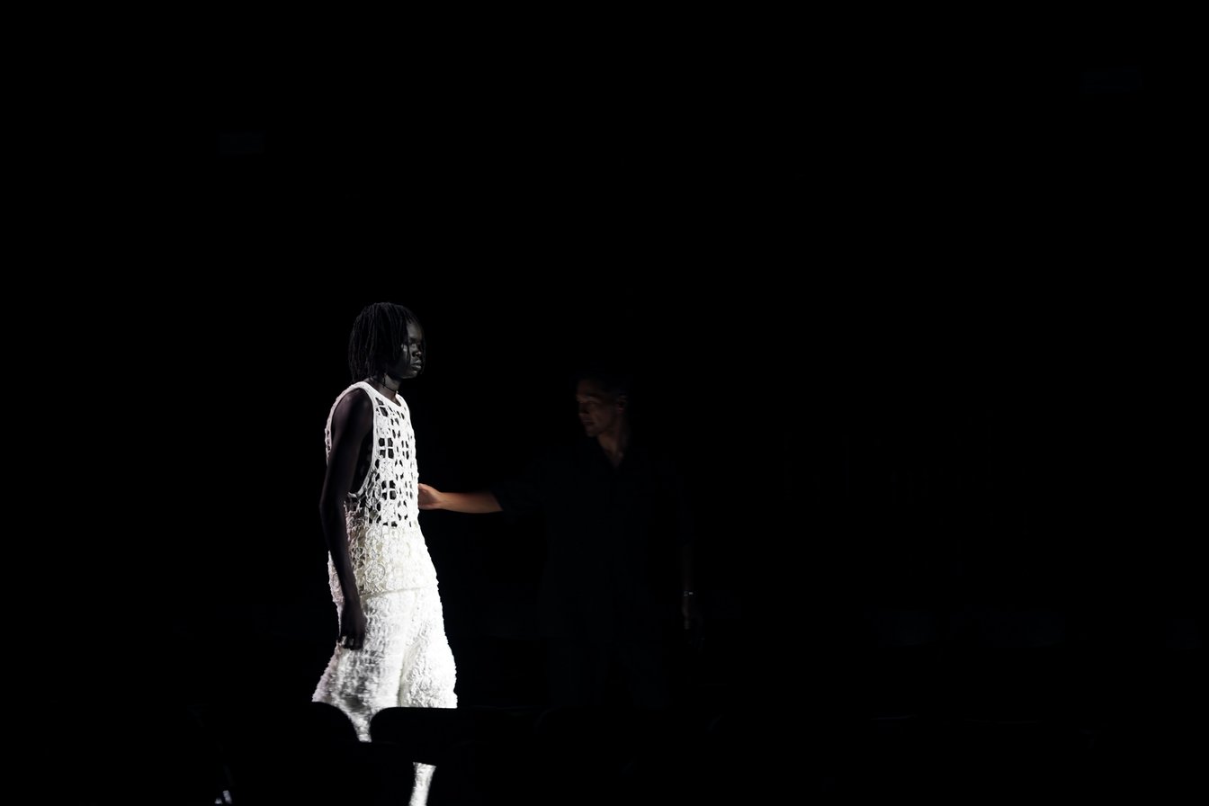 会場は、階段を降りた先に広がる真っ黒な屋内空間だった。その暗がりゆえに映えた純白のオープニングルックは、格子柄あるいは幾何学柄のクロシェ編みのようなコットンレーストップスに、波打つような刺繍が全面を覆うワイドパンツ。酷暑のパリをいっとき忘れることができるほど、飄々として潔い。立体的な刺繍、具象的なジャカードやプリント、空気を巻き取るワイドパンツが軽やかさをまとうショーは、ホワイトに始まり、多彩なテキスタイルが登場しながら独自に抽出した明るげなカラートーンに移行していった。