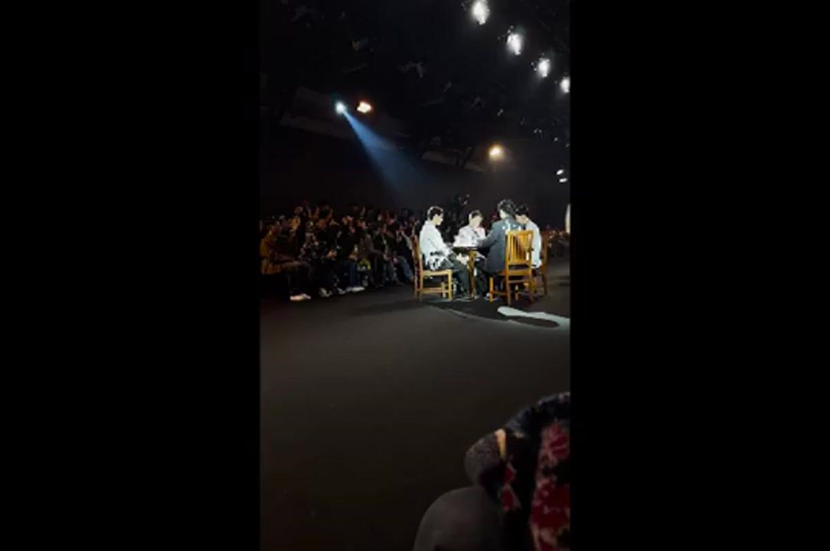 中央の麻雀卓で麻雀を打つ女性はデザイナーの母親だという。 Video by FASHIONSNAP